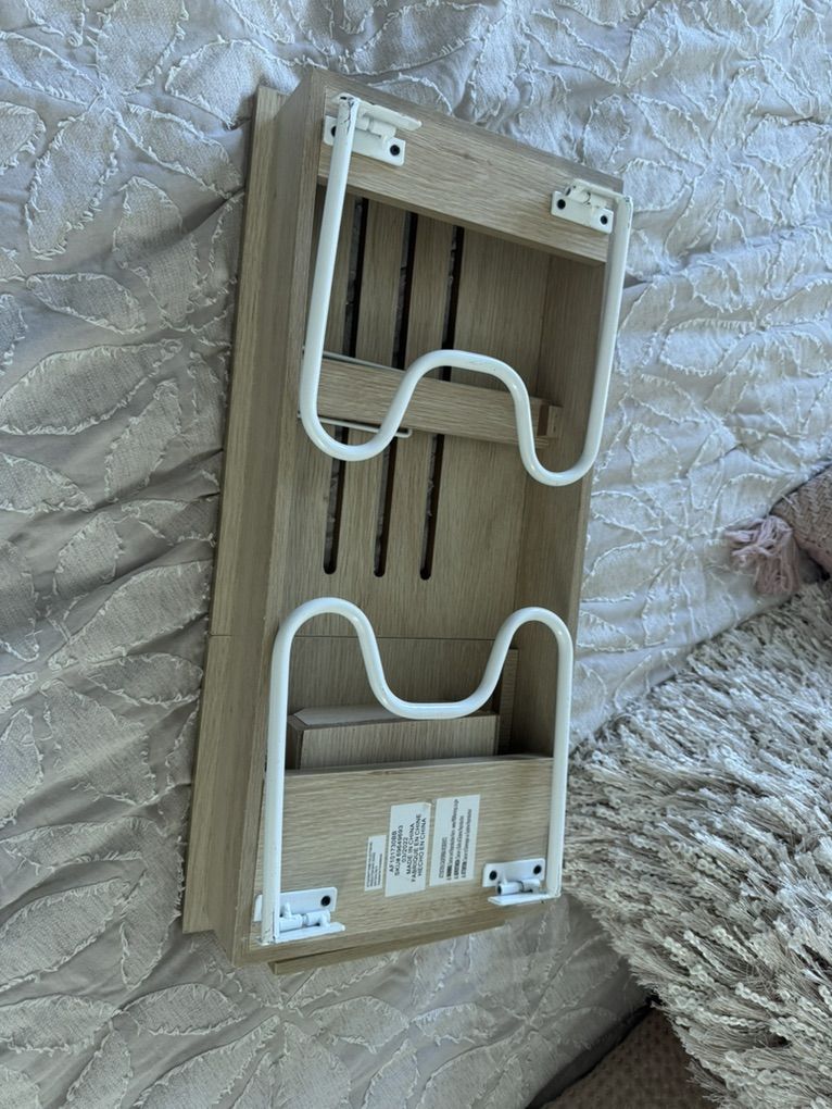 Neutral wood tone with white metal legs. Folds flat for easy storage.