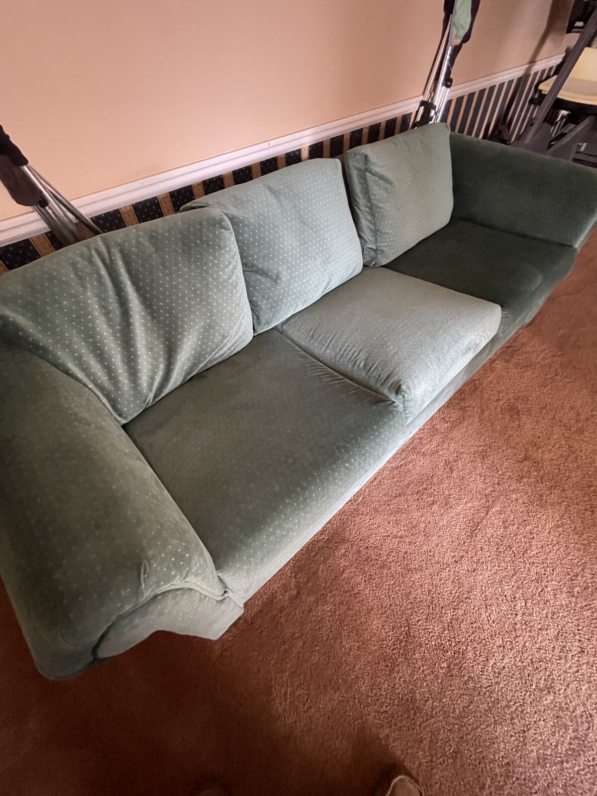 Sofa is a different color of green with light flecks. The size is L91" x W35" x H26". It's not used very much anymore and need the space. Please message me if interested. I don't deliver so you will need to make the necessary arrangements to pick it up.