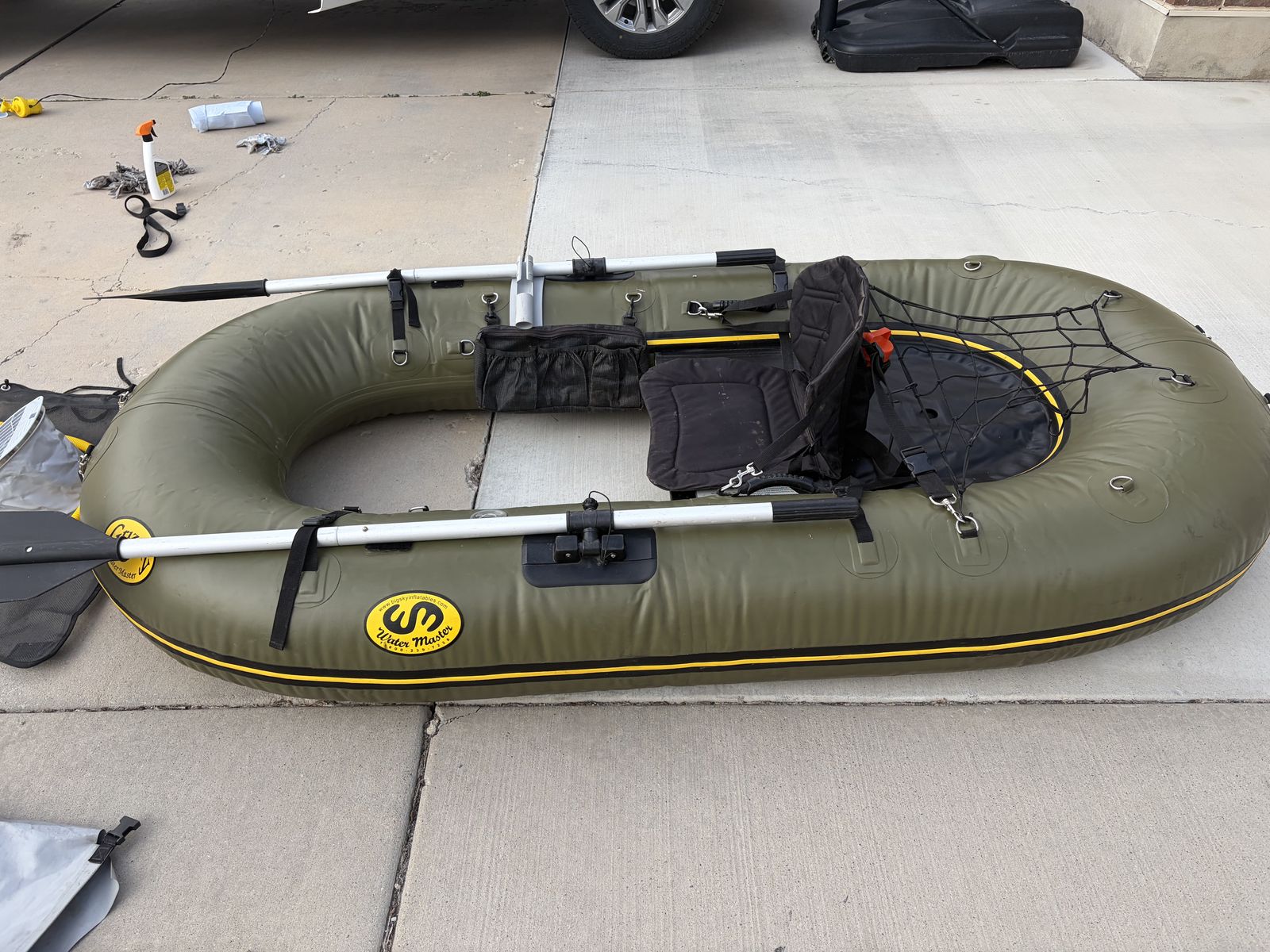 VenmoWatermaster Grizzly, lightly used. Watermaster, Big Sky Inflatables, from Montana, has been the gold standard of personal fishing, frameless watercraft for decades. Bombproof PVC construction, ability to use with fins, oars, or both at once, roll the entire craft, and place all the accessories into one large packable dry bag, make The Watermaster one of the most versatile and reliable fishing craft available. This boat is lightly used, about 5-years old, comes with many upgrades including, side storage pouch, rear cargo net, fins, stripping apron, upgraded carry handles, pump, dry bag, backpack, repair kit, oars. Access fishing water that no larger rafts, hardside boats, or many wade fishermen can access with this craft. You can put this boat on your back, hike upriver or into lakes, unroll it out of the pack, inflate it, and have a COMMERCIAL GRADE, pvc raft to float downriver in. I’m 220lbs, and have floated many rivers in the west with gear on the storage platform behind the rowers seat, with confidence. Base price new for these is $1895. Selling for $1200. Cash, Venmo, local pickup around Salt Lake preferred. Shipping would have to be calculated.