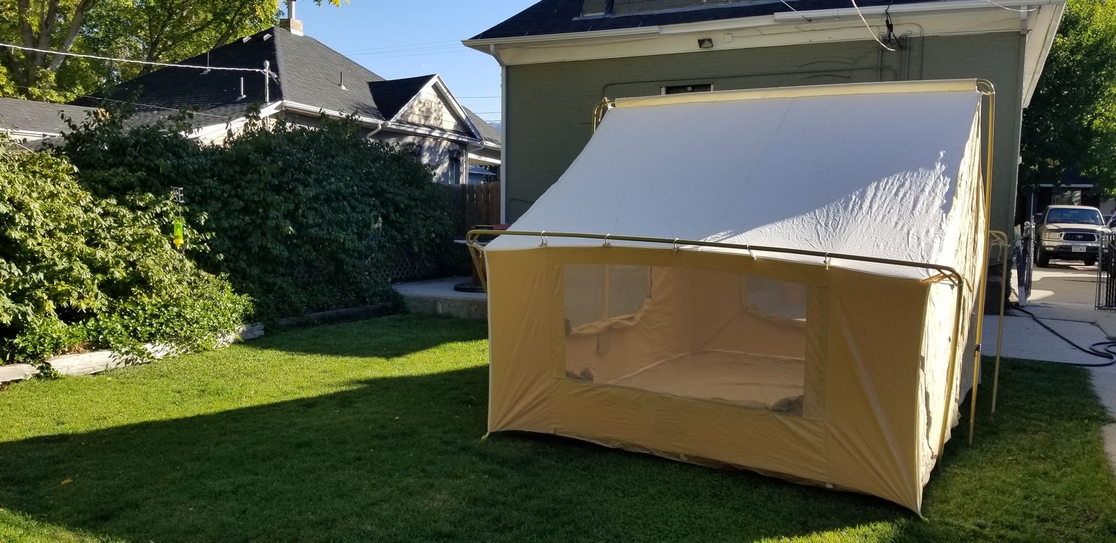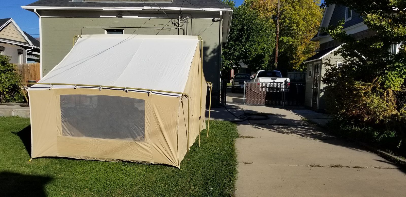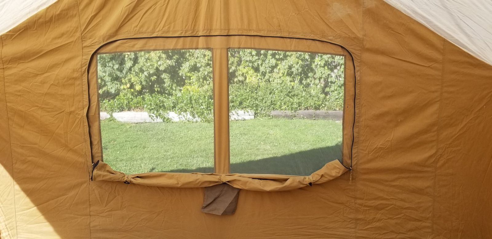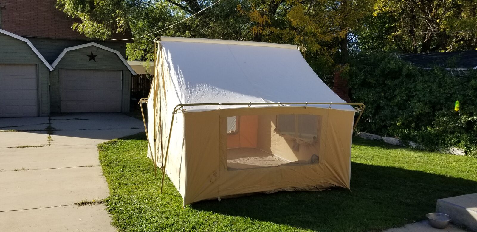 I bought this canvas wall tent brand-new about 10 years ago and have used it 3 times. When not in use, it has been stored indoors, out of the elements, and is therefore still in new condition. Dimensions are 11.5’ wide x 8.5’ deep x 8’ tall in the center. TREX TENTS sells this same tent for $879. Add taxes and shipping and you’re looking at about $1000.