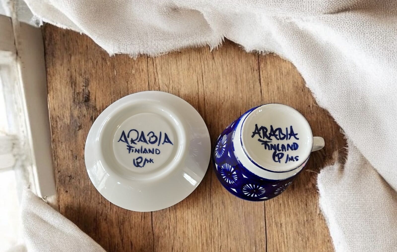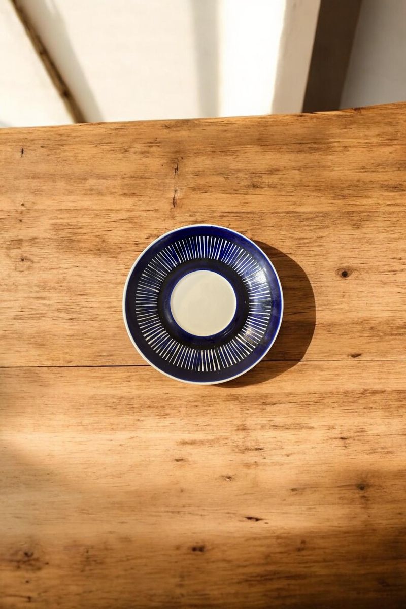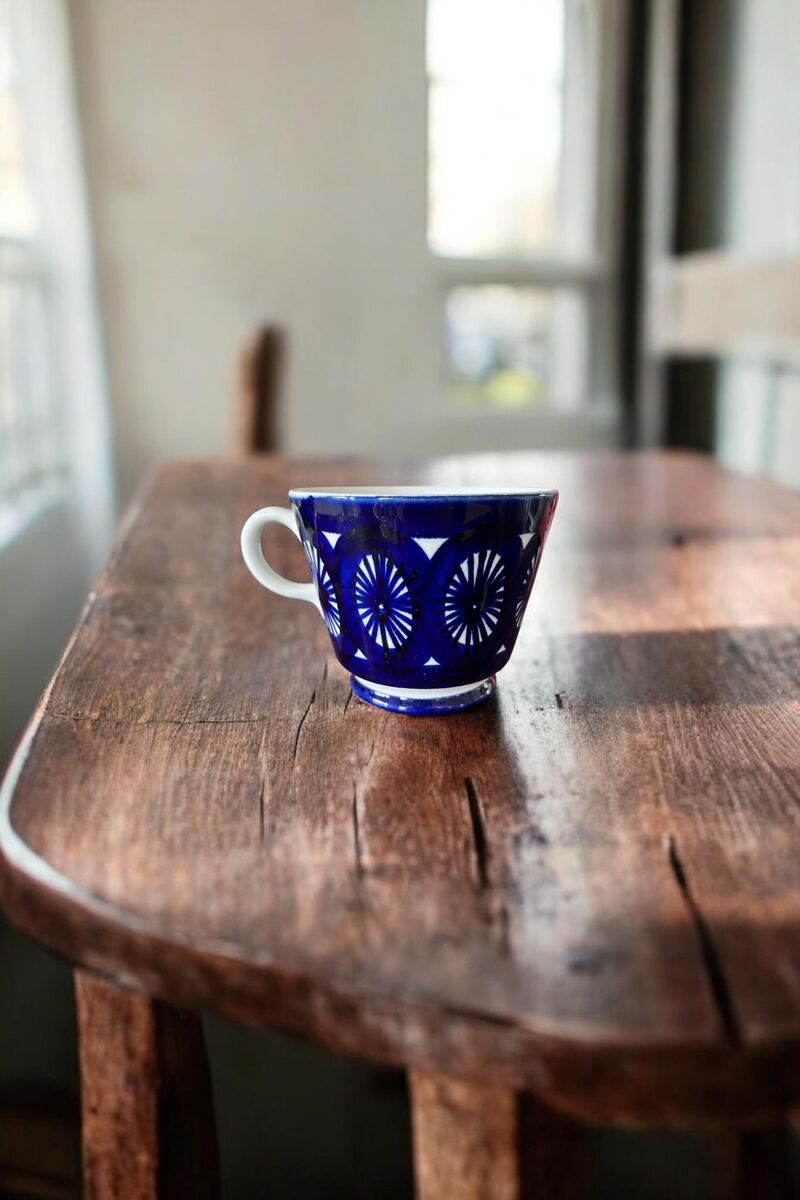 This beautiful vintage cup and saucer set was crafted by Arabia Finland and designed by the renowned Ulla Procopé. Featuring a rich cobalt blue and white hand-painted pattern, this piece was produced between 1964 and 1971 and is highly sought after by collectors.