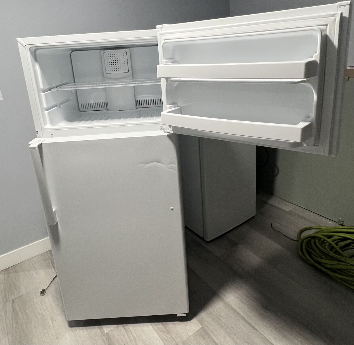 Zelle16 Cu ft GE Freezer. No issues at all. Works well. No odors or stains. Automatic defrost. Dimensions Height 64.75’” x width 28” x depth 32.6”. A $100. 801-336-7039