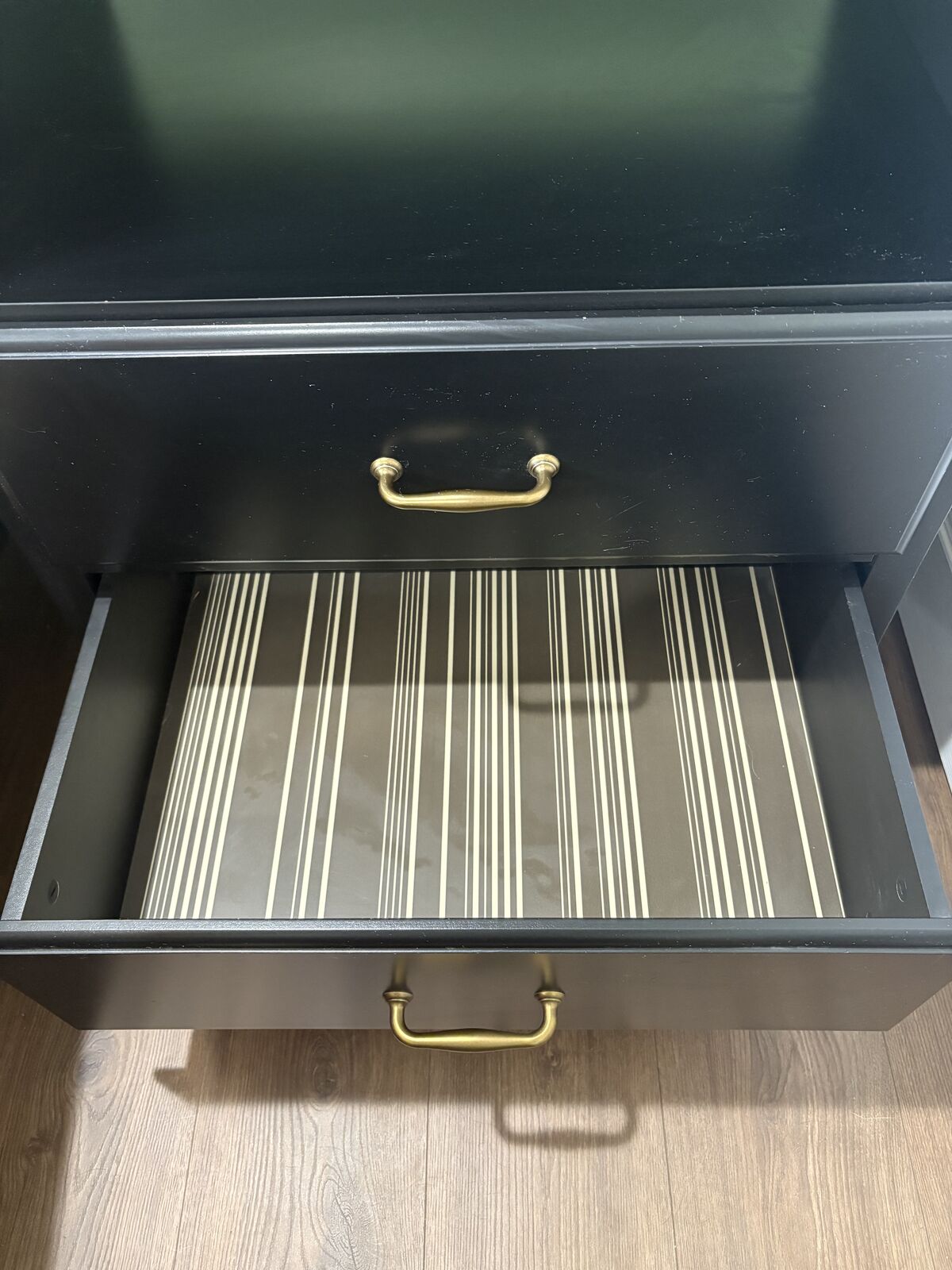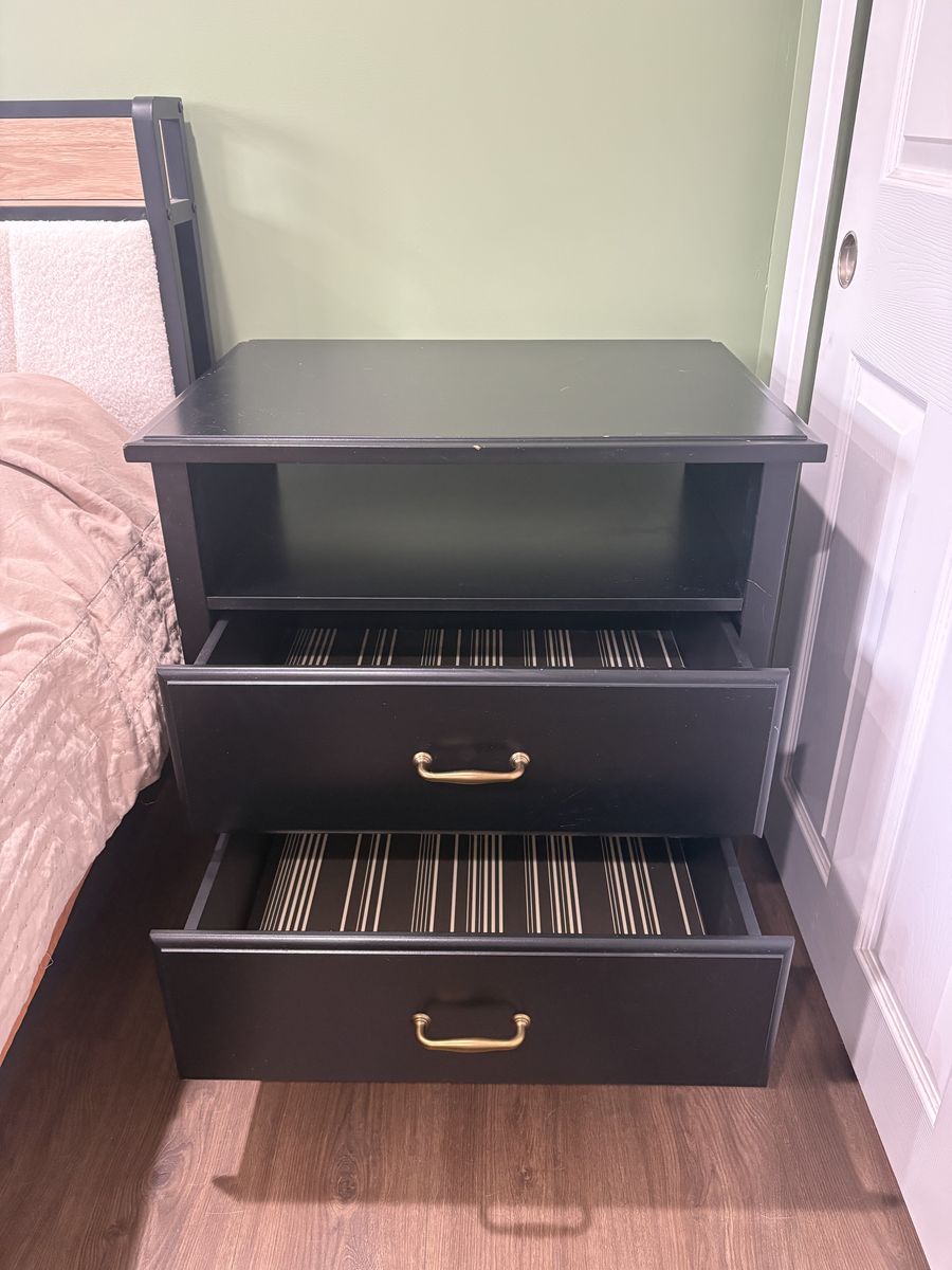 VenmoBlack nightstand. Minor dings and scrapes. Brass handles. Dimensions are 26.5” W 29.5 “ H 19.25 “ D. Drawer dimensions are 20.5” x 15” x 5.5 “.