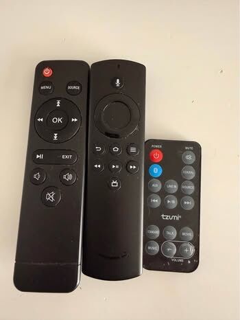 The remote for the firestick might need new batteries, however, I just use the “fire tv” app and use my phone as the remote. There are 3 remotes total - one for the projector, one for the fire stick and one for the sound bar. Sound bar connects via bluetooth. Happy to answer any questions!