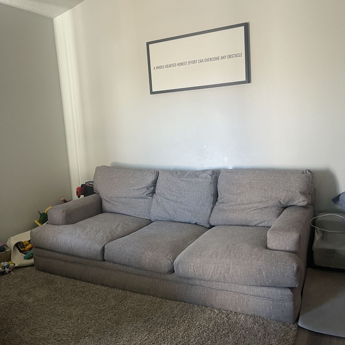 Grey cloud sofa. In amazing condition and soo comfy! Heavy and well made. Cushions can be taken out and covers can be washed. I do live in a condo, so you would need to carry it down. I cannot help I am pregnant.