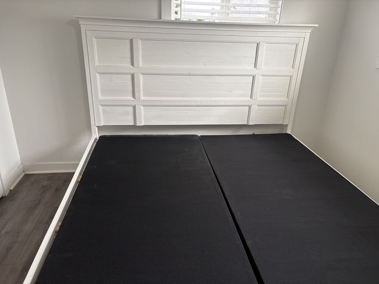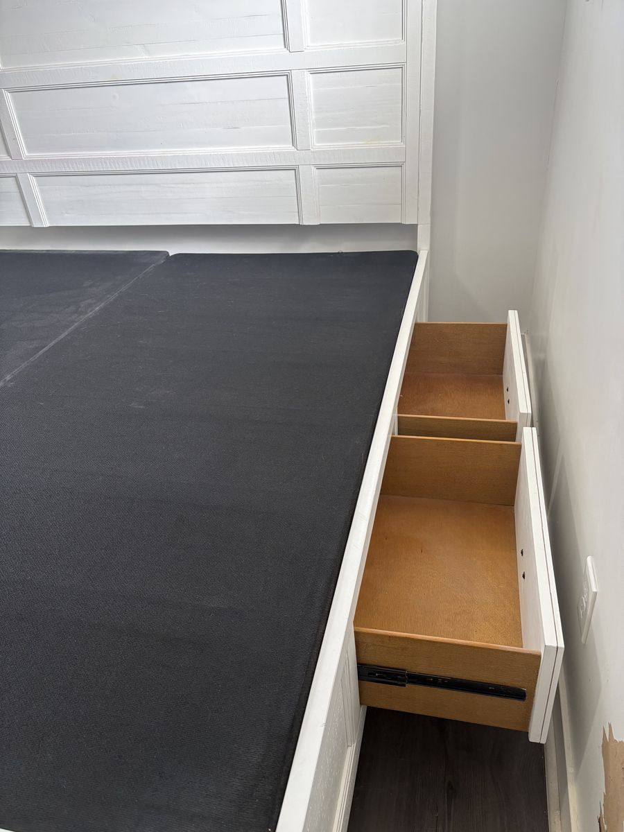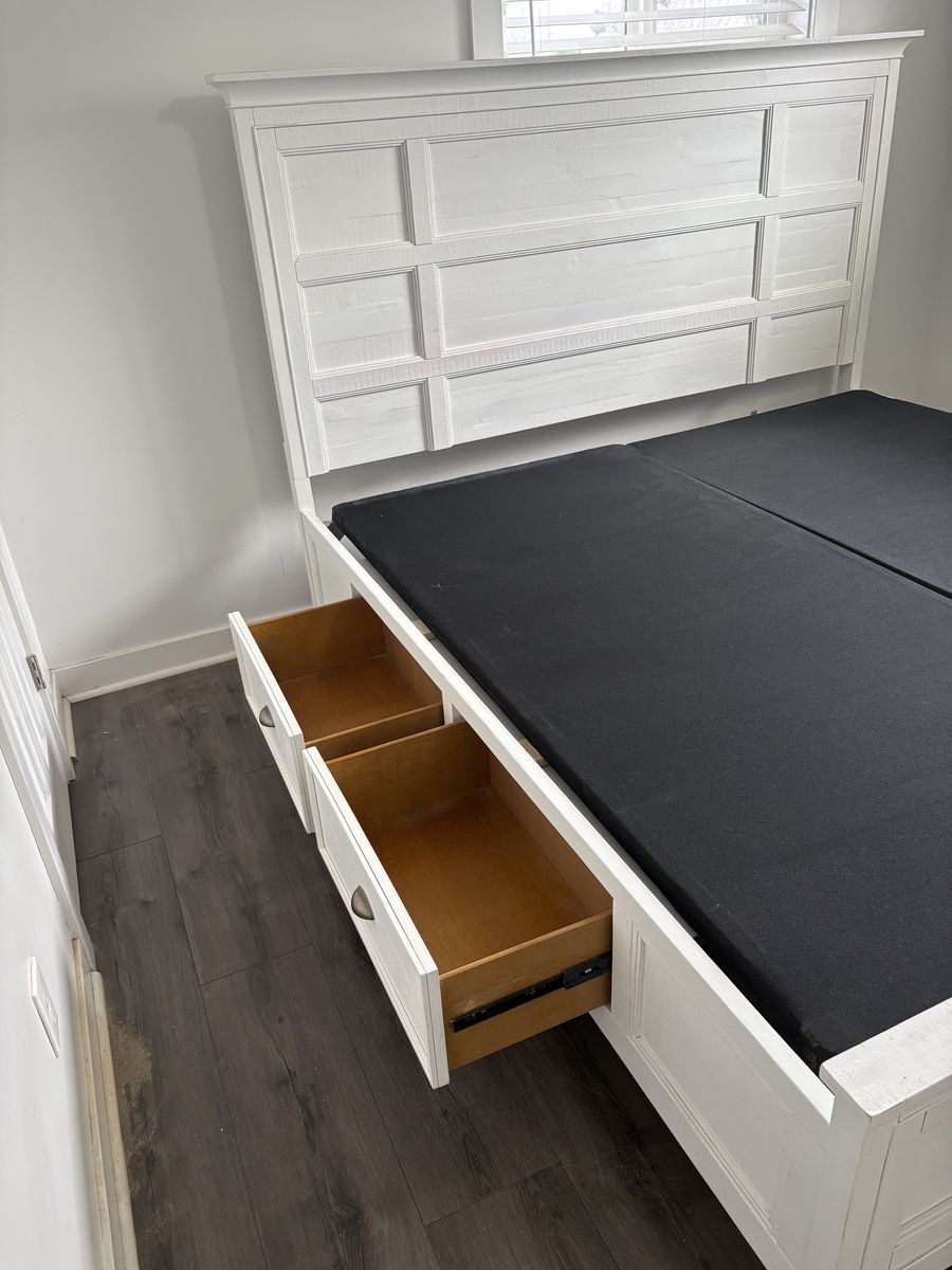 VenmoWhite king sized bed frame with storage drawers. Little wear and damage. Dimensions are 81.5 “ W 87” L headboard is 60” H and bed is 30” H. Drawers are 21”x13”x7”.