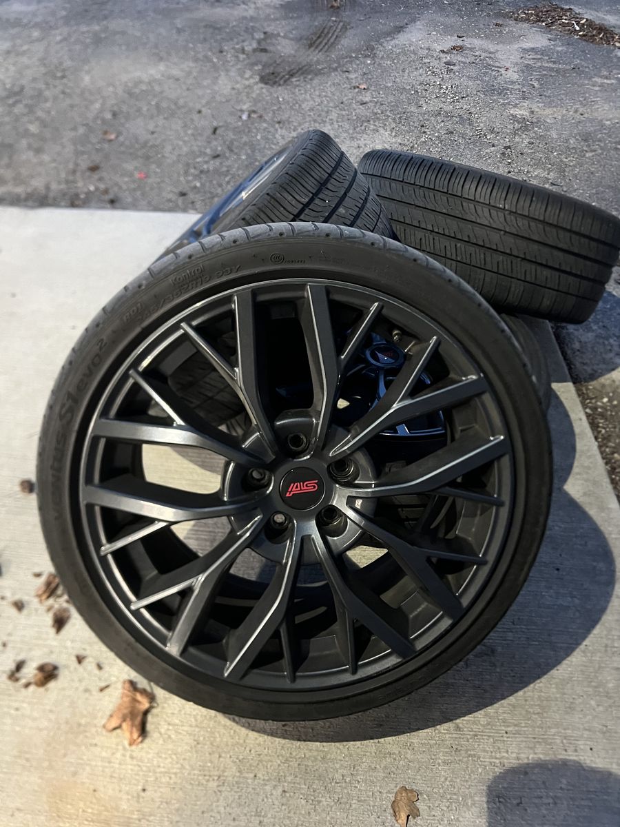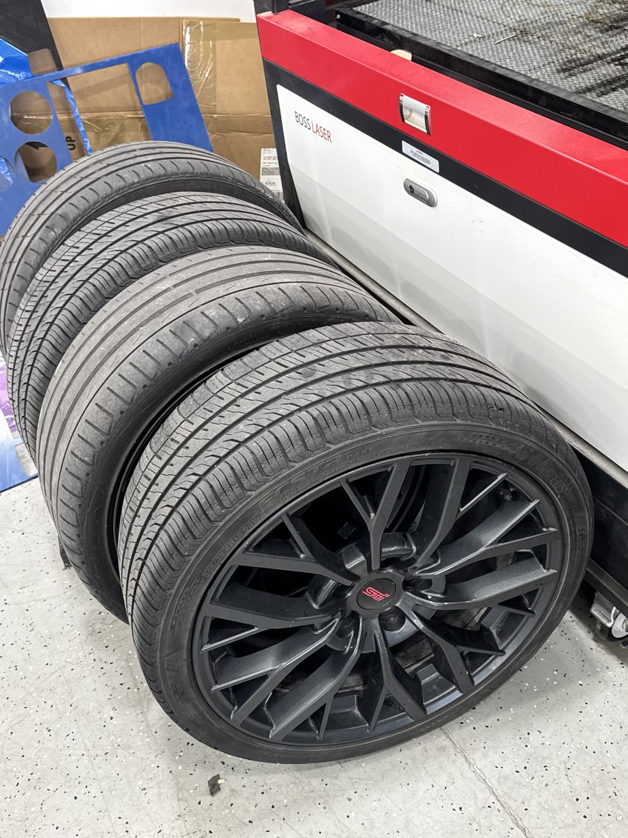 Venmo5x114.3 19x8.5 size, +55 offset I have some stock 19” STI take offs with tires , 2 tire will need to be replaced soon the other still have life