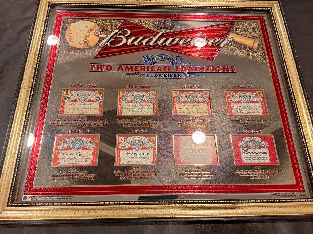 Two American traditions Baseball and Budweiser mirror. 26.5 in x 22.5 in. Willing to Trade for guitar Stuff. Great for a "Man cave" 200.00 obo. (2007) mirror.
