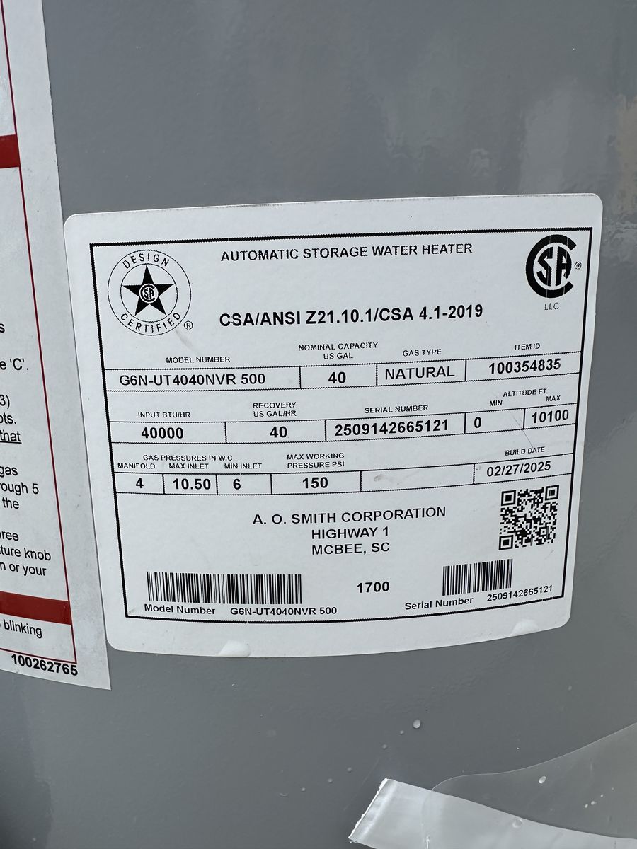 Venmo1 year old 40 gallon water heater. No problems. We have 2 and our other water heater(not this one) went out and we decided to just switch to a tankless. Build date 2/27/25