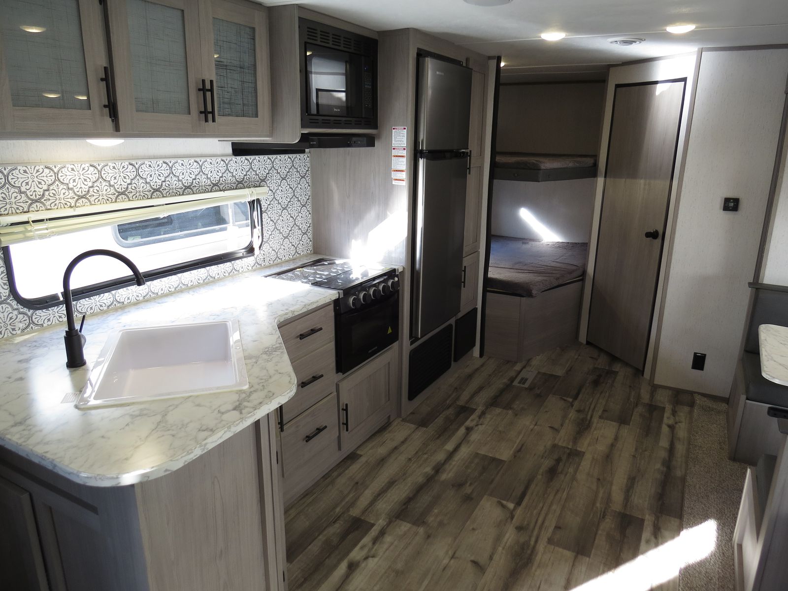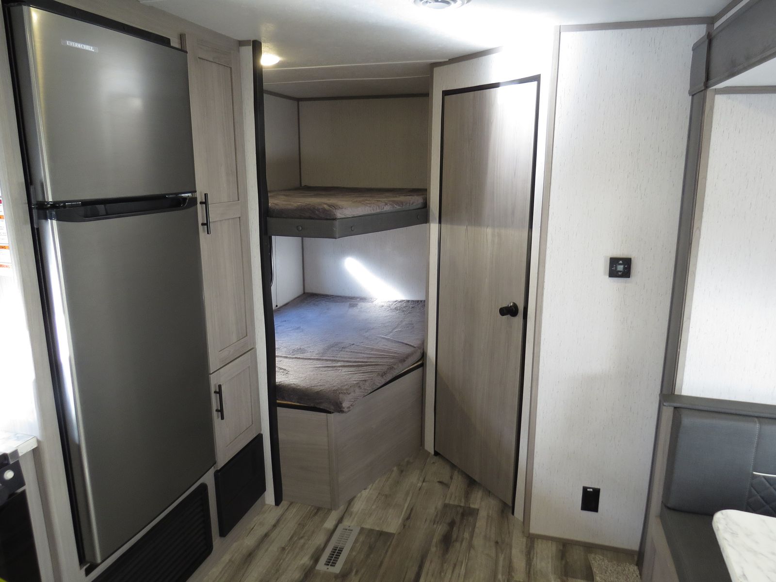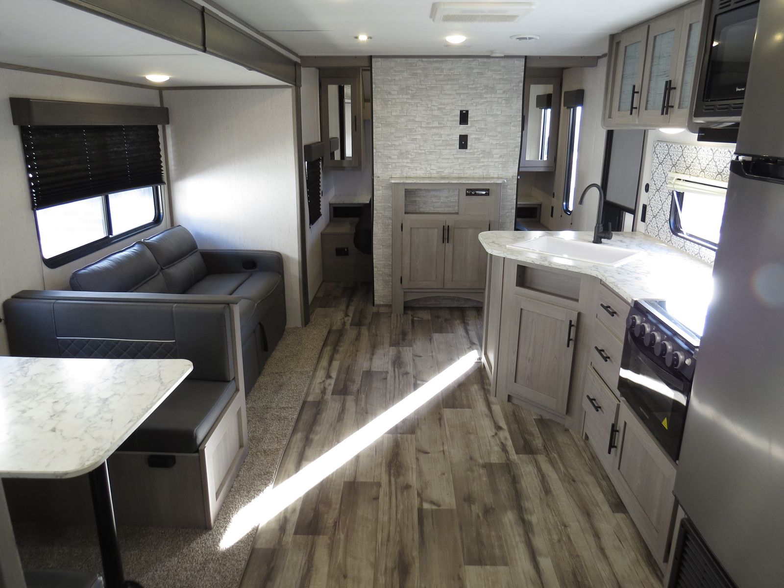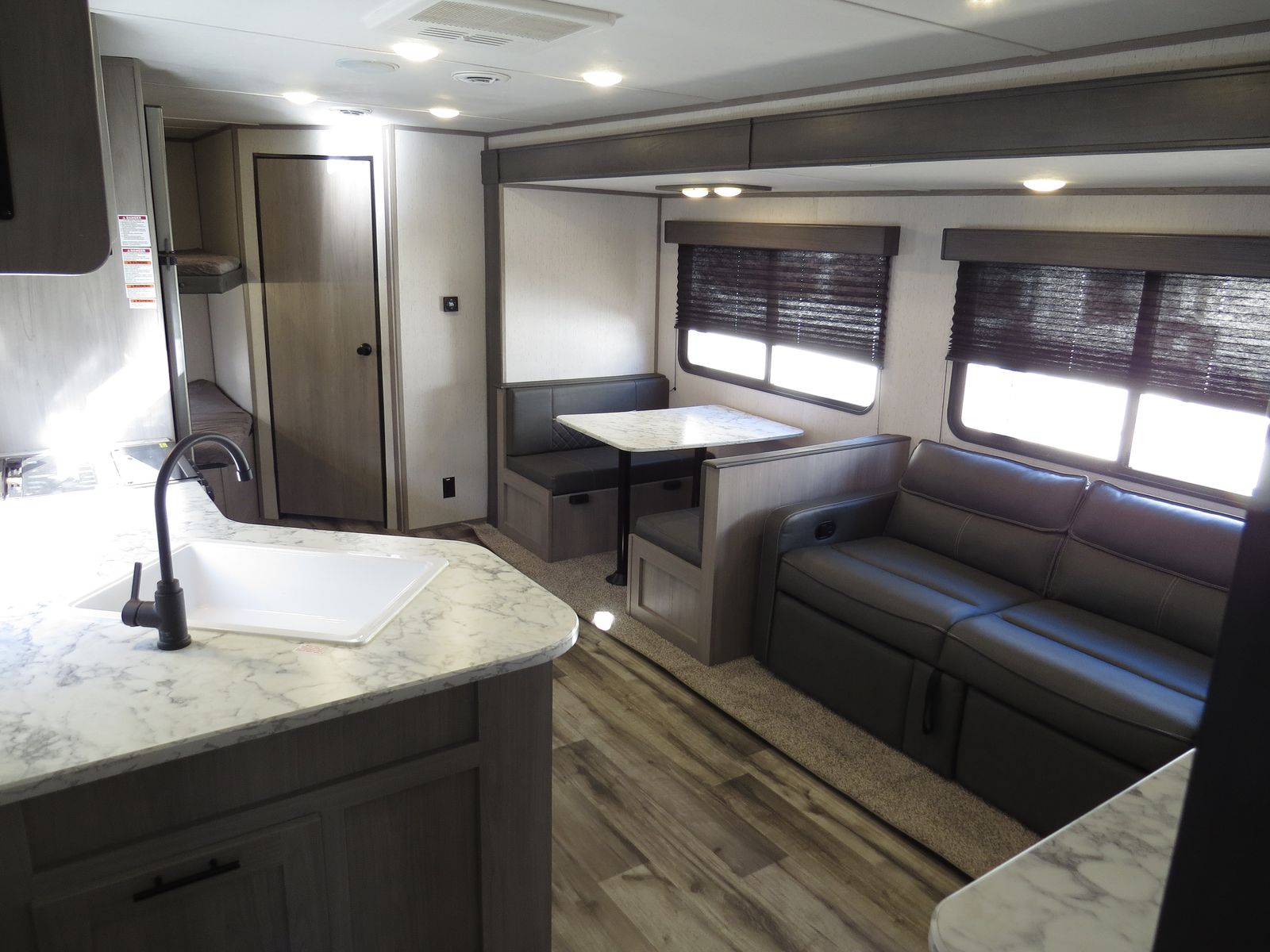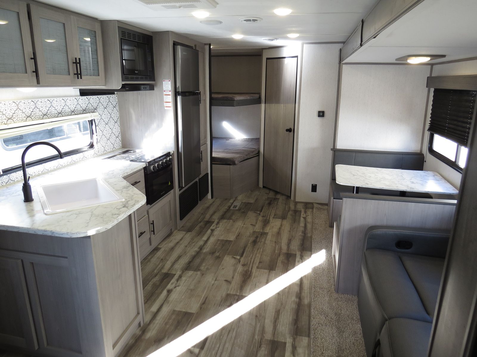 2 Big Rear Bunks, Booth Dinette & Couch Slide, Front Queen bed!, Lots of storage! Side Kitchen, Corner Bathroom, Booth Dinette & Couch Make down to beds, A/C unit and Heat.