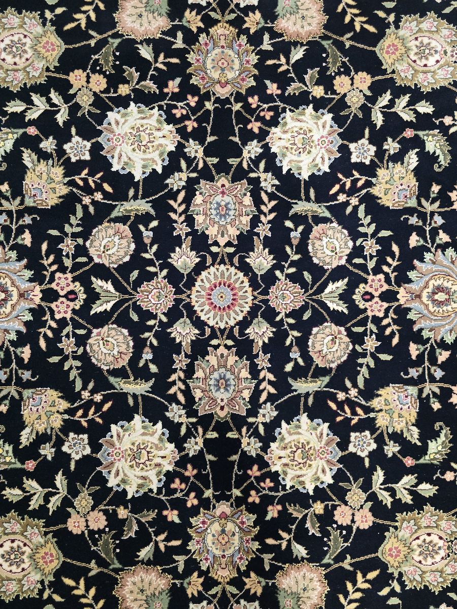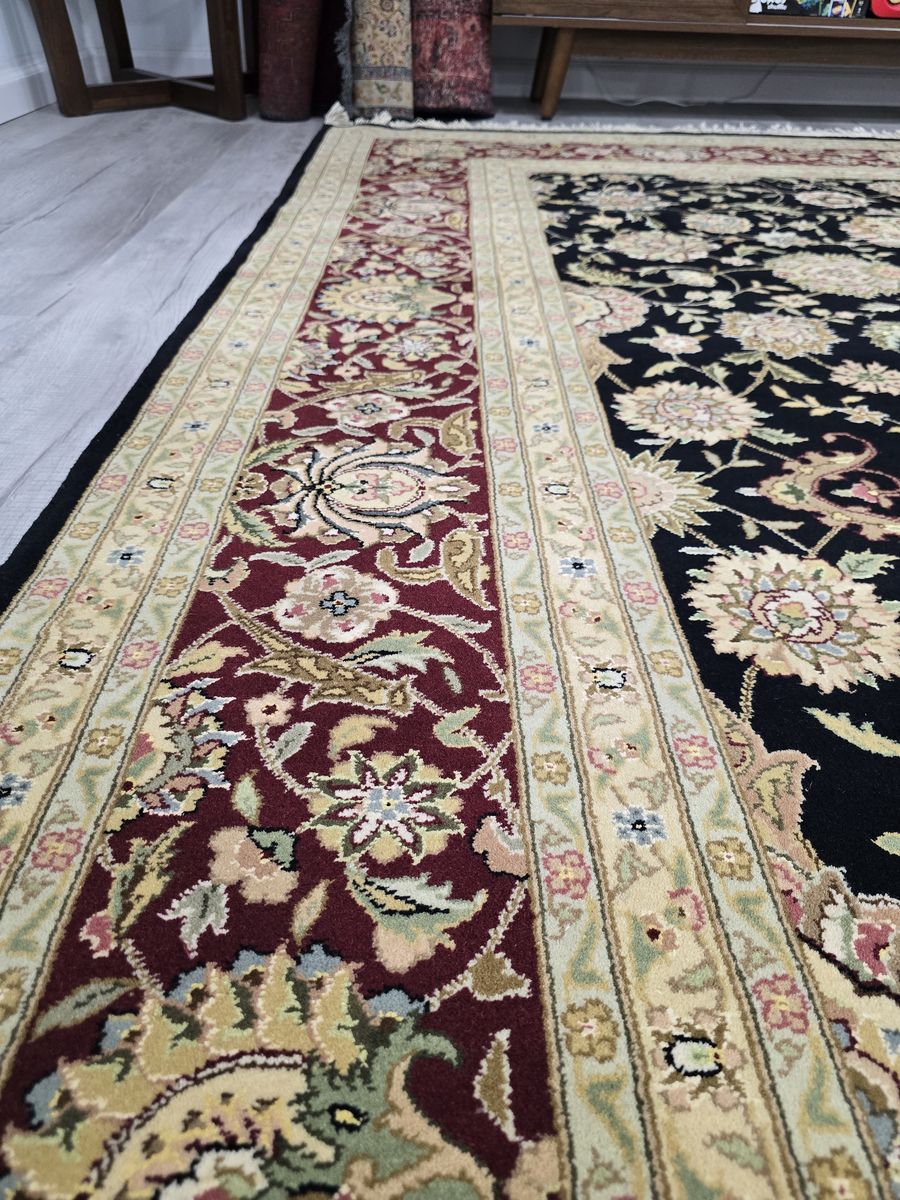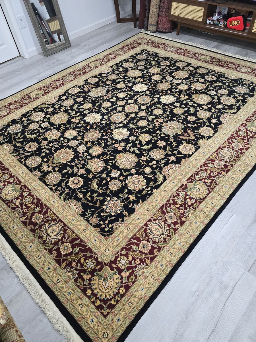 VenmoNicely done Persian style rug with a rich black field filled with an elegant all-over floral pattern in ivory, light green, blush, tan, and muted sky blue tones. This is a traditional and timeless Persian-inspired design. The craftsmanship shows in the fine detailing, making it feel luxurious. It’s perfect for traditional spaces or European-inspired interiors, but can also fit modern spaces with the right pairing of decor. Additionally, the burgundy border ties nicely with rich leathers, mahogany, or brass accents.