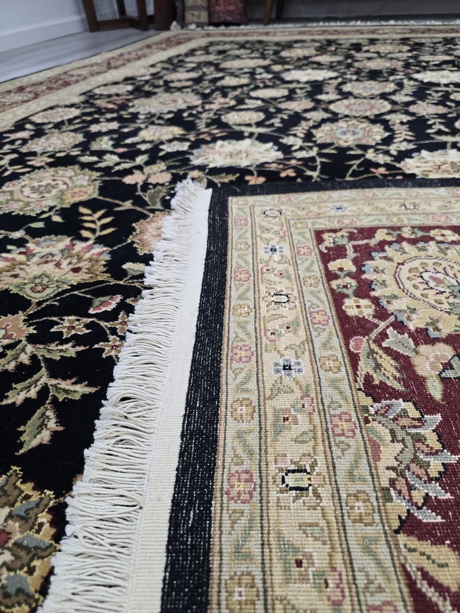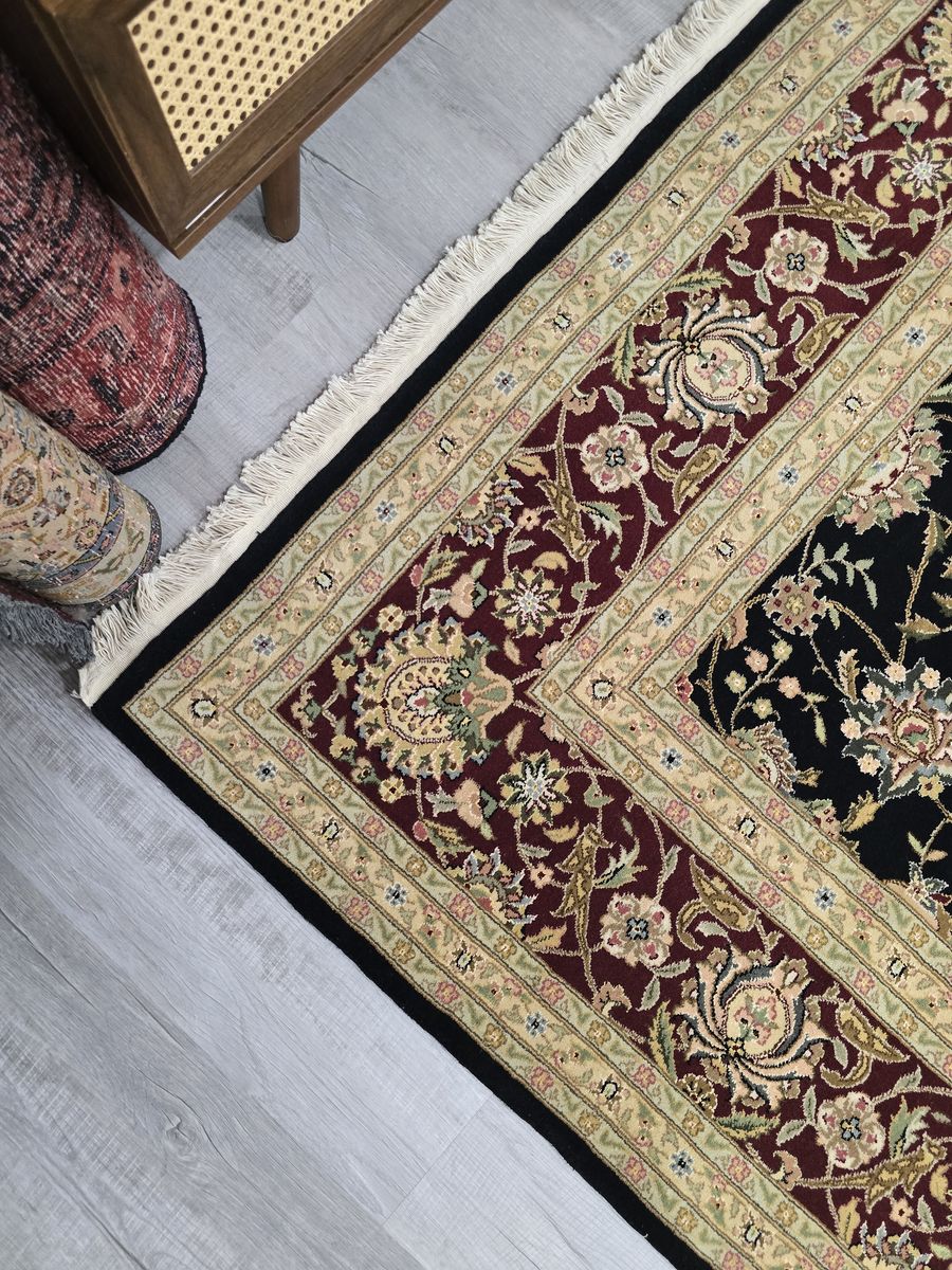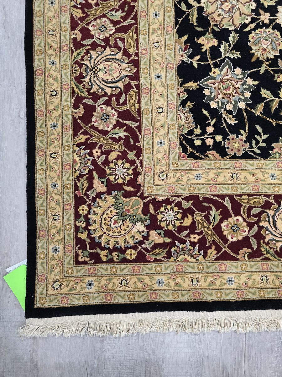 VenmoNicely done Persian style rug with a rich black field filled with an elegant all-over floral pattern in ivory, light green, blush, tan, and muted sky blue tones. This is a traditional and timeless Persian-inspired design. The craftsmanship shows in the fine detailing, making it feel luxurious. It’s perfect for traditional spaces or European-inspired interiors, but can also fit modern spaces with the right pairing of decor. Additionally, the burgundy border ties nicely with rich leathers, mahogany, or brass accents.