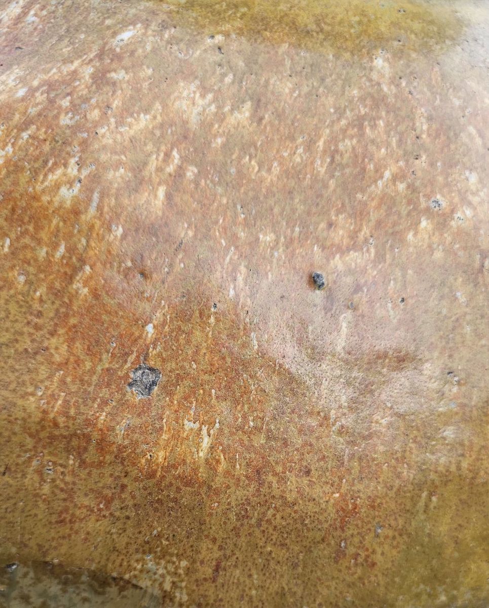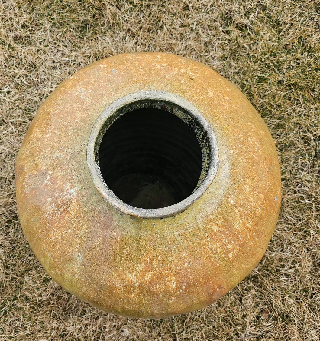 VenmoThis is a beautiful Vintage glazed pottery vase. 27"Tand 20" Wide. The hole is 7.5" Wide. No Cracks but little dents here and there( photo).