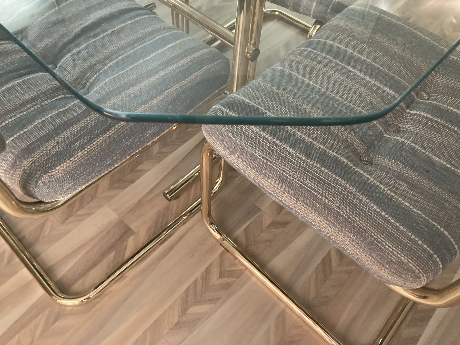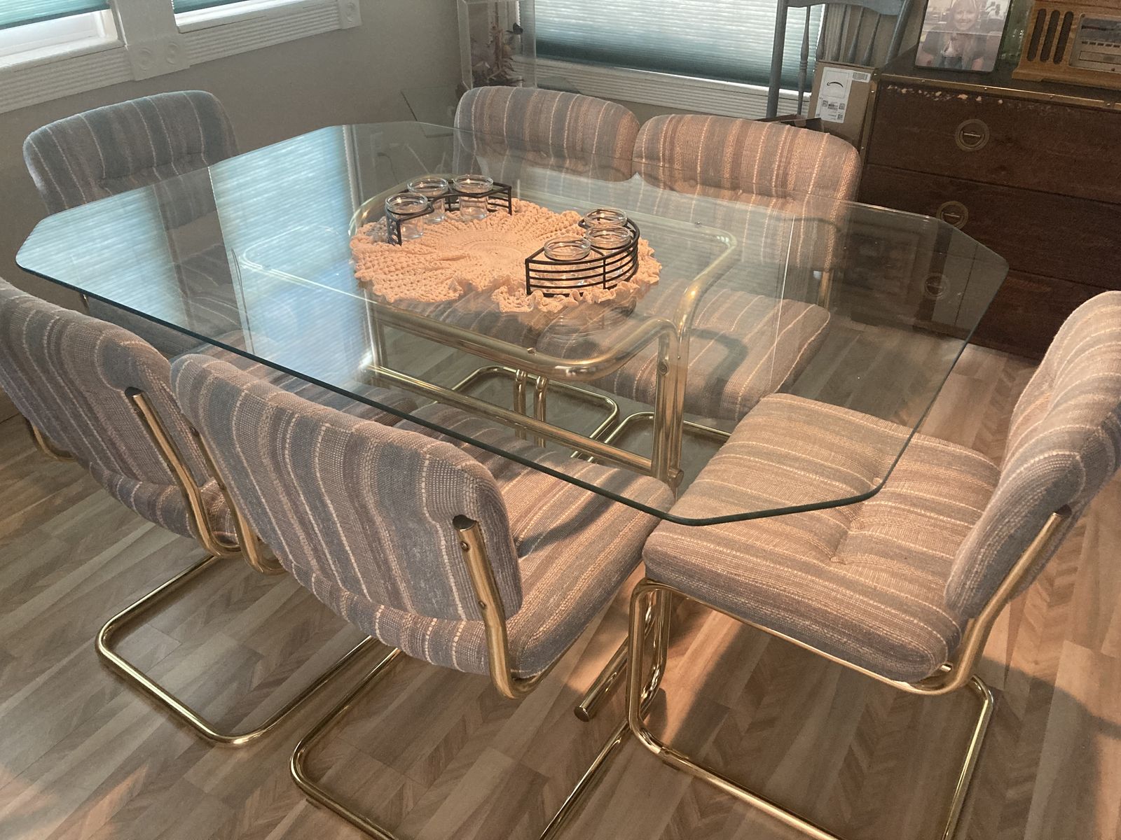 EXCELLENT Great shape dinning room table and 6 chairs. No scratches on table top and no soiled on chairs or tears. Beautiful set for dinning. There is room for 4 more chairs if needed. Class top is 1/2 thick, size 5 FT x 40 inches. Looks like brand new.