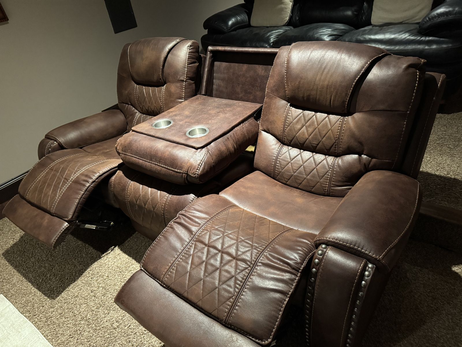 VenmoPower reclining sofa with power adjustable headrests. Seats three, or lower the divider for drink holders and added comfort. USB plugs to charge your devices in each arm rest. It's a little over 7' wide