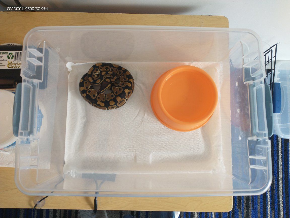 VenmoFang is a juvenile, coffee/ mocha colored, male, Ball Python. Born July 14th 2025 He comes with an enclosure, water dish, hide, and heating pad. He has been a class pet so he is used to people. He tolerates being held. Right now he is eating fuzzy rats. He gets fed once a week. He just recently shed.