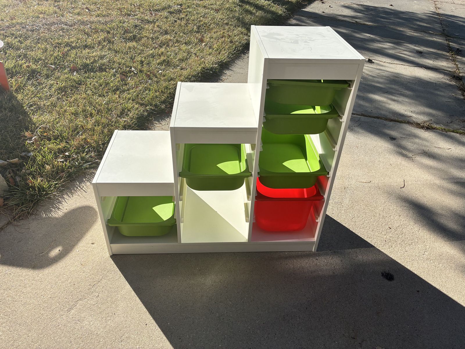 VenmoWhite stair-step storage unit with green and red plastic bins. Three tiers with multiple pull-out bins. Great for toys or kids’ rooms. Good used condition.
