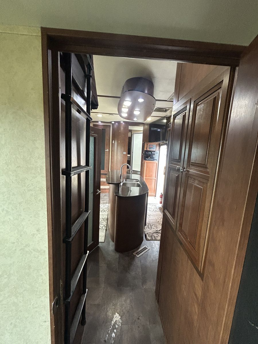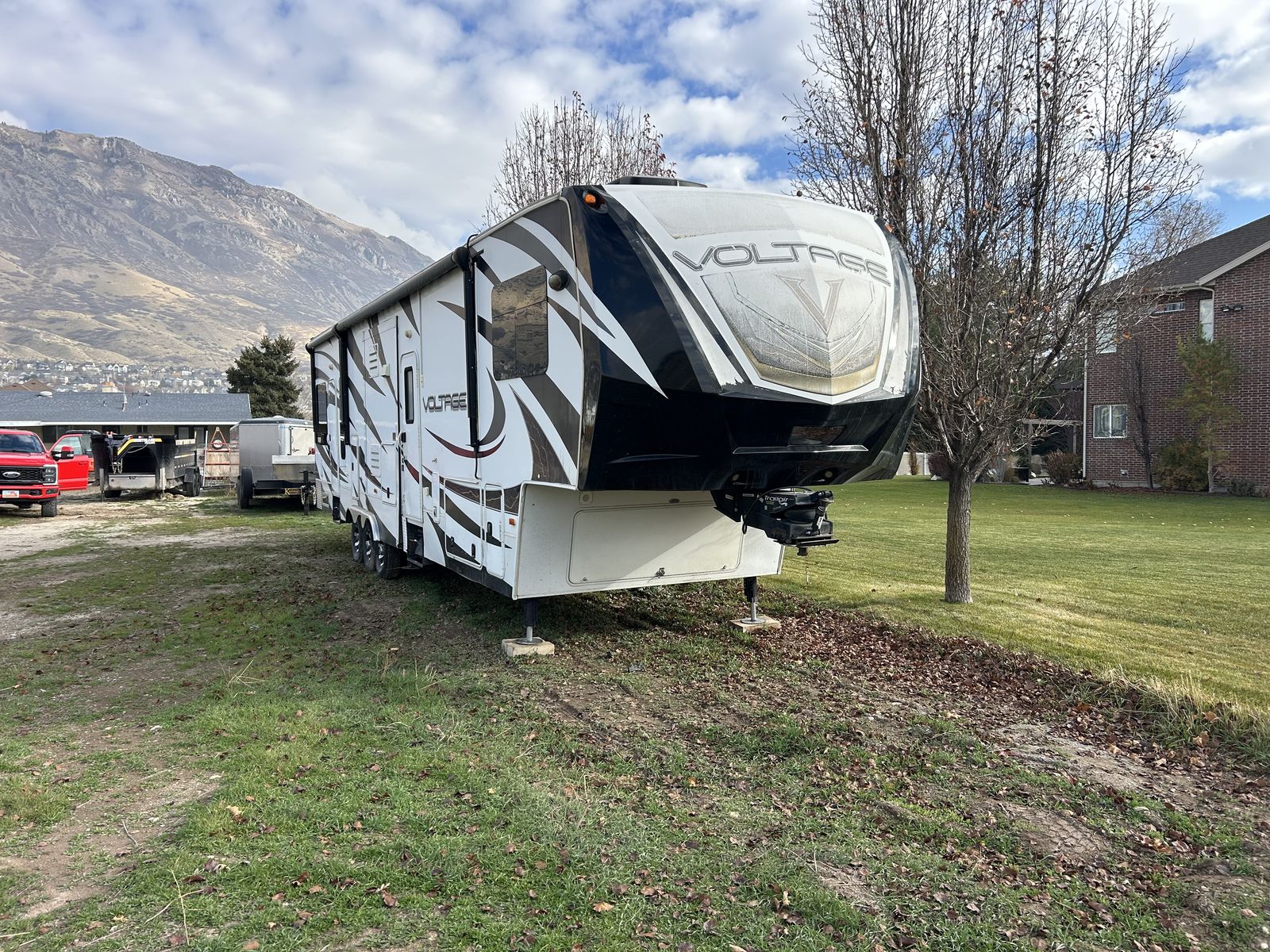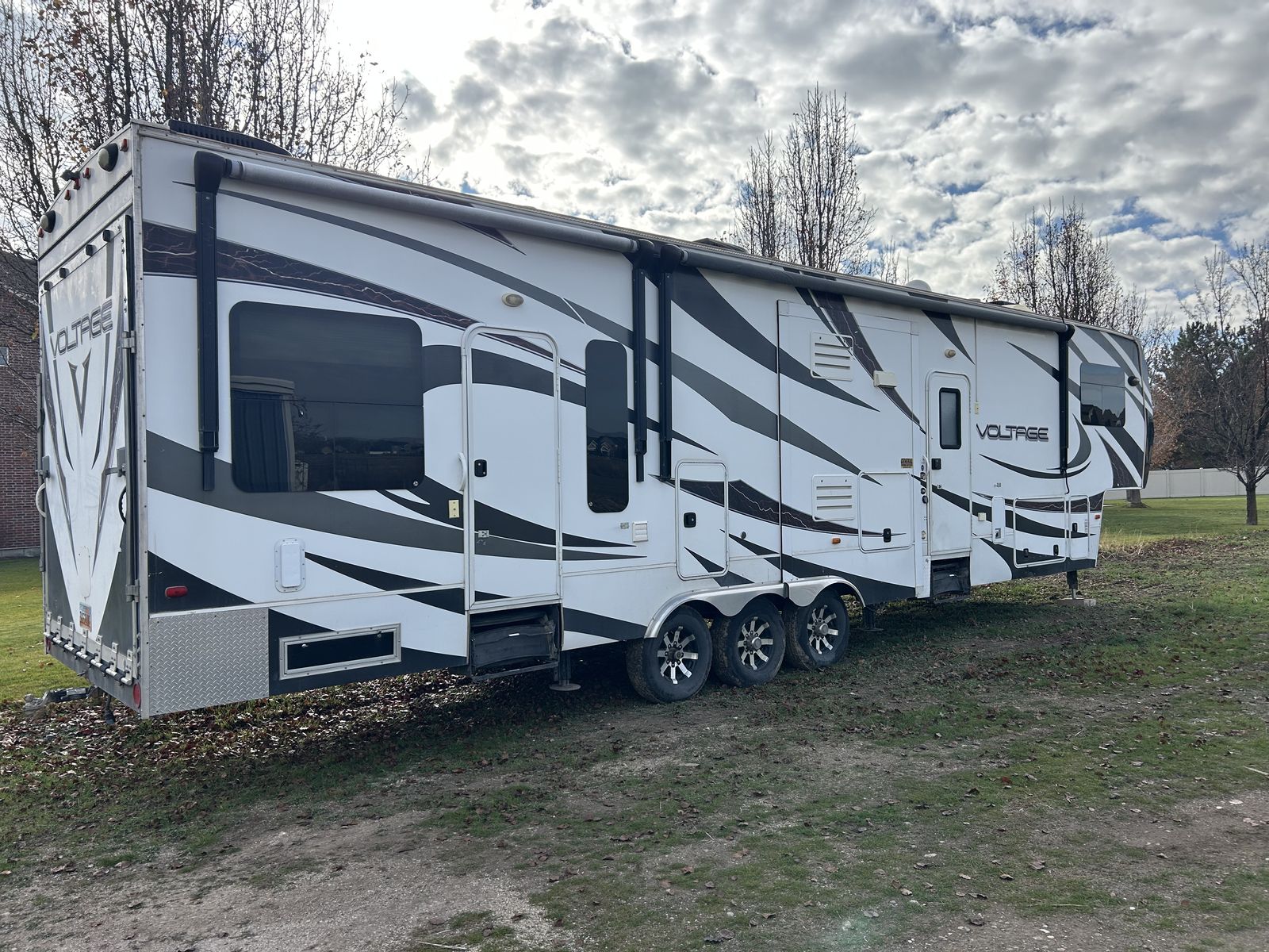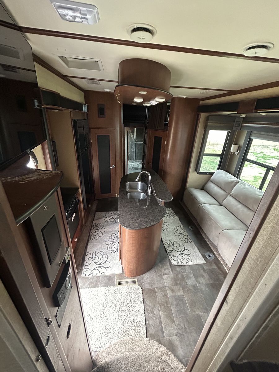 2013 voltage toy hauler, fifth wheel luxury model with 3 slides, 2 bathrooms 12 foot garage, auto level, generator, 150 gals fresh water, new main TV. Has 4 tvs double side fridge, 43 feet long rear receiver to pull another trailer, 3 axle with all new brakes and springs. Has back patio area with gates 2 electric auto awnings both in great shape. Real wood cabinets , winter ready sleeps 8-10 with back 2 queens beds. Pulls great and is in good shape. 30 gal tank for generator and 30 gal onboard fuel station for toys. If your looking for a bondocking trailer this is the best unit out there, tons of water, sewer, generator, solar panels, fuel, and lots of storage.