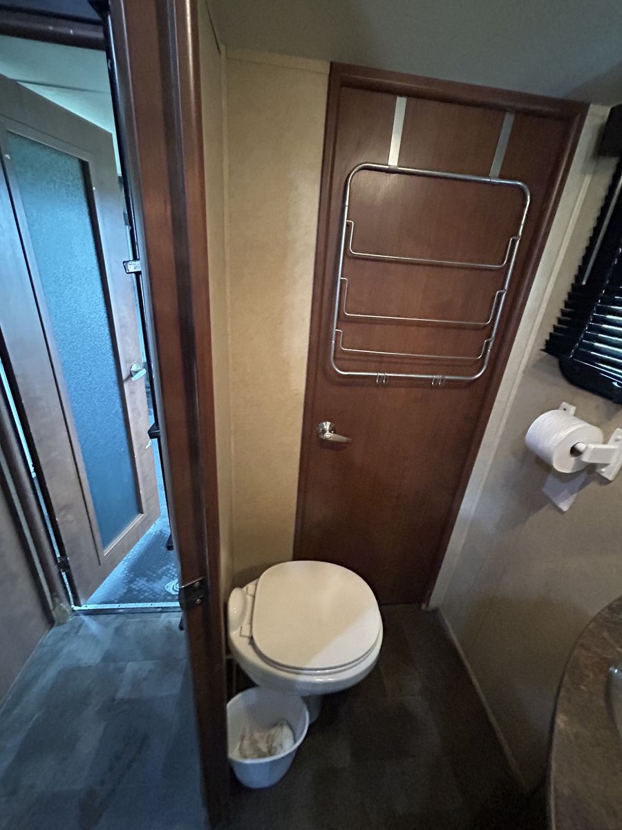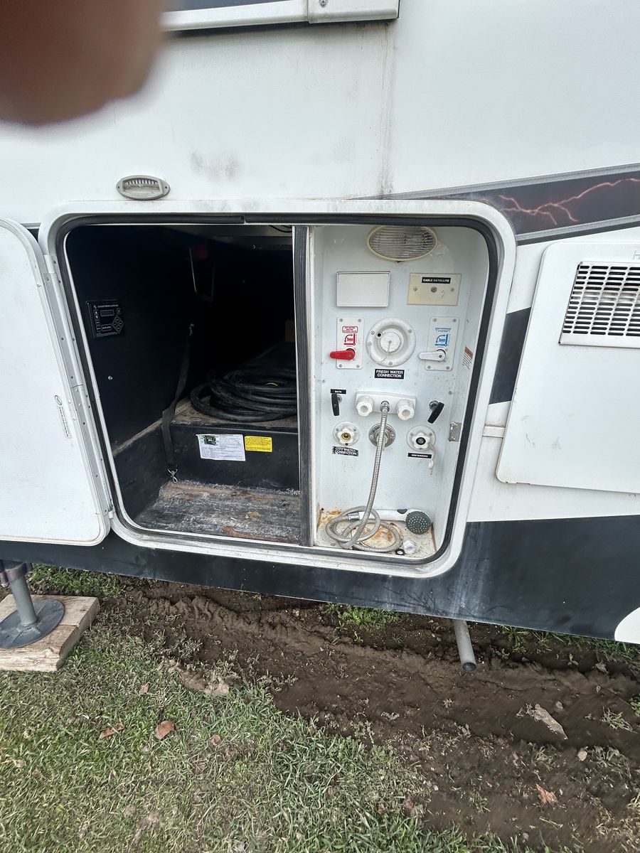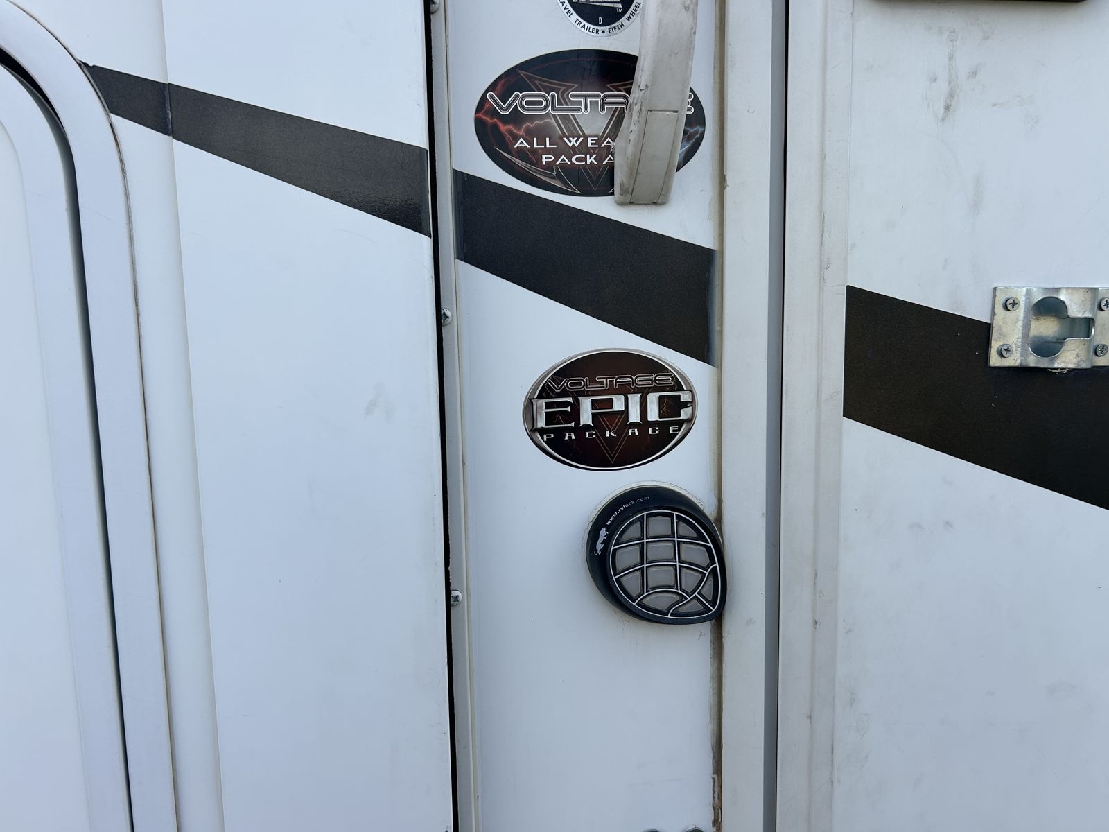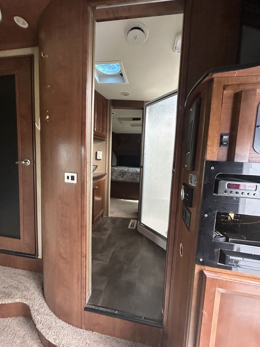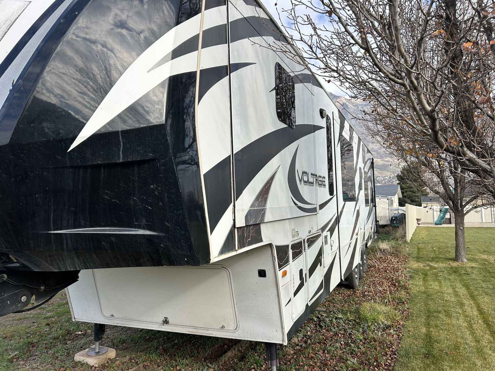 2013 voltage toy hauler, fifth wheel luxury model with 3 slides, 2 bathrooms 12 foot garage, auto level, generator, 150 gals fresh water, new main TV. Has 4 tvs double side fridge, 43 feet long rear receiver to pull another trailer, 3 axle with all new brakes and springs. Has back patio area with gates 2 electric auto awnings both in great shape. Real wood cabinets , winter ready sleeps 8-10 with back 2 queens beds. Pulls great and is in good shape. 30 gal tank for generator and 30 gal onboard fuel station for toys. If your looking for a bondocking trailer this is the best unit out there, tons of water, sewer, generator, solar panels, fuel, and lots of storage.