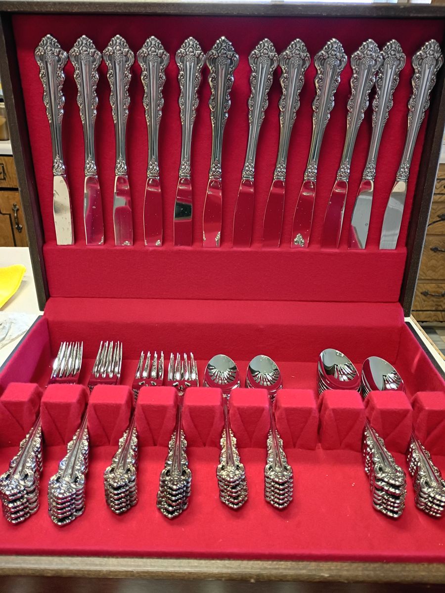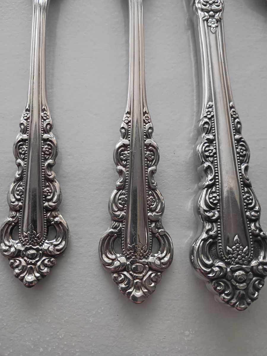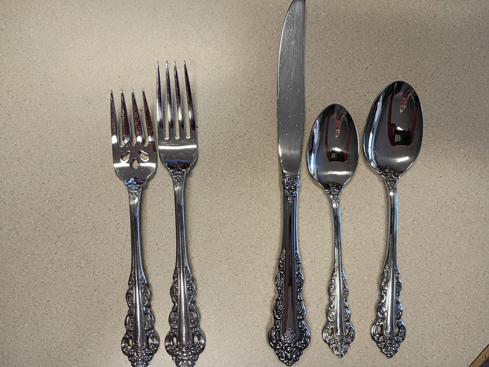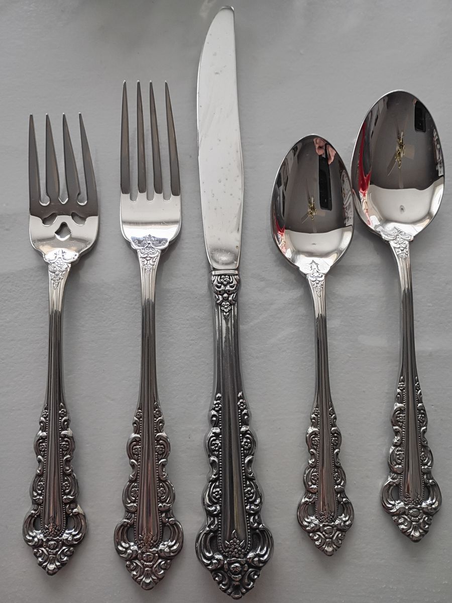 12 knives, 12 spoons, 12 soup spoons, 12 forks, 12 salad forks.
