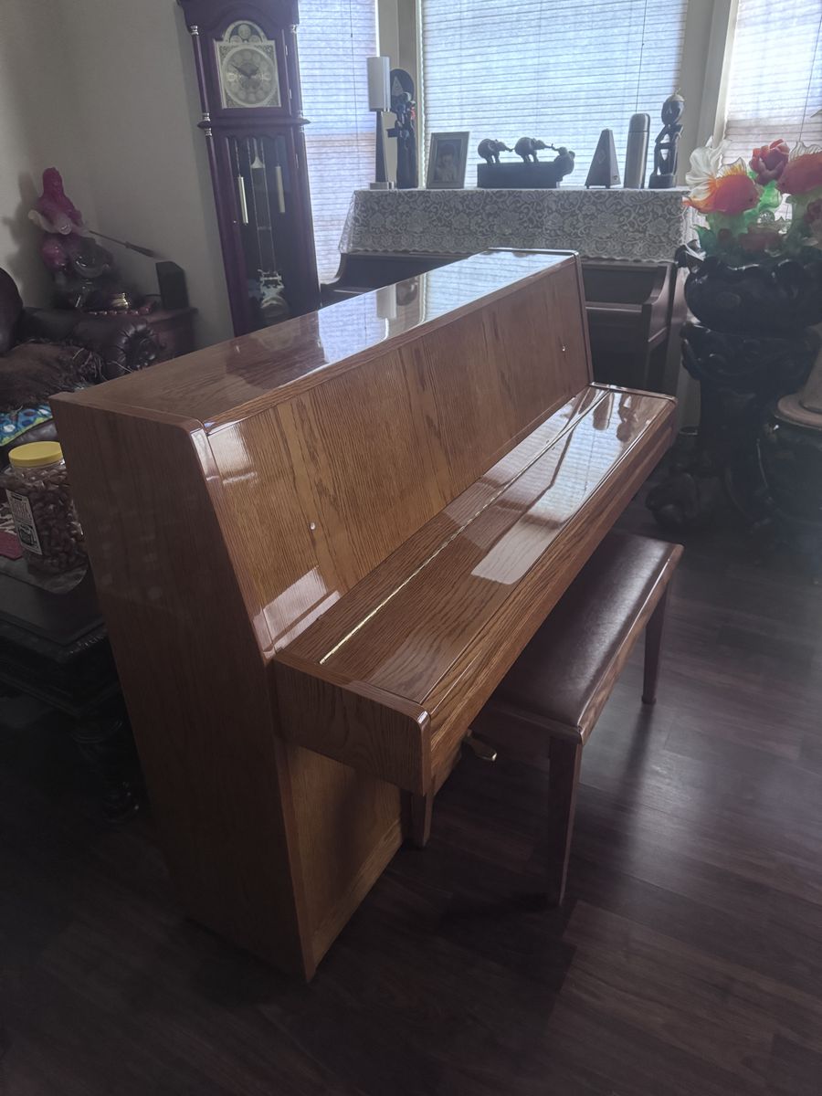 VenmoBeautiful SAMICK upright piano. Has classic wood finish. Comes with matching bench. All keys and pedals are working great, deep cleaned and tuned. We do free delivery and free home tuning services. 57.5 inches L, 22 inches W, 42.5 inches H