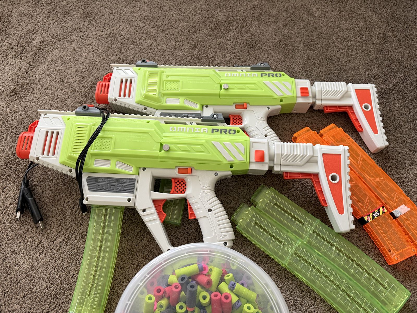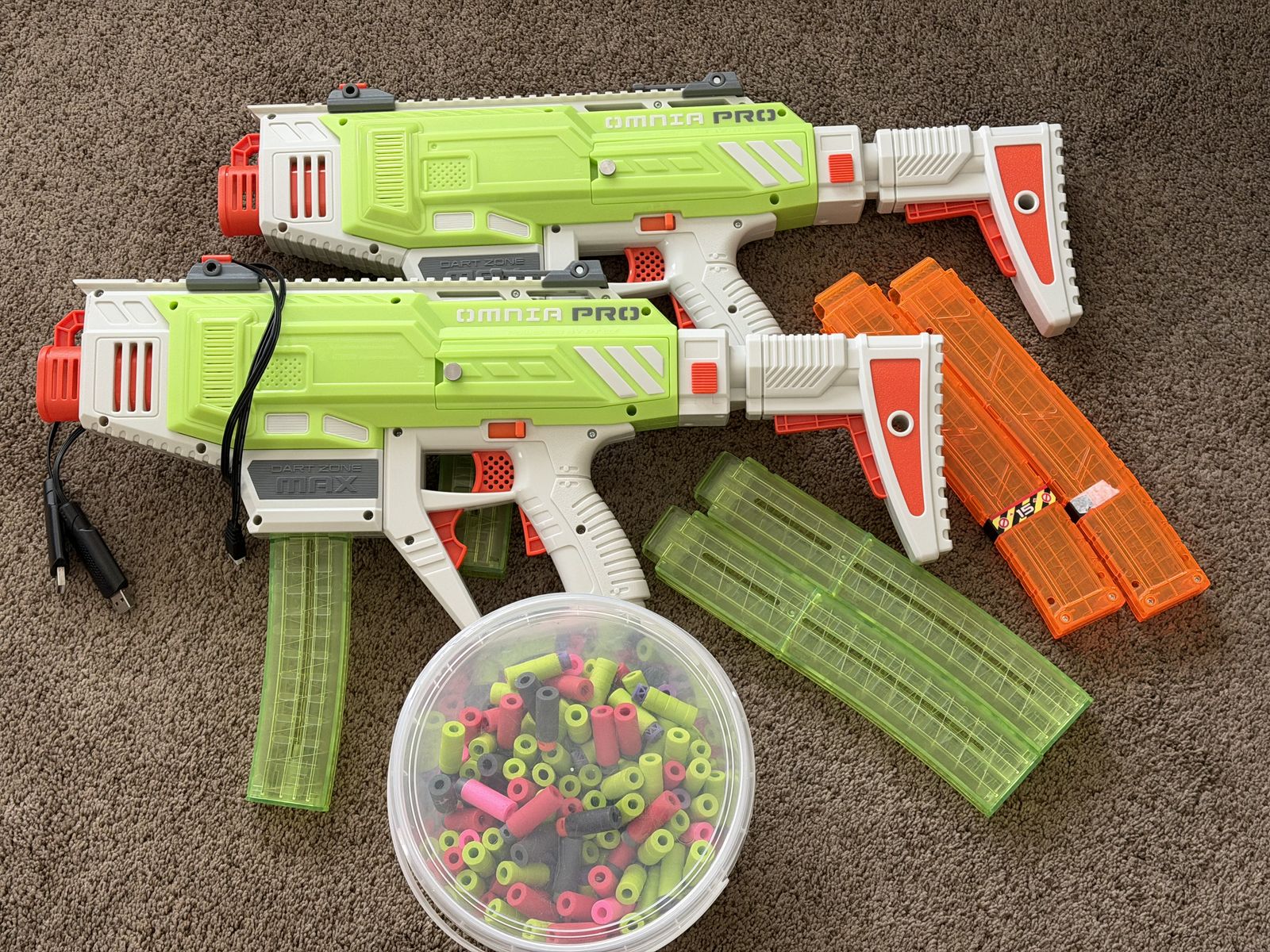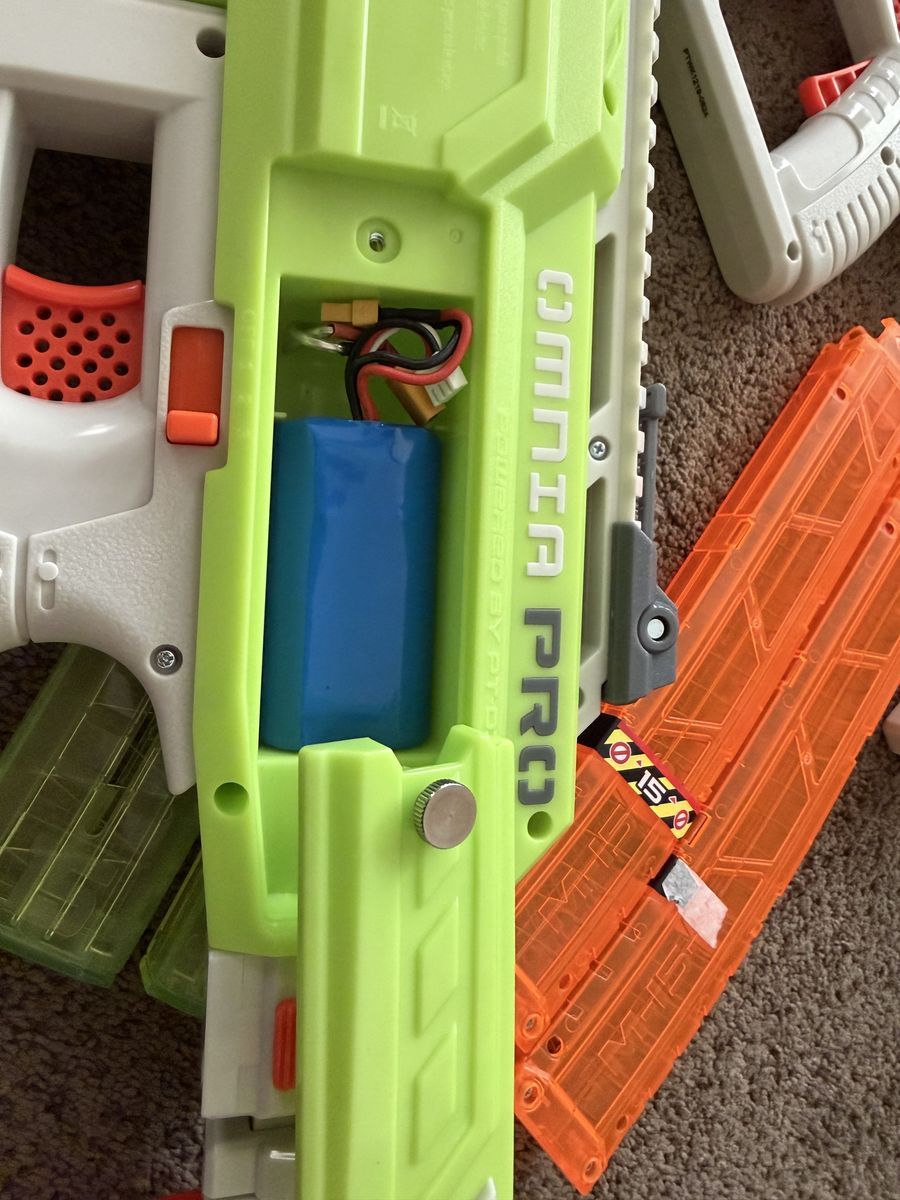 VenmoI have 2 Omnia Pro Gen 3 for sale. Adult owned and well cared for. Comes with two extra 15 dart mags and a giant tub of darts. (Nitroshot + bamboo, Worker HE Heaveyweighgs, Sabre T's, XSHOT Pro Series) I also swapped the Phillips head screw for a thumb screw that makes accessing the batteries so beautifully easy. These things fire 7 darts a second which is insane and firing the 3-round burst for the first time ... it's a religious experience.