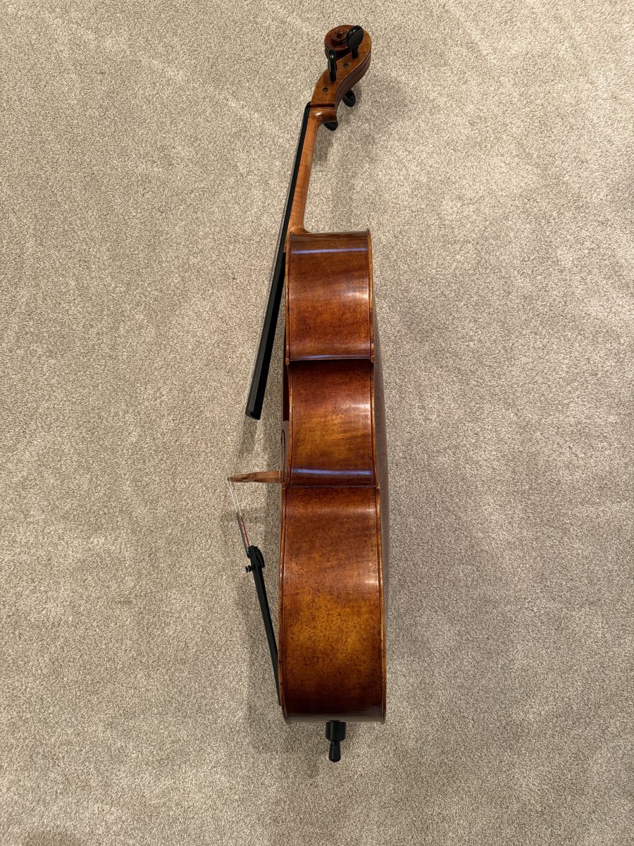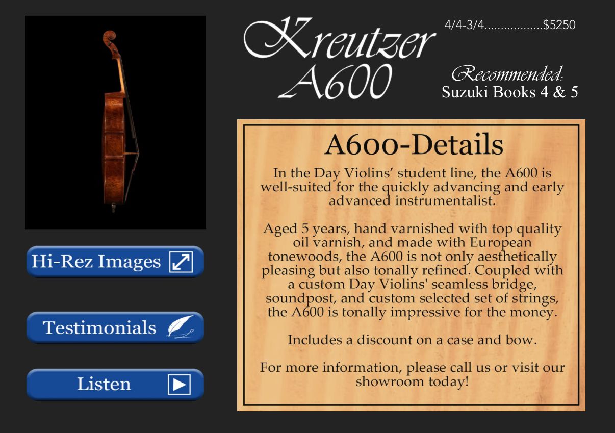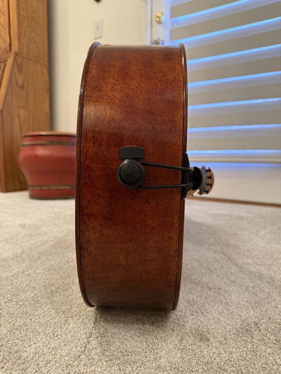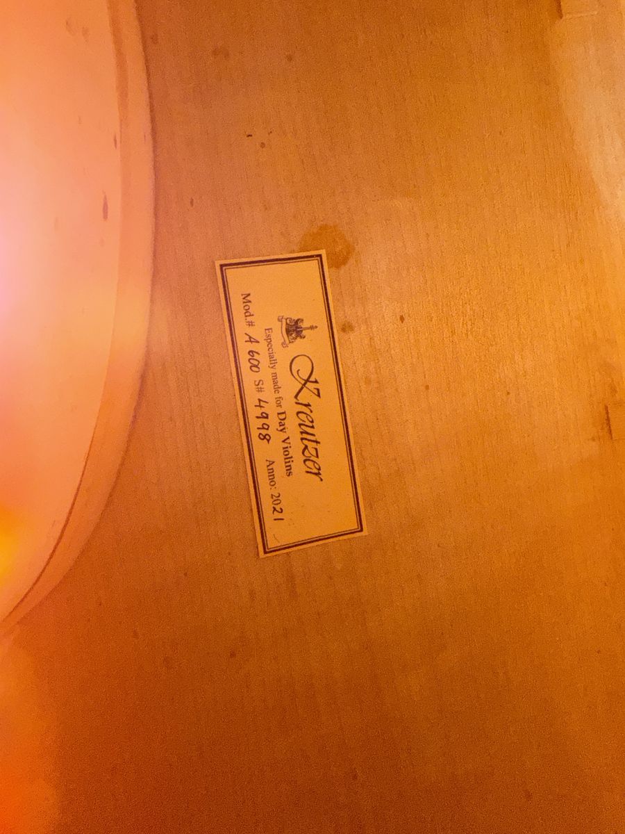 A600 2021 from Adams Days Collection. It sounds incredible and leans towards the brighter side. I have used this as a University instrument and its professor approved. As far as aging the sound has only got better, but use wise there is some normal ware. Like: noticeable chips on the front (small and totally fixable) and 1 deep but unnoticeable scratch on the upper right rib. Not planning selling my bow or case so willing to slightly negotiate. A new A600 starts at $6k+