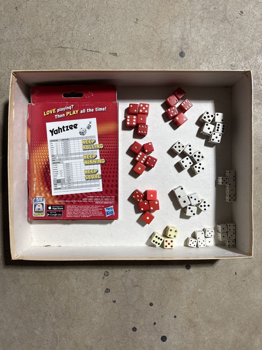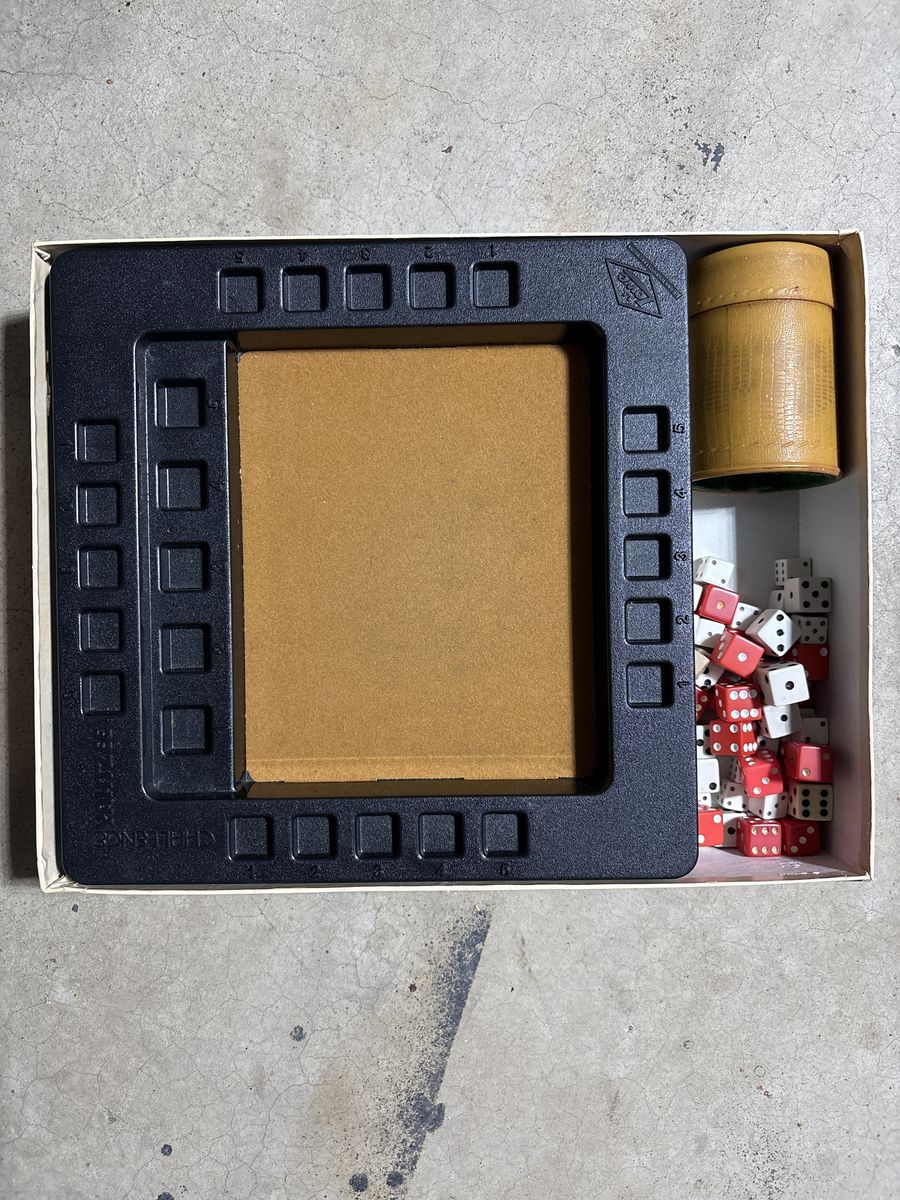 ZelleThis is a 1978 Challenge Yahtzee game. The box has some wear on it but everything is in decent shape. Still has the instructions. 20 red dice, 15 white dice, and 15 miniature white dice. 3 dice that have different colors on the dots. Has extra score sheets.