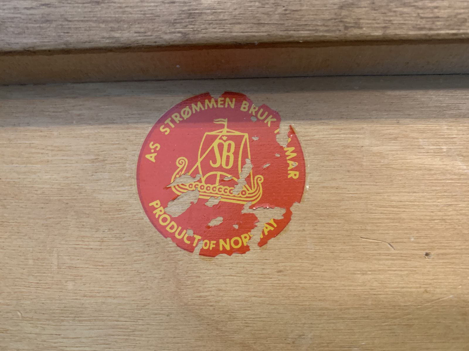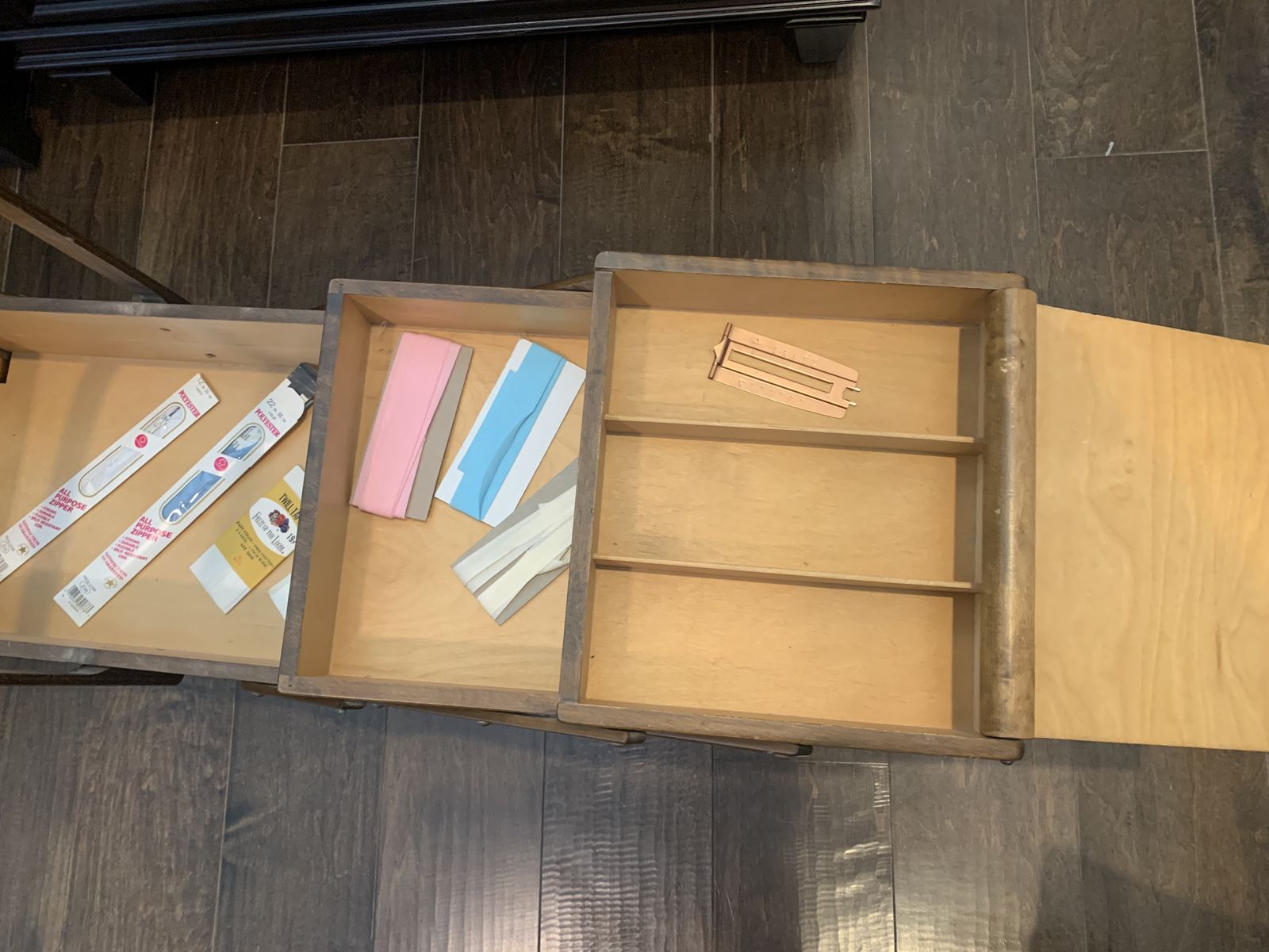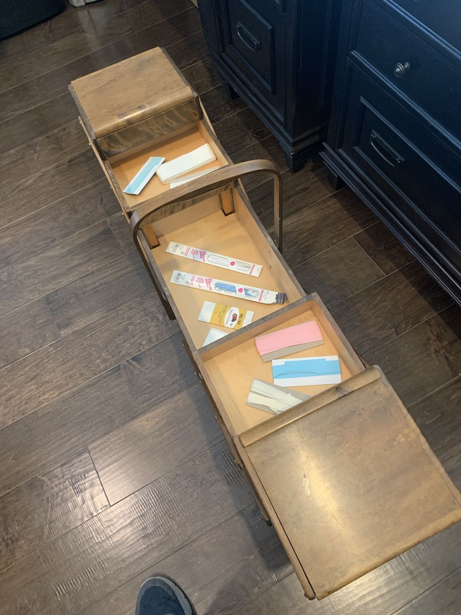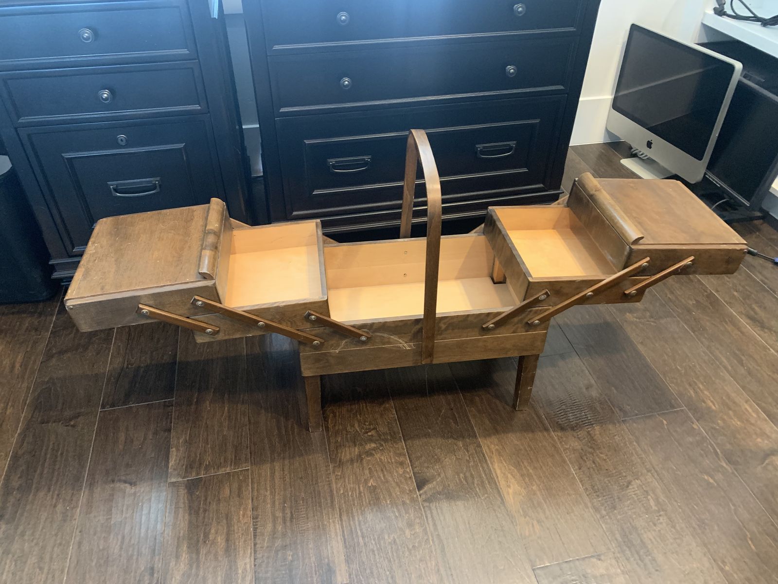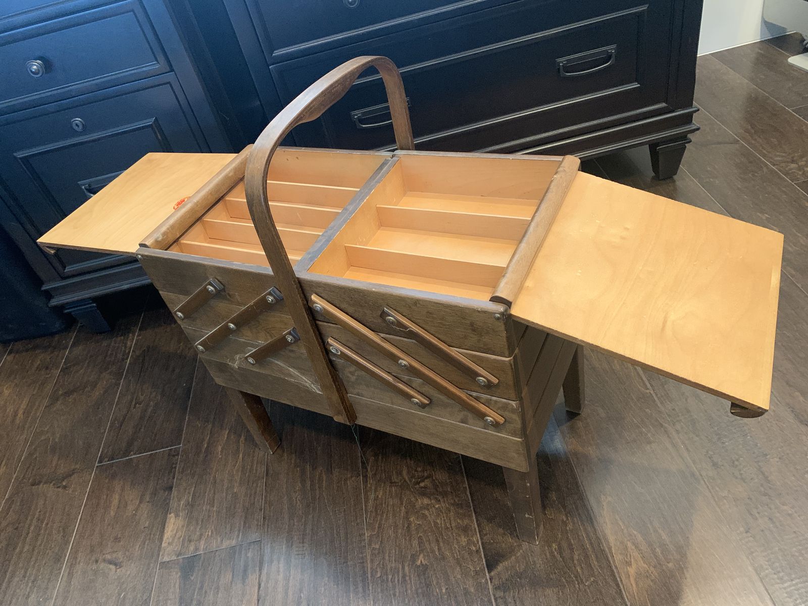 Large Vintage Strommen Bruk Hammer sewing box. Sturdy wood. Versatile and spacious. Well-built in the 1960’s in Norway. Great as a sewing caddy, jewelry box and/or needles box. Accordions on both sides with handle. This caddy has unique legs not seen with most of the newer boxes. This tiered sewing box is the Cadillac of these kits! Even sits as a nice decoration. Seen listed on Etsy as high as $450.