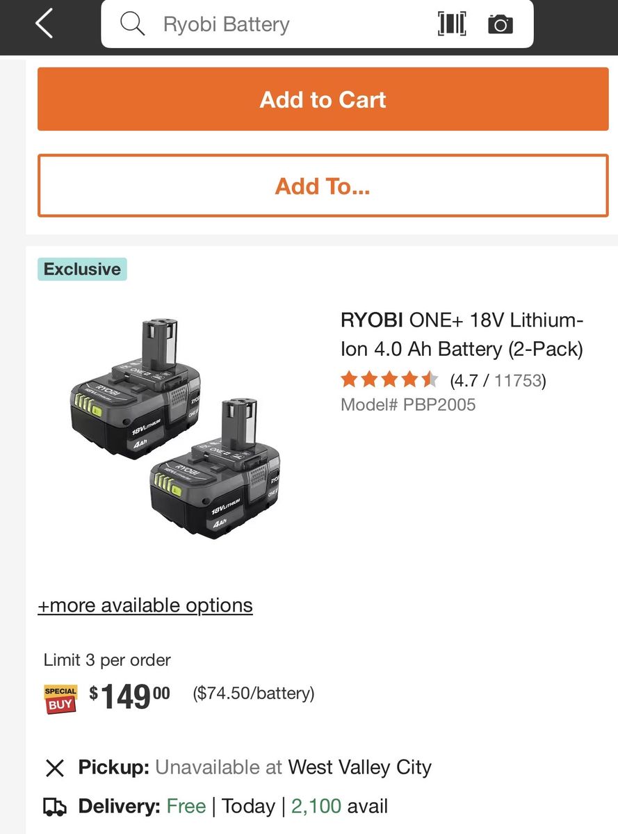 VenmoBrand new ryobi 2 pack battery PBP2005 $149 at home Depot+tax