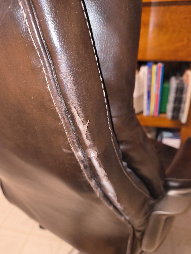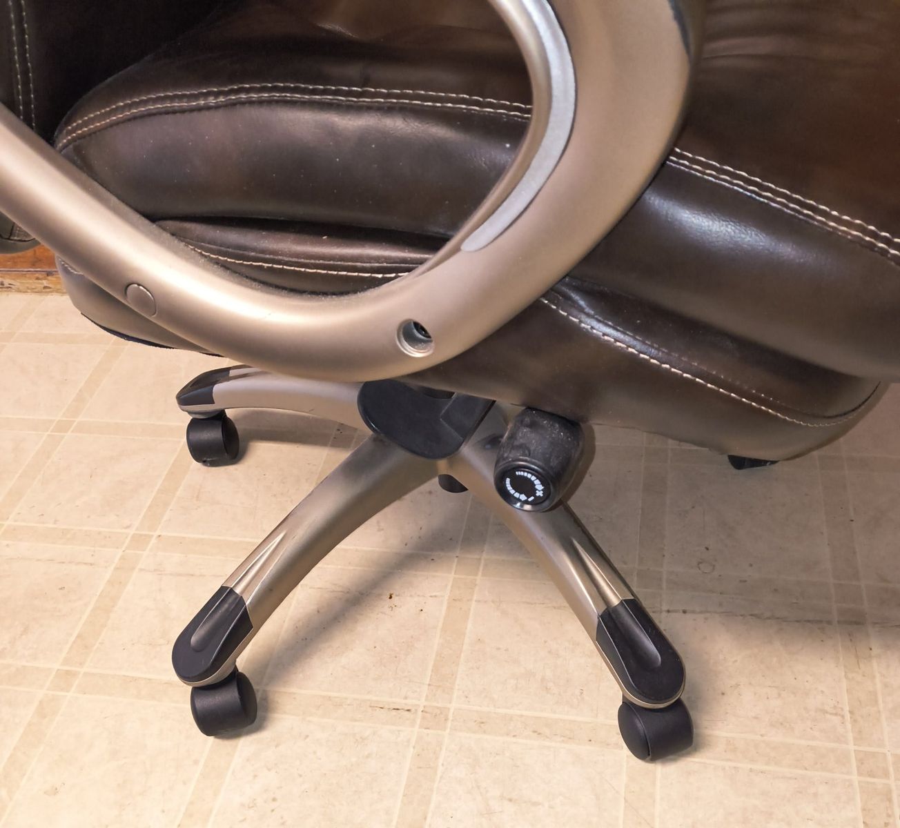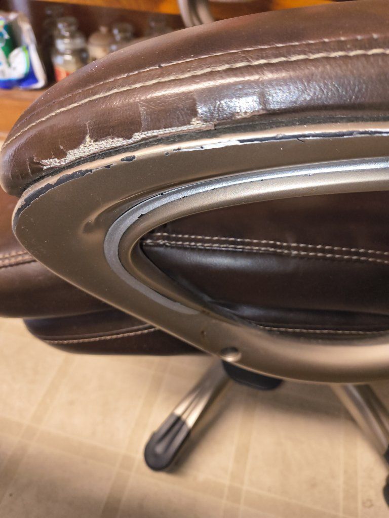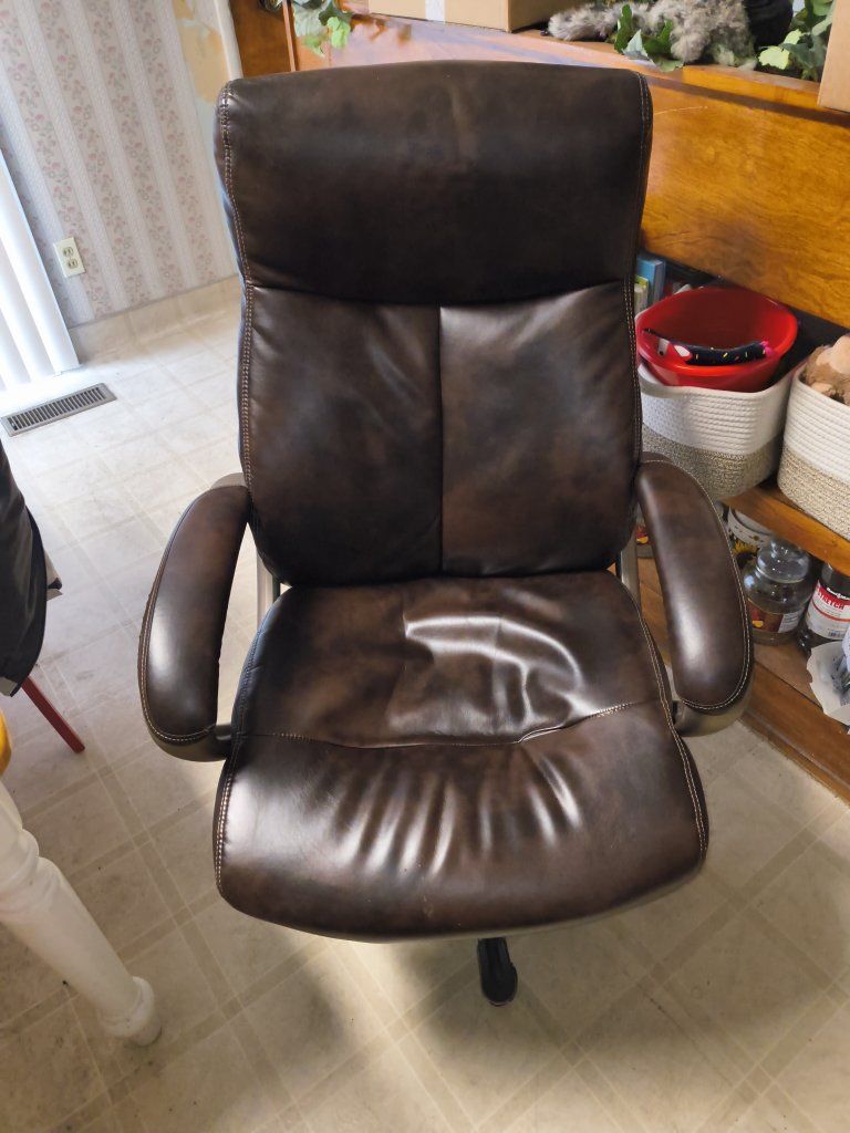 This is a brown vinyl office desk chair that reclines, is really comfortable on the seat and back. But it is also well used. There is no charge on this chair just come and get it if you want it.