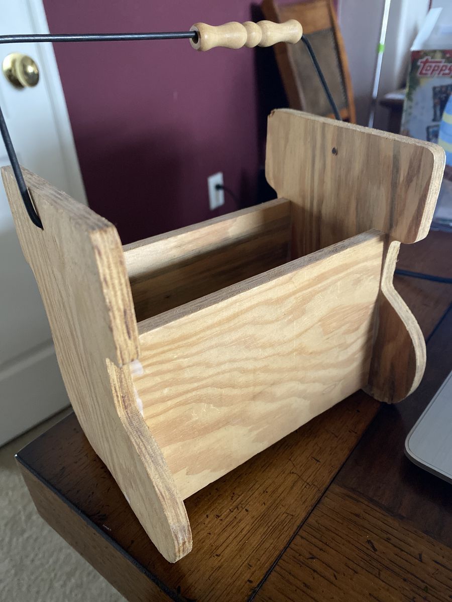 Brand new ready to craft. Wood basket with handle. Measures 6.5” long and 5” wide. About 6” tall. $5 each. Two available.