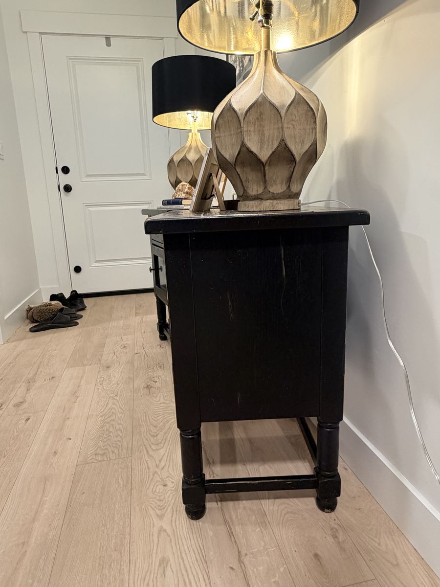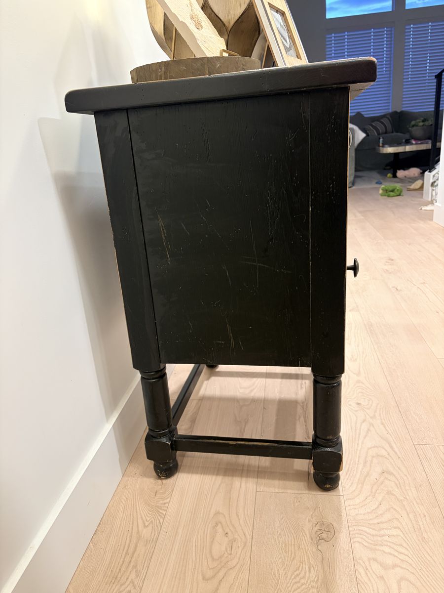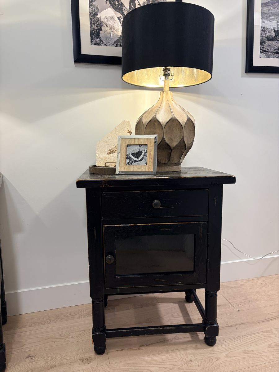 ApplePayBeautiful matching set of 2 Broyhill end tables. Solid wood construction with a black distressed finish and rustic farmhouse style. They are in great condition with only minor, natural distressing consistent with the style. Very clean and well cared for. Perfect for a living room, bedroom, or office.