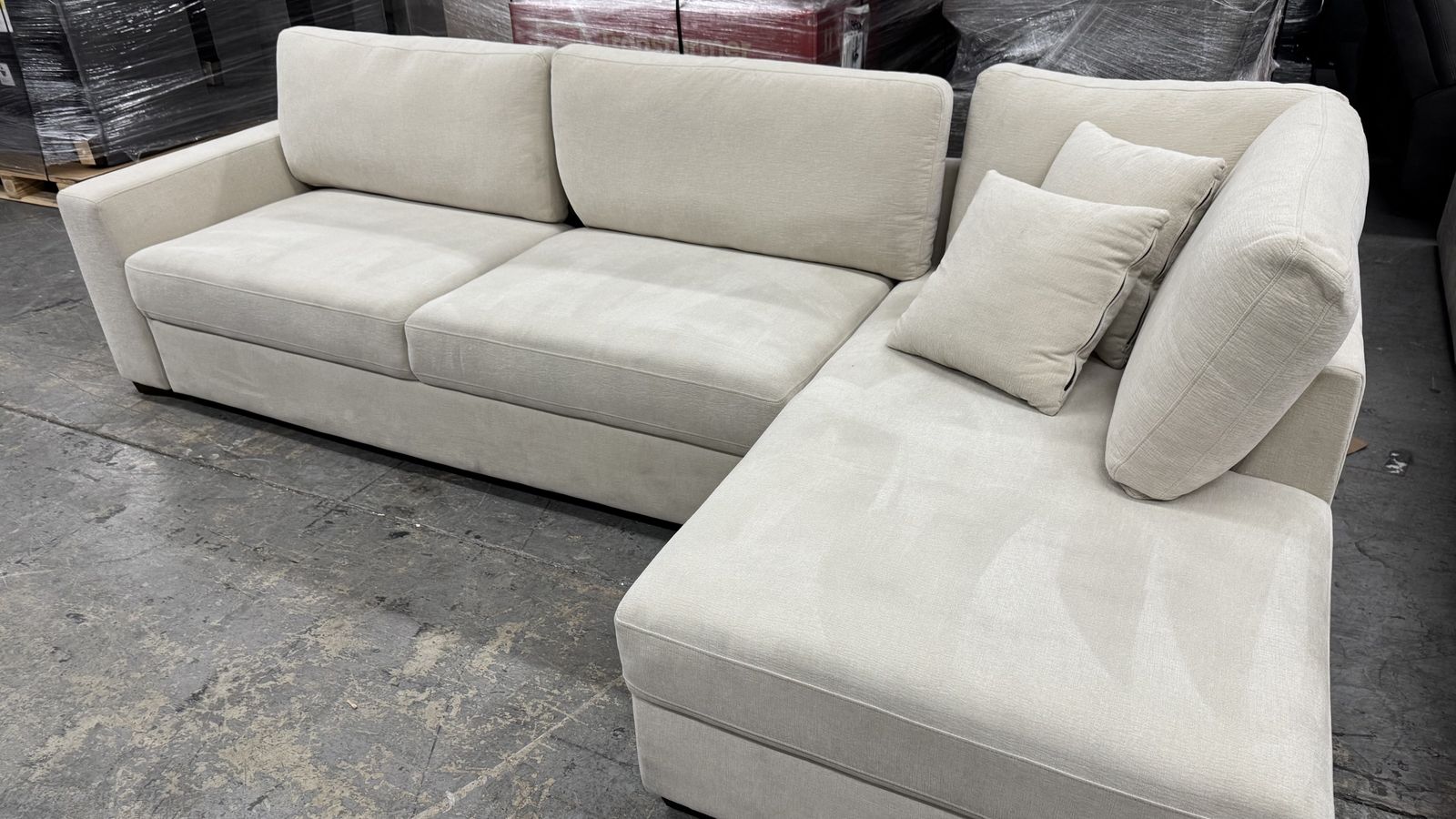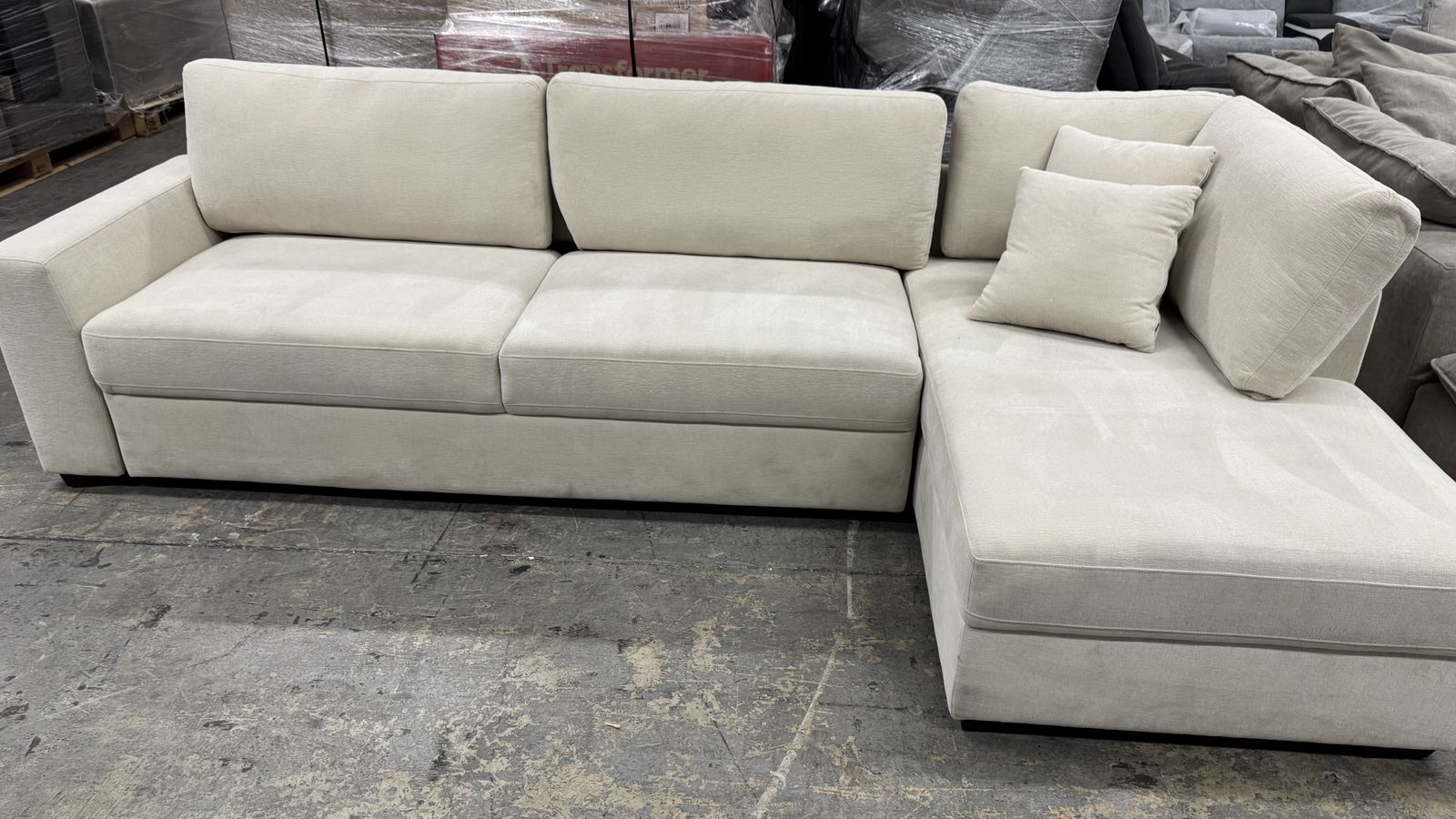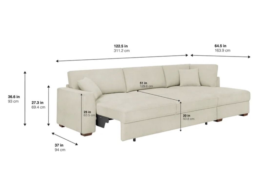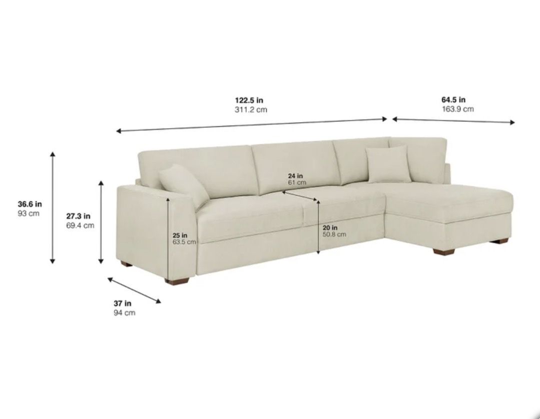 Overall Dimensions (in.) 122.5 L x 64.5 W x 36.6 H Seat Height 20 Seat Depth 24 Back Height - Not including back cushions 27.3 Back Height - Including back cushions 36.6 Leg Height 2 Overall Sectional Weight 326.7 lbs. Weight Capacity 250 lbs. per seat Left Arm Facing Loveseat Sleeper Dimensions 86 L x 37 W x 36.6 H Left Arm Facing Loveseat Sleeper Extended Dimensions 86 L x 64.5 W x 36.6 H Left Arm Facing Loveseat Sleeper Weight 221.5 lbs. Right Arm Facing Open End Chaise Dimensions 37.5 L x 64.5 W x 36.6 H Right Arm Facing Open End Chaise Weight