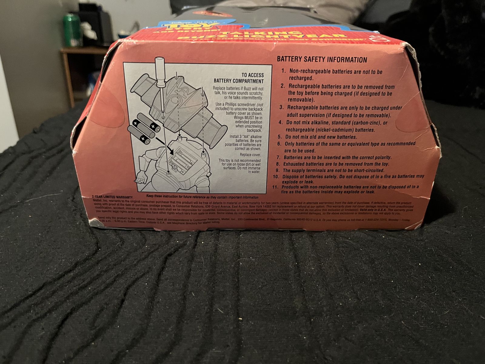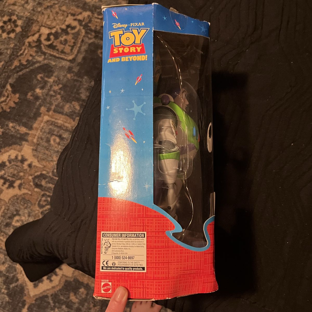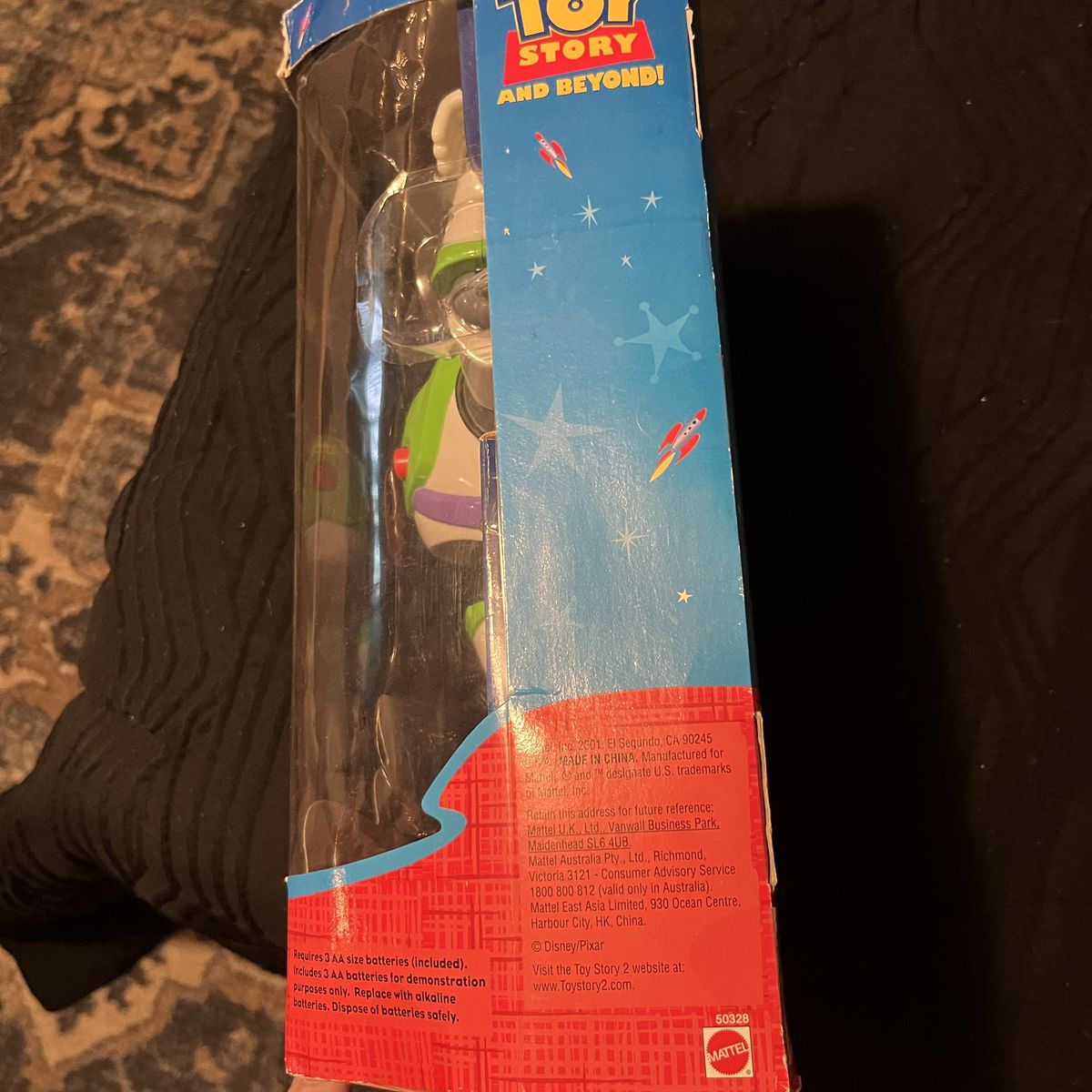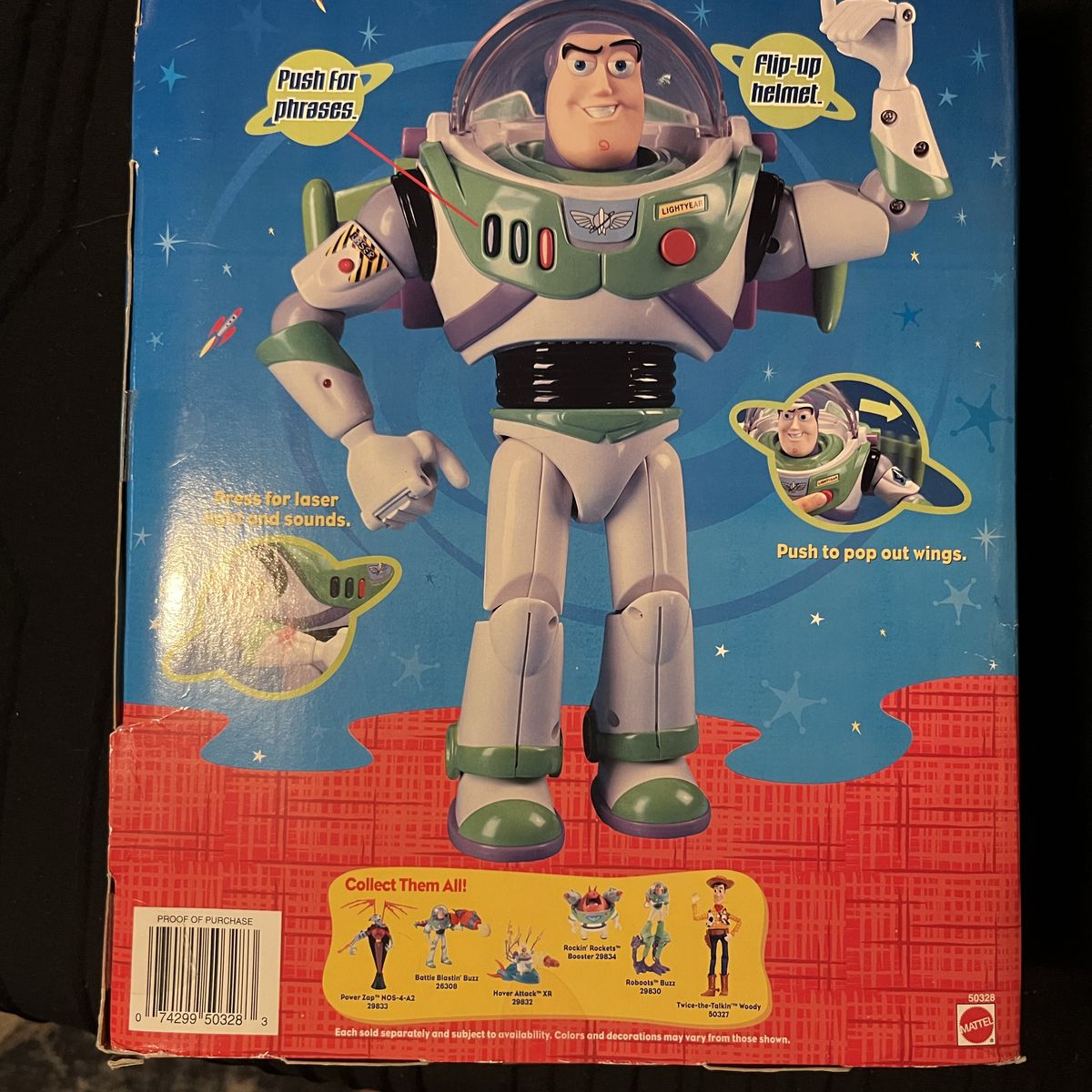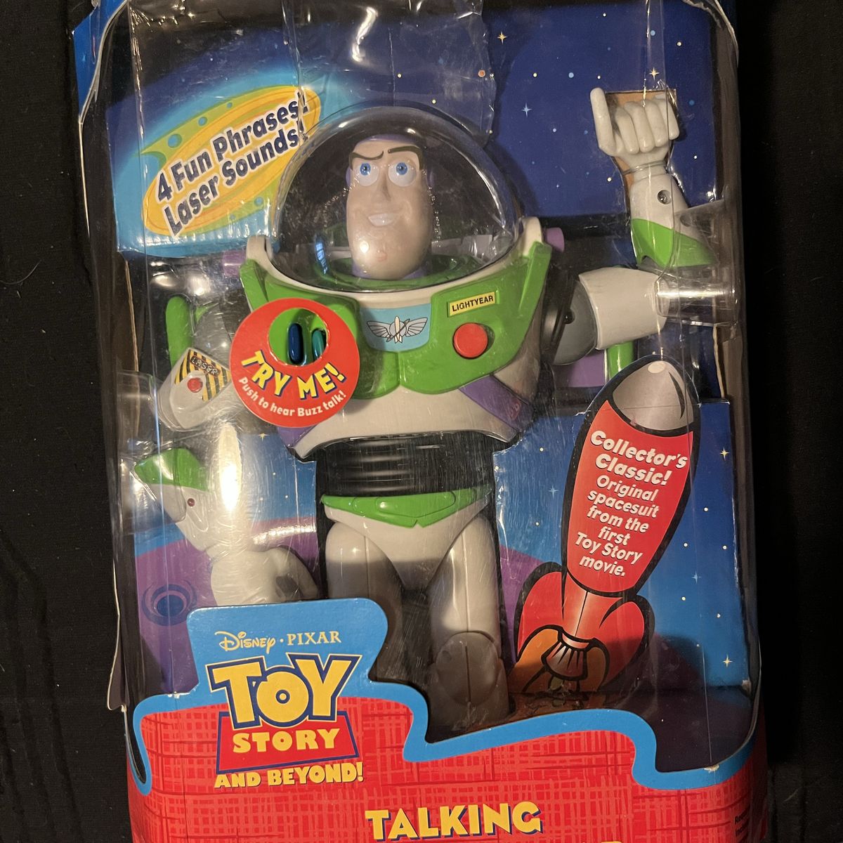 ApplePay2001 Buzz lightyear. Some of the tape holding it closed has loosens. No major dinks or ding “collectors, classic original spacesuit from the first Toy story movie” 4 fun phrases! Laser sounds. Has never left the box. Buzz is in mint condition. Has recently been appraised. Give best offer