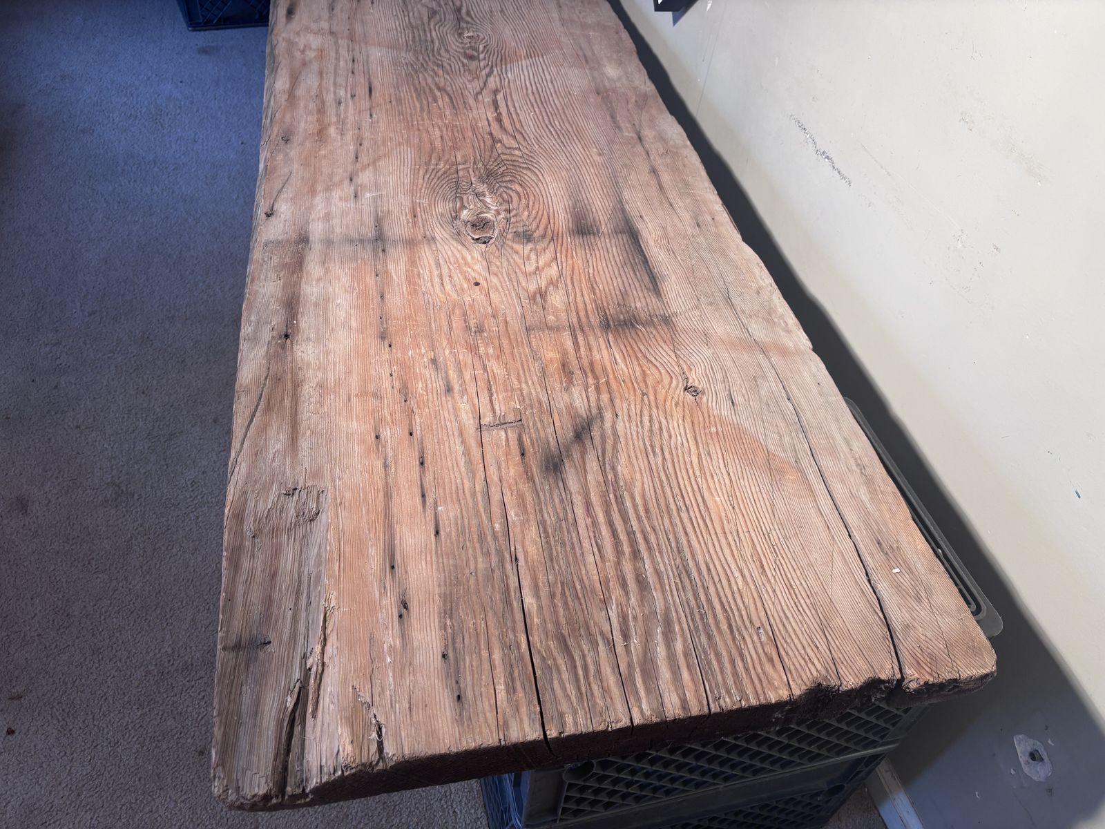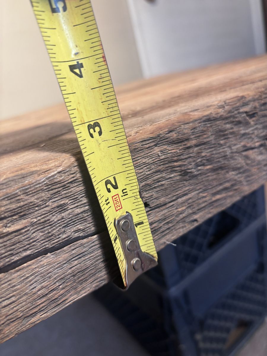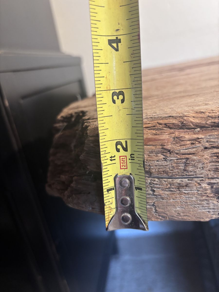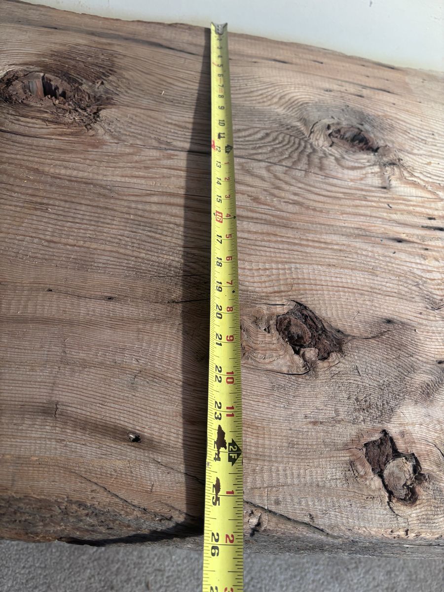 Up for grabs is an Old Upstate New York PLANK BOARD HOUSE Timber. It measures variously 2.5” thick x slightly more than 2’ wide x (just less than) 8’ long. The condition AS IS, it is structurally sound with flaws consistent with age. In the deciduous forests of the Northeast, where timber was plentiful, early settlers built structures using standard post and beam construction, but once they had water powered saws to mill the giant trees, they often sheathed buildings with these massive plank boards, variously referred to as “plank board houses.“ During my 30 years in the Finger Lakes Region of New York, I worked on several of these dwellings… fairly easy to install or enlarge window, but hard as heck to run wiring. They simply put clapboards on the outside, and lath and plaster on the inside. I picked up several of these salvaged boards towards the end of the last century, they were not from my own work, and brought this one west with other architectural features. Managed to set this up on a bathroom scale, it weighs 48.4 pounds. This could be heavy handedly fashioned into a table, or remain the museum “show-n-tell” piece as I’ve used it. Asking prices $650, make me an offer if you’re interested..