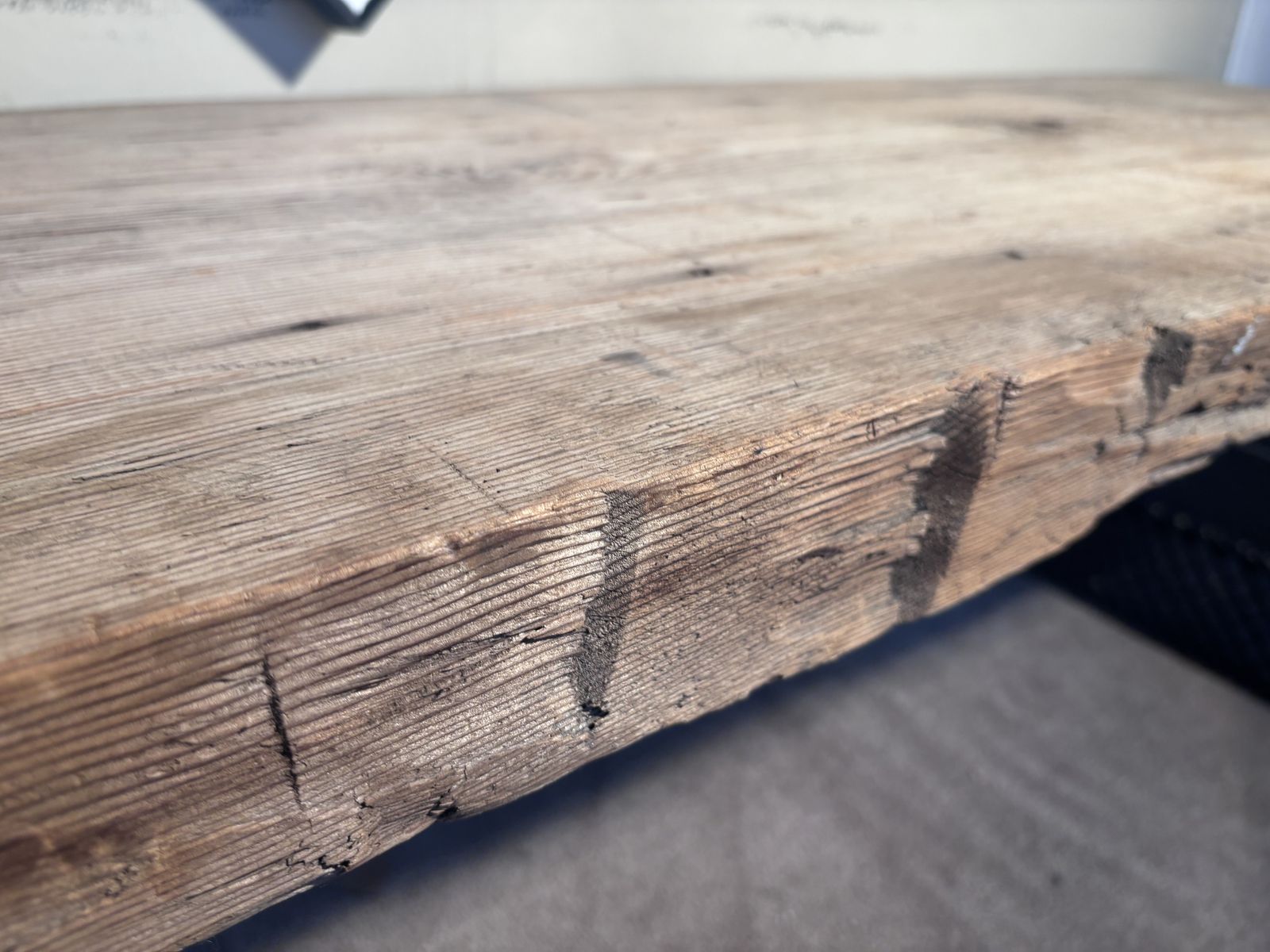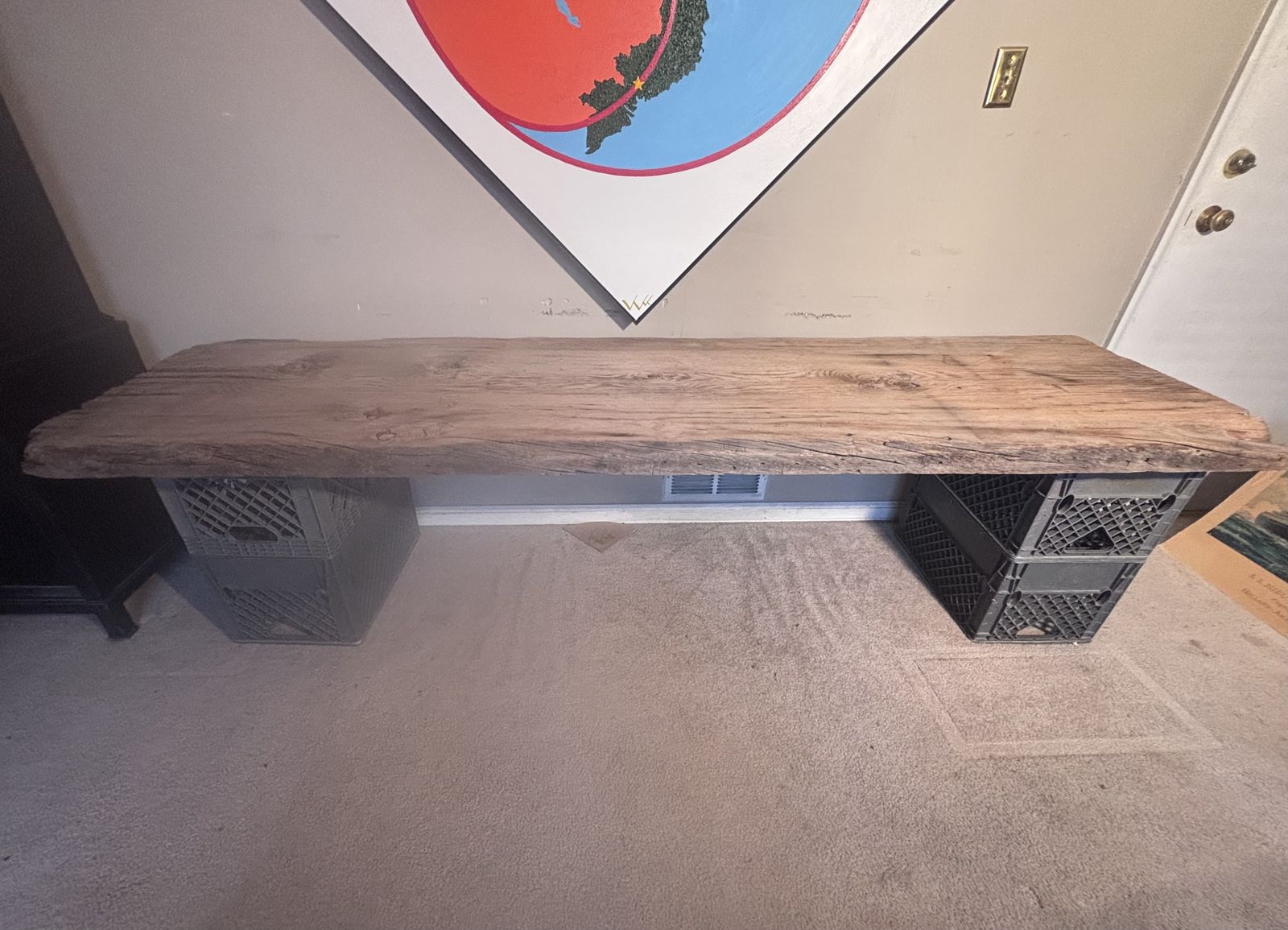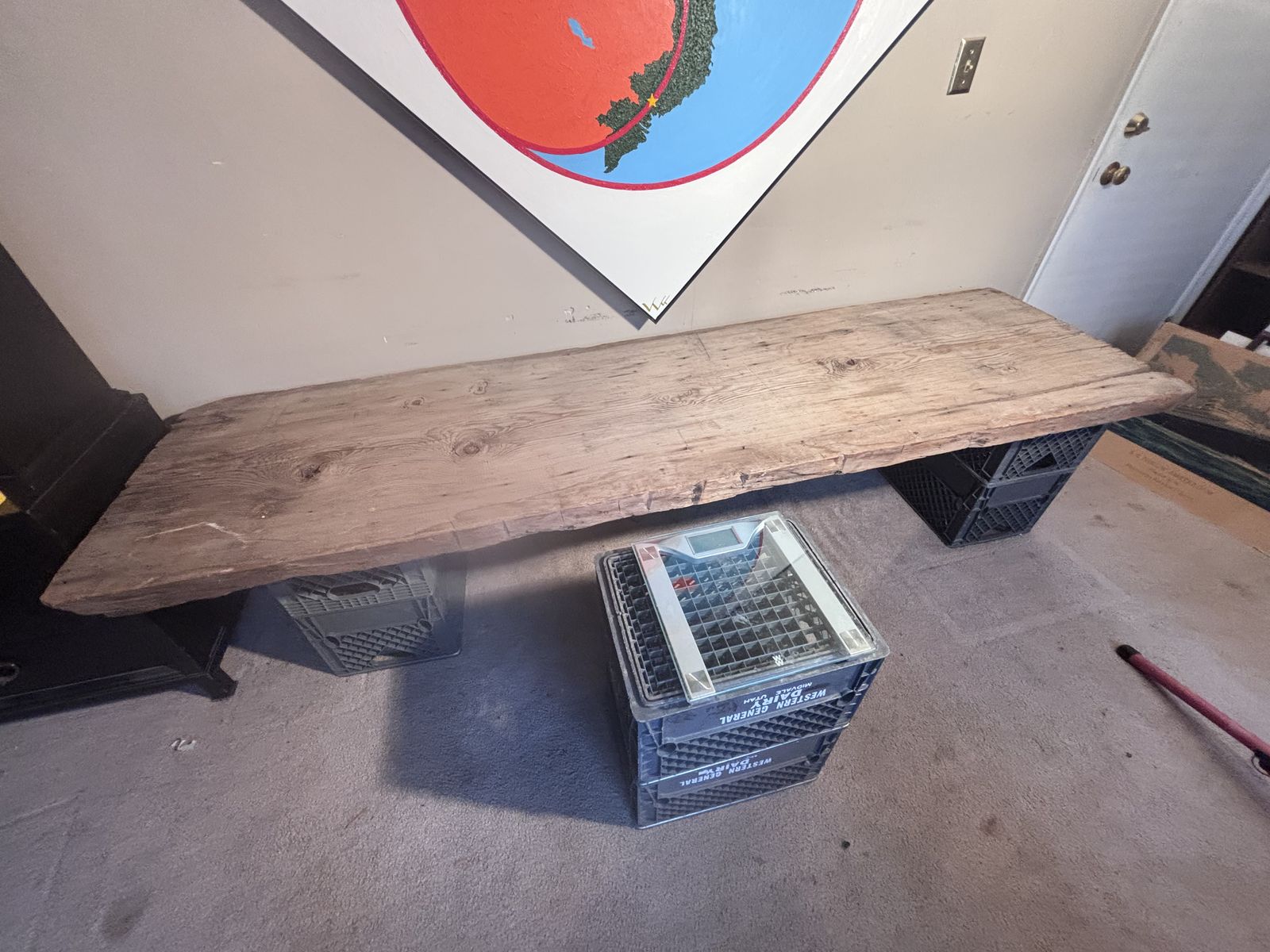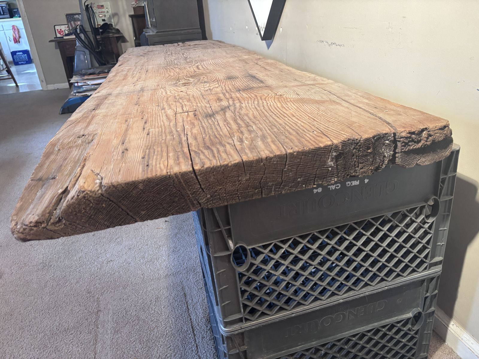 Up for grabs is an Old Upstate New York PLANK BOARD HOUSE Timber. It measures variously 2.5” thick x slightly more than 2’ wide x (just less than) 8’ long. The condition AS IS, it is structurally sound with flaws consistent with age. In the deciduous forests of the Northeast, where timber was plentiful, early settlers built structures using standard post and beam construction, but once they had water powered saws to mill the giant trees, they often sheathed buildings with these massive plank boards, variously referred to as “plank board houses.“ During my 30 years in the Finger Lakes Region of New York, I worked on several of these dwellings… fairly easy to install or enlarge window, but hard as heck to run wiring. They simply put clapboards on the outside, and lath and plaster on the inside. I picked up several of these salvaged boards towards the end of the last century, they were not from my own work, and brought this one west with other architectural features. Managed to set this up on a bathroom scale, it weighs 48.4 pounds. This could be heavy handedly fashioned into a table, or remain the museum “show-n-tell” piece as I’ve used it. Asking prices $650, make me an offer if you’re interested..