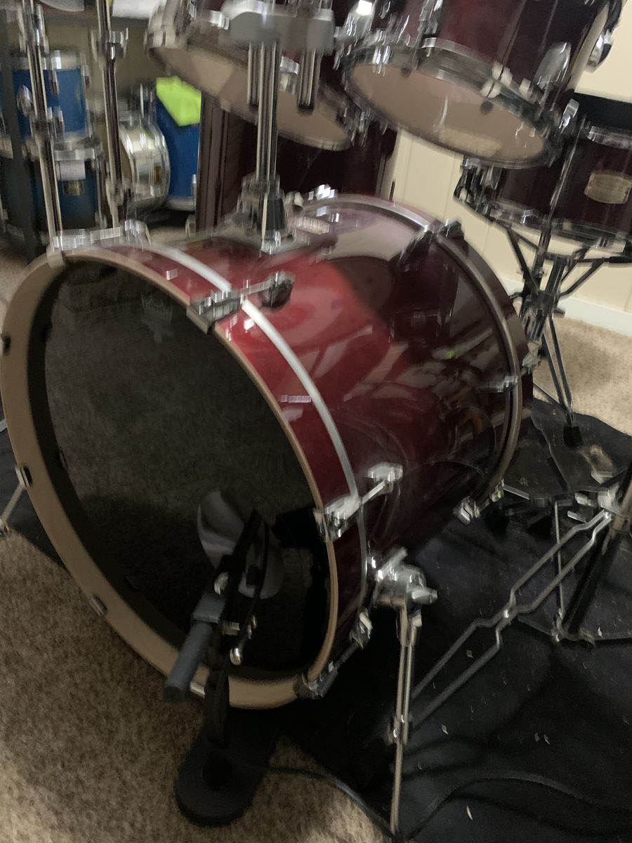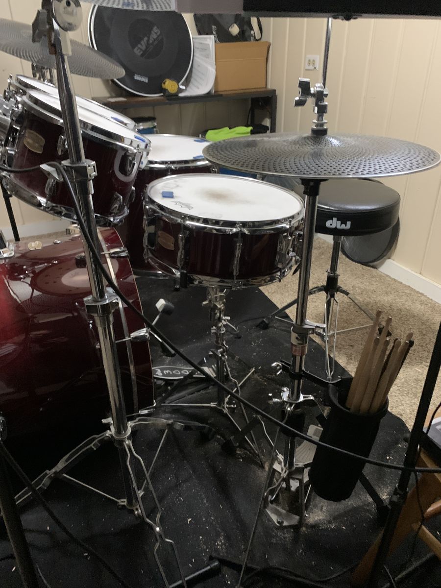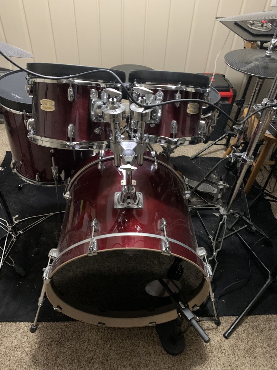 VenmoI'm selling my cranberry red Yamaha Stage Custom 5 piece set: 14" Snare, 10" and 12" rack toms, 16" floor tom and 22" kick (bass). Remo emperor coated heads, still in great shape. I have Black Holes for each drum and with the Evan's dbone cymbals, it keeps volume down about 80% to practice when family is home. I've owned it almost a year, bought new, set up in basement and hasn't moved since. Still looks, and of course, sounds new. I'm switching to a differen instrument is the reason for selling.