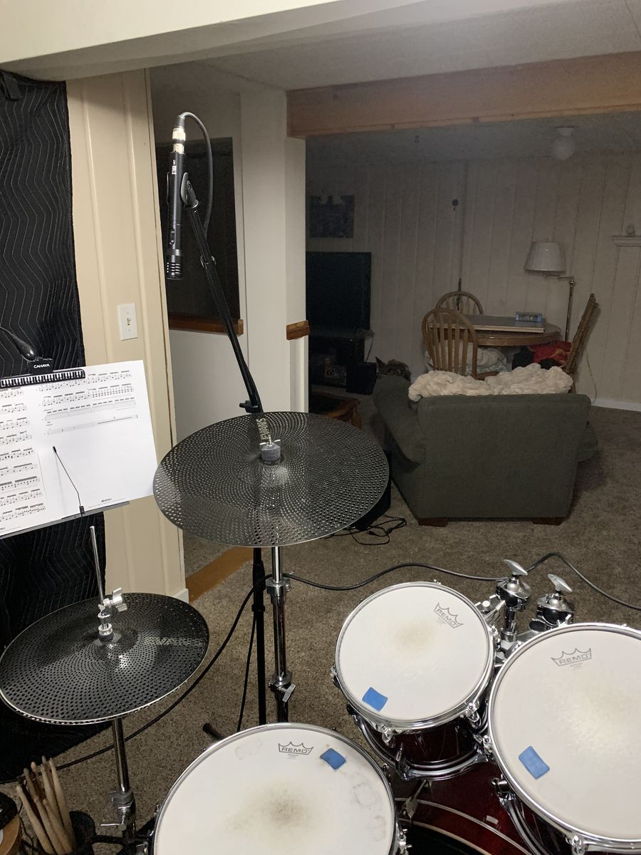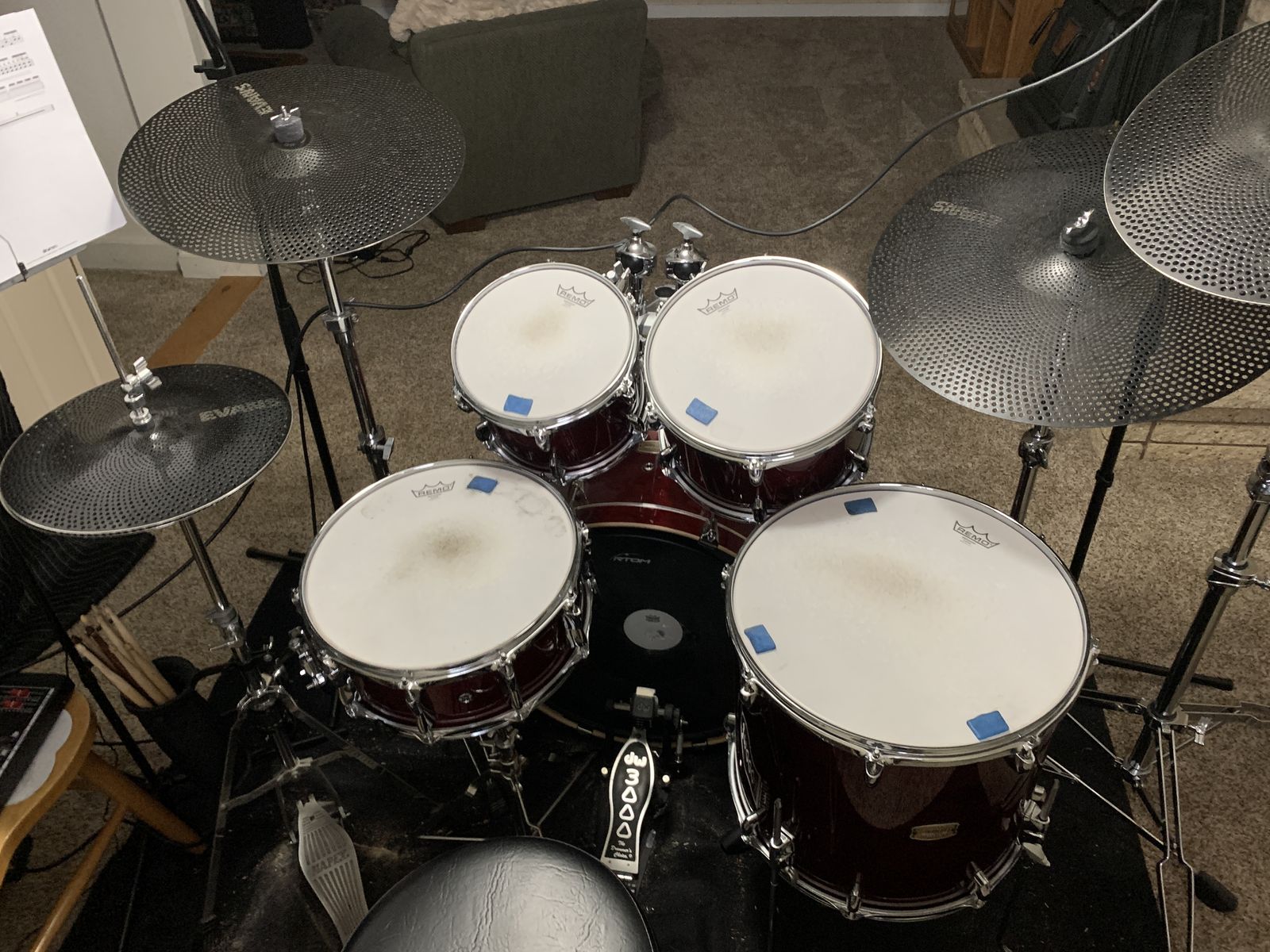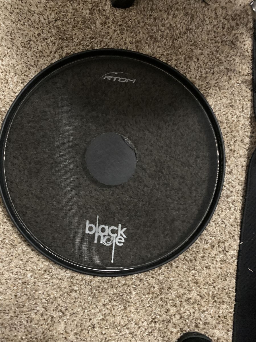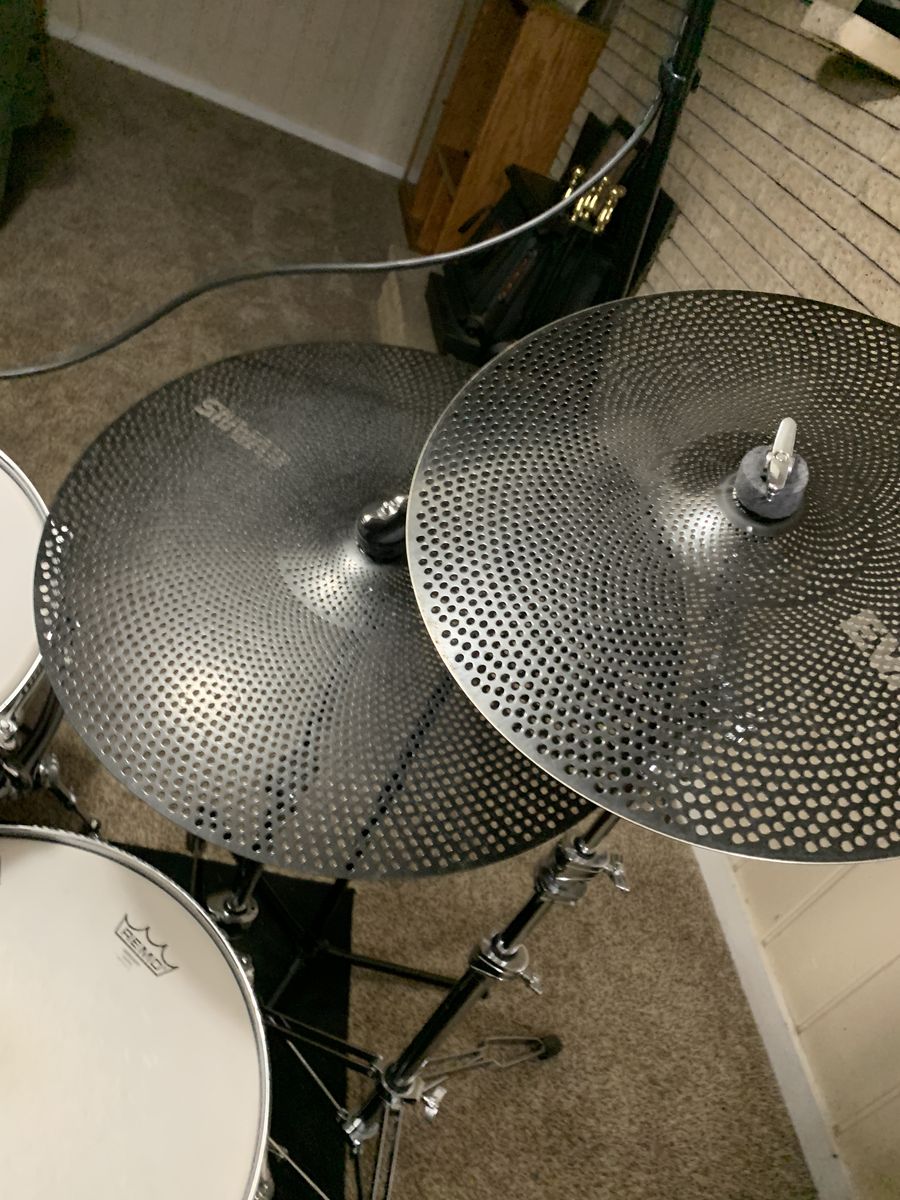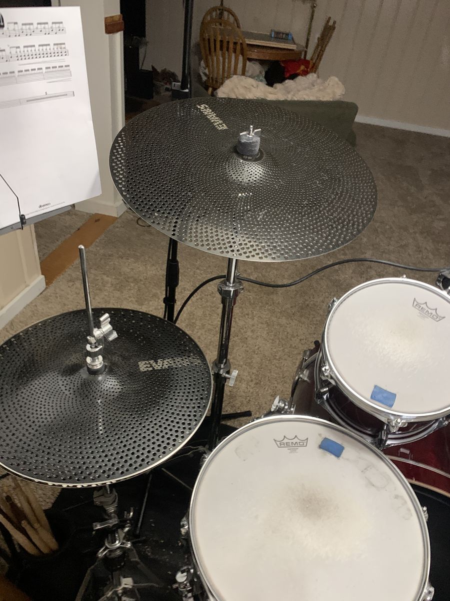 I also have an aluminum Mapex 14" snare, two different 13" toms, a 16" inch floor tom and extra heads, a stick holder and some sticks, a mat, and Evans dbone quiet heads in 22", 14", 16" and 13".