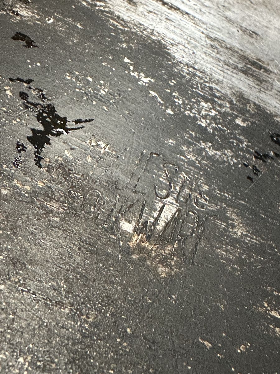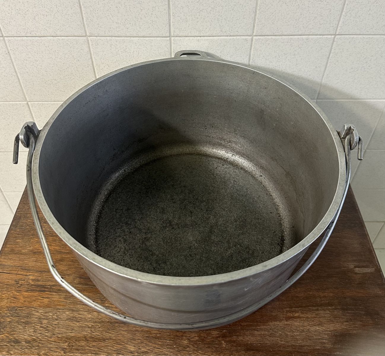 6 quart capacity. Good preloved condition. No dents. Pot and knob show character from normal stove and oven use. Bail is somewhat out of shape however, this does not affect strength or function.