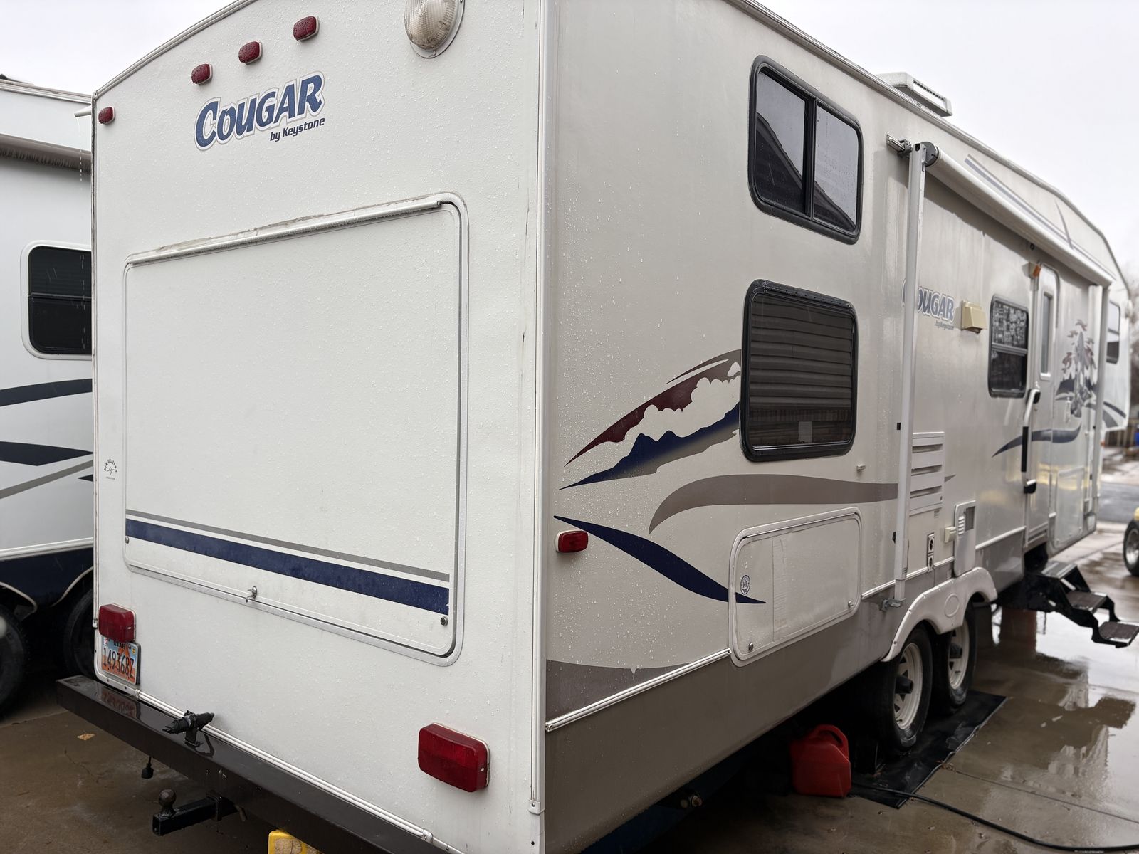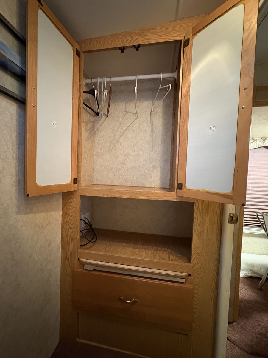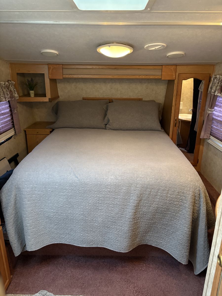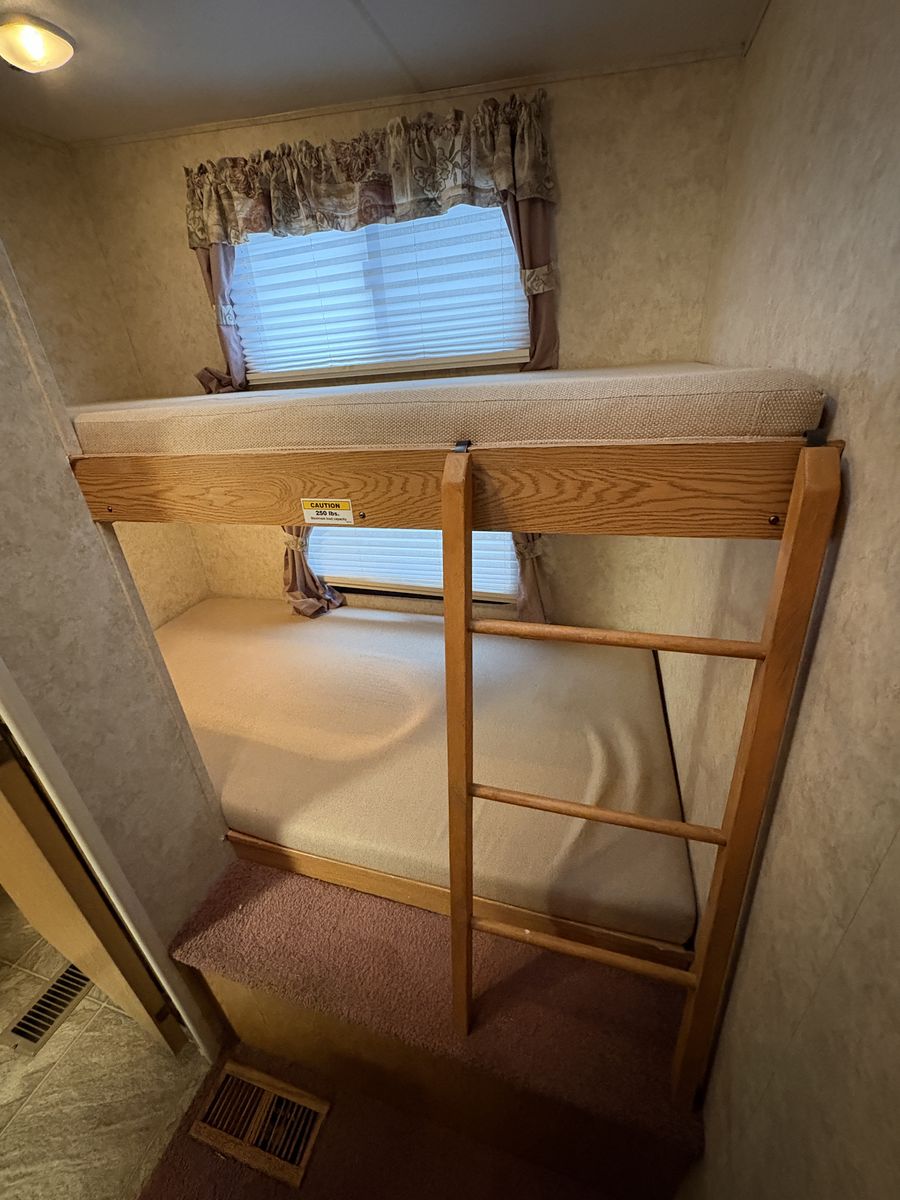 2005 Keystone Cougar 281EFS 5th wheel trailer. Queen mattress. Normal mattress, not the usual RV mattress. Bunkhouse. Reclining leather couch. Updated kitchen table. Polar package. Includes enclosed/heated underbelly and extra insulation in the floor and roof. Solar panel with inverter. King Tv antenna. Rear “garage” for extra storage. Tires are only a few years old and in good condition. Everything is in good working condition.