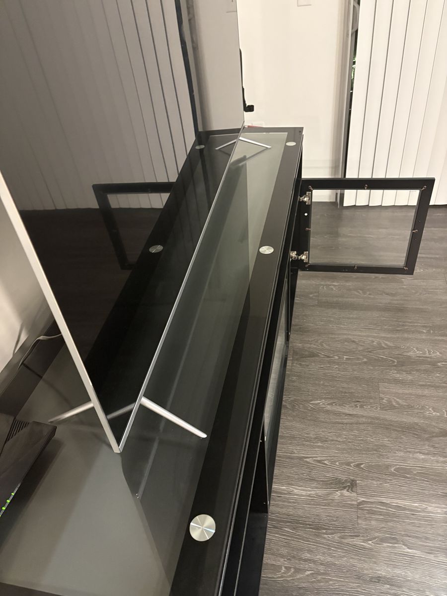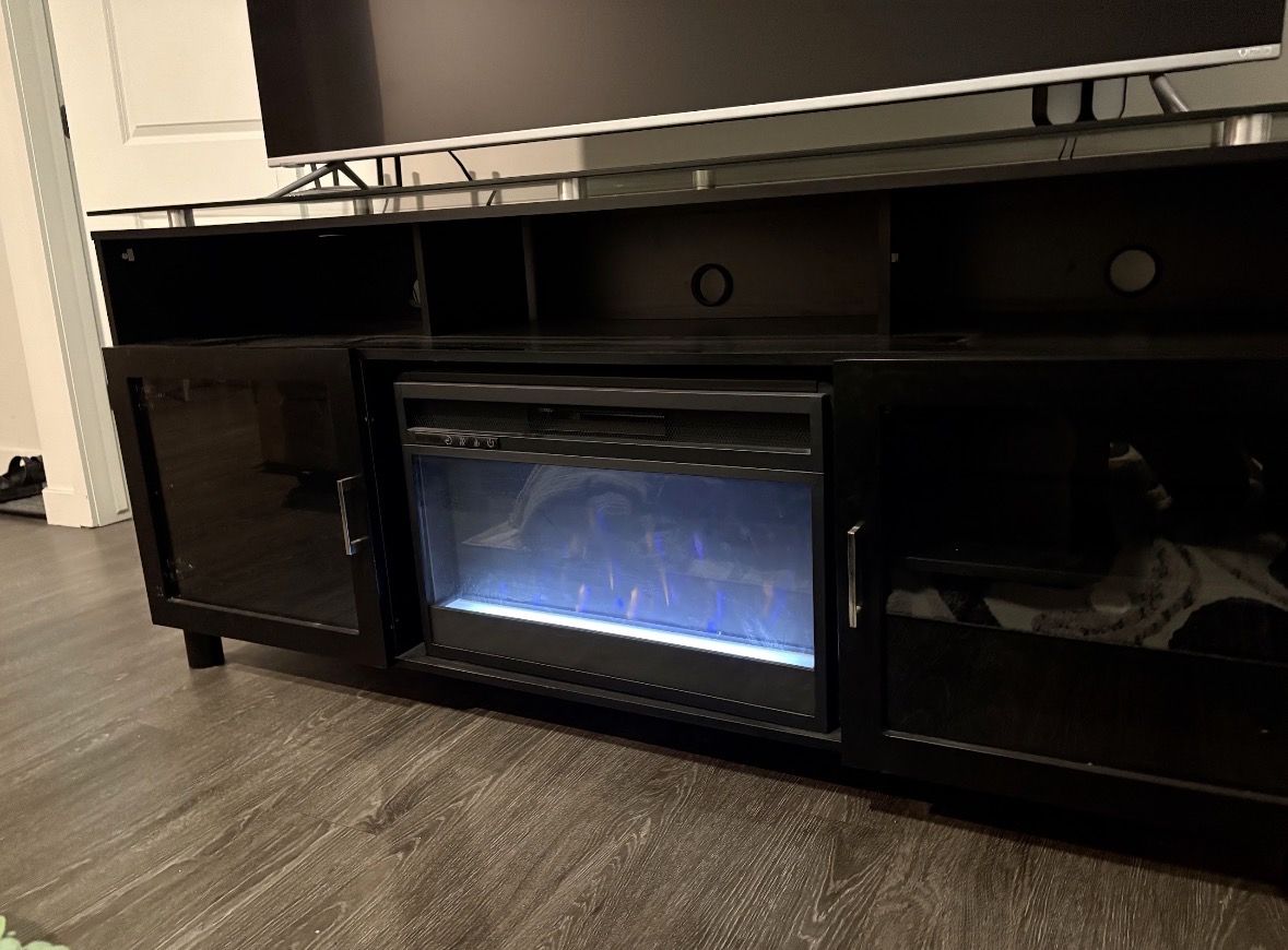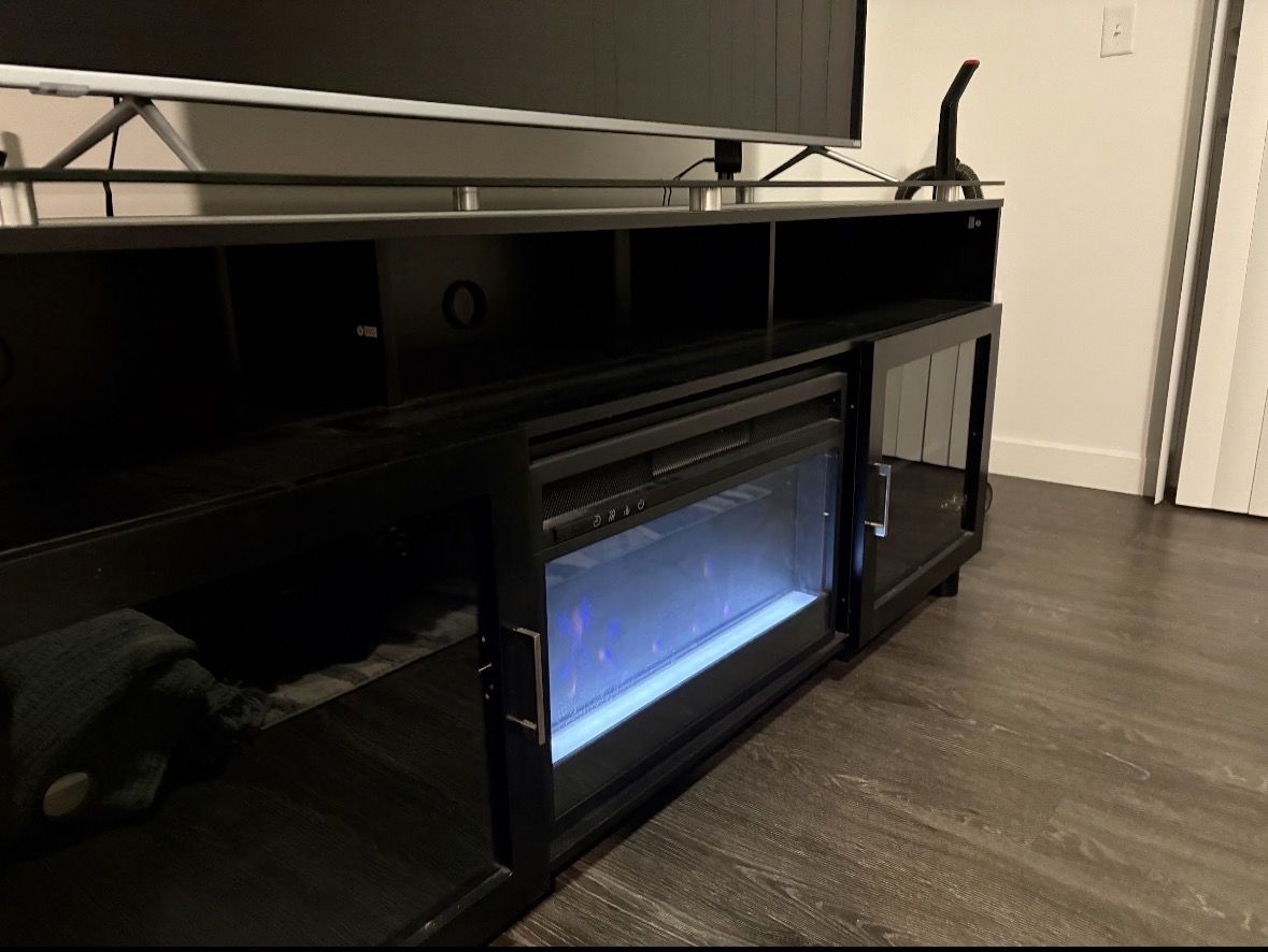 VenmoGlass tv stand with a fireplace