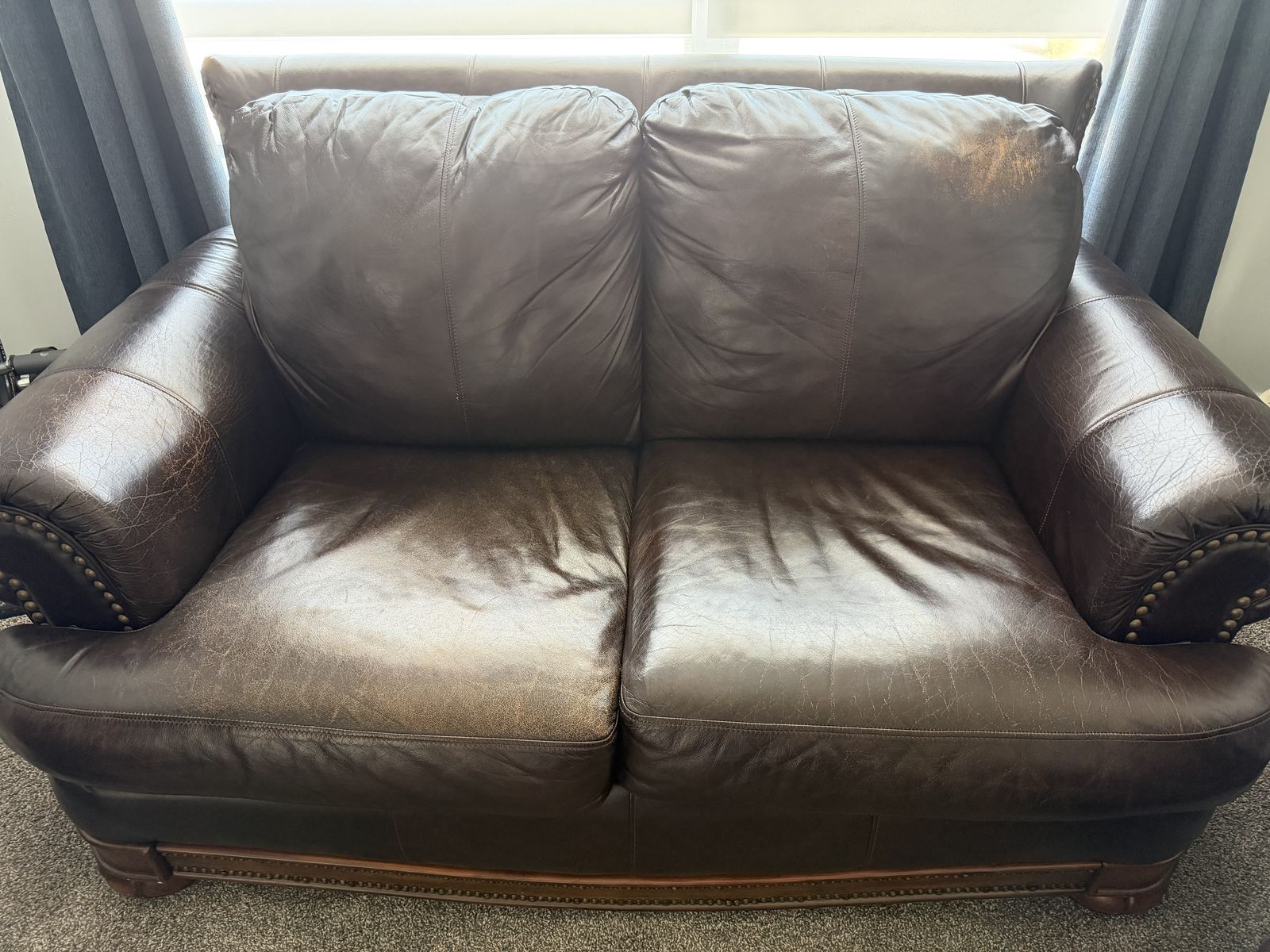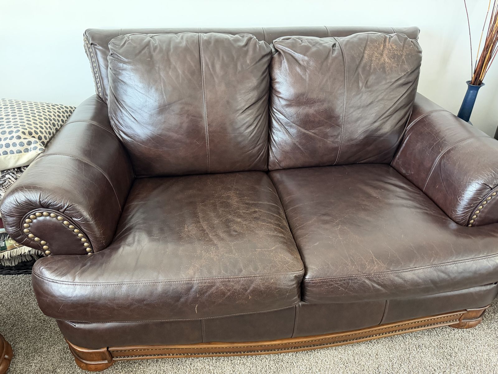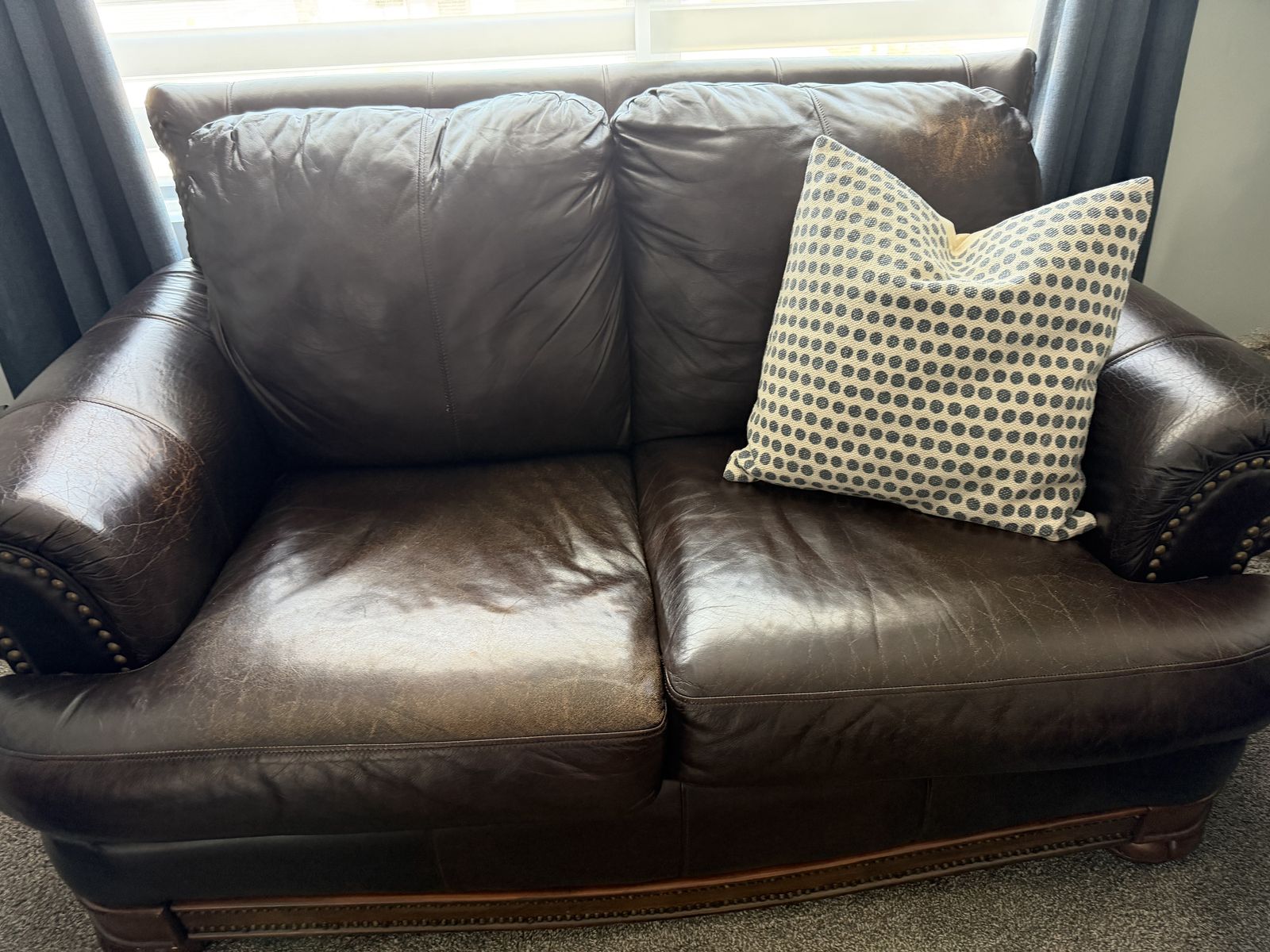 VenmoHave 2 Classic brown leather loveseats. $150 ea or both for $250. Has cool nailhead trim on the arms and a wood base. Great for a cozy spot. Non-smoking home. Has no rips or tears but has a few worn looking spots.