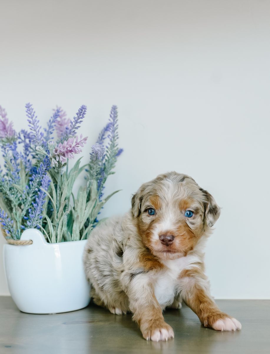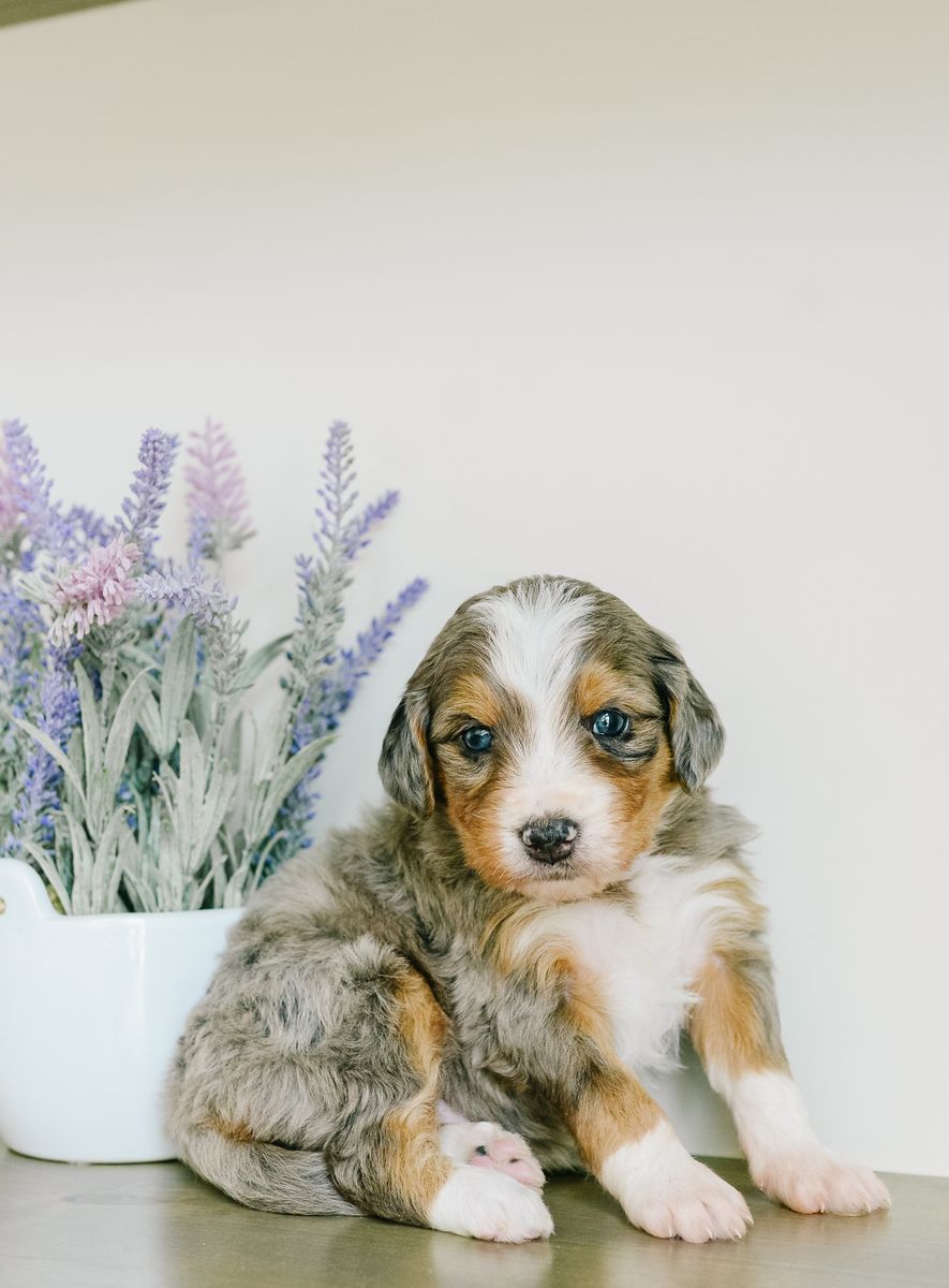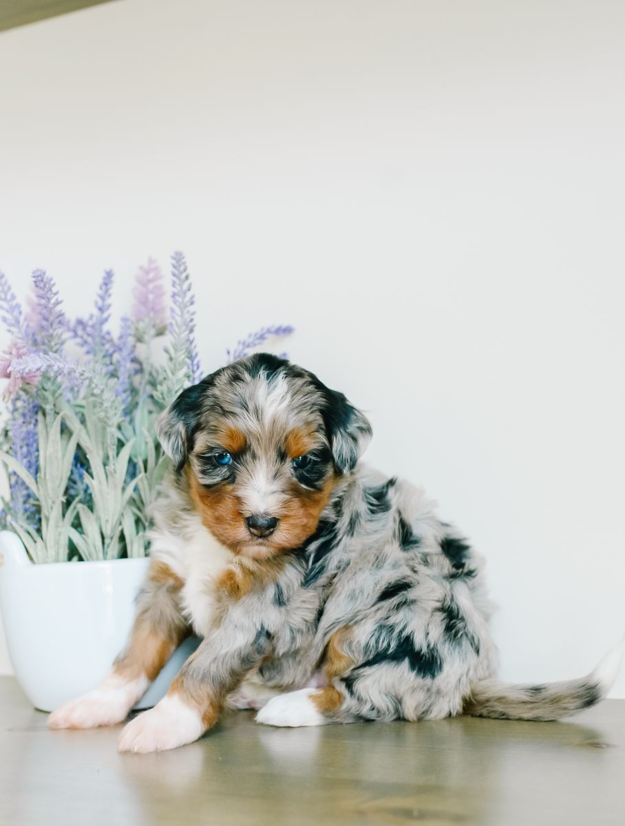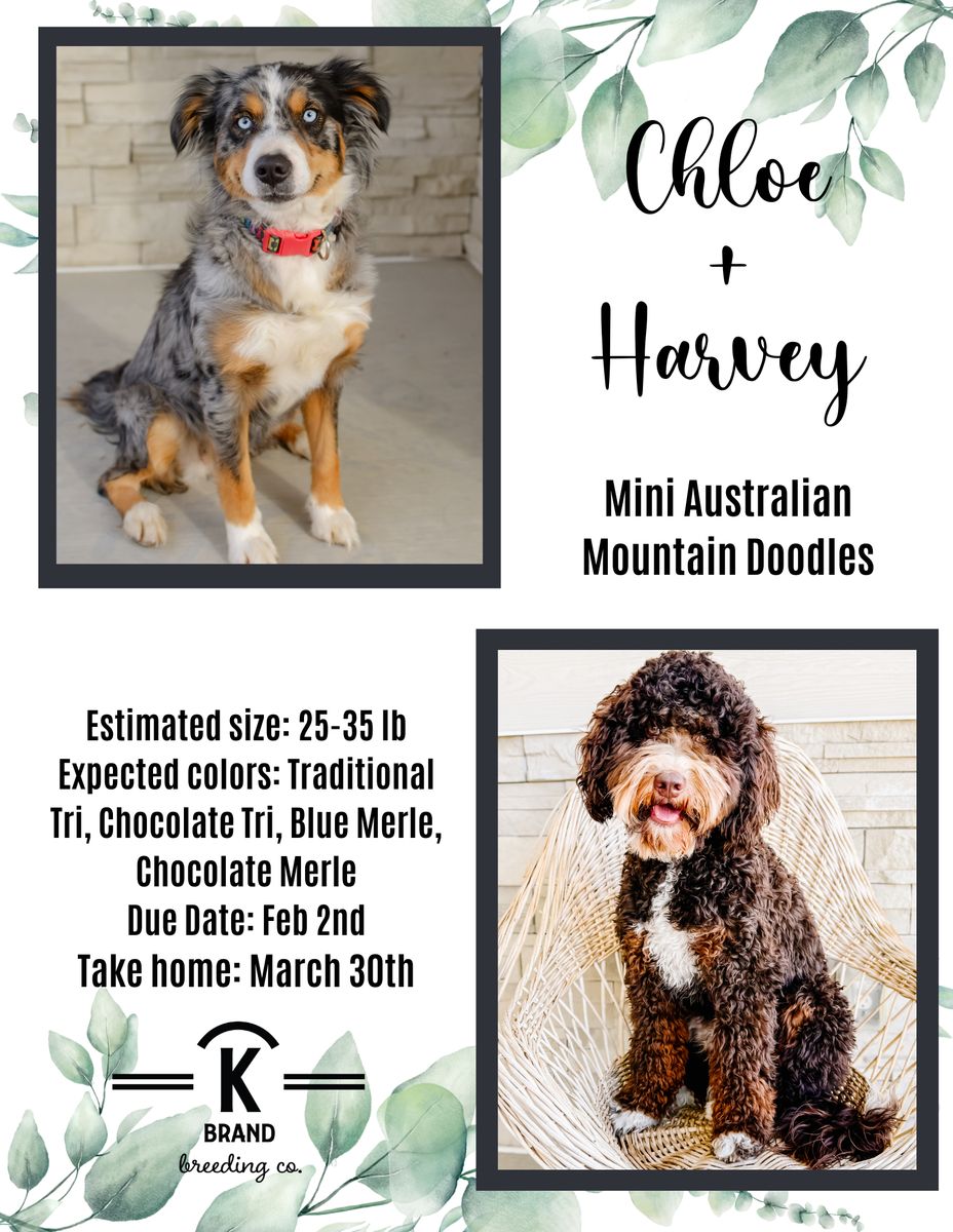 ApplePayMeet our stunning Chloe x Harvey litter of Mini Australian Mountain Doodles. Why choose between a gorgeous puppy and a phenomenal temperament when you can have both?! These puppies will be furnished and hypoallergenic, with soft wavy coats. They are estimated to be 25-35 lb full grown. They will be ready to go home the last week of March. At K Brand Breeding Co., we get our puppies off to the best start possible for a seamless transition to their new home and family. They will have a good start to crate and potty training, first round of shots, dewormed every two weeks and vet checked before they go home with you. They have all kinds of attention and socialization including early neurological stimulation from day 3-14. They go home with a fun little swag bag that includes a mamas scent blanket, toy, ball, bandana, training treats, small bag of food, plus vet paperwork and a year health guarantee. Call or text any time for more information! You can also check out our website at kbrandbreedingco.com