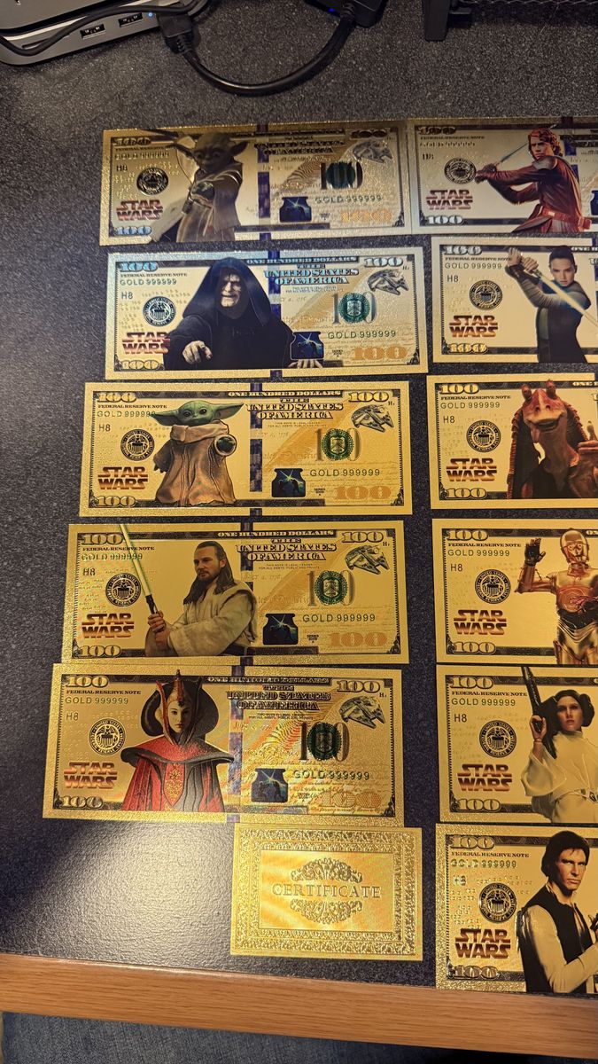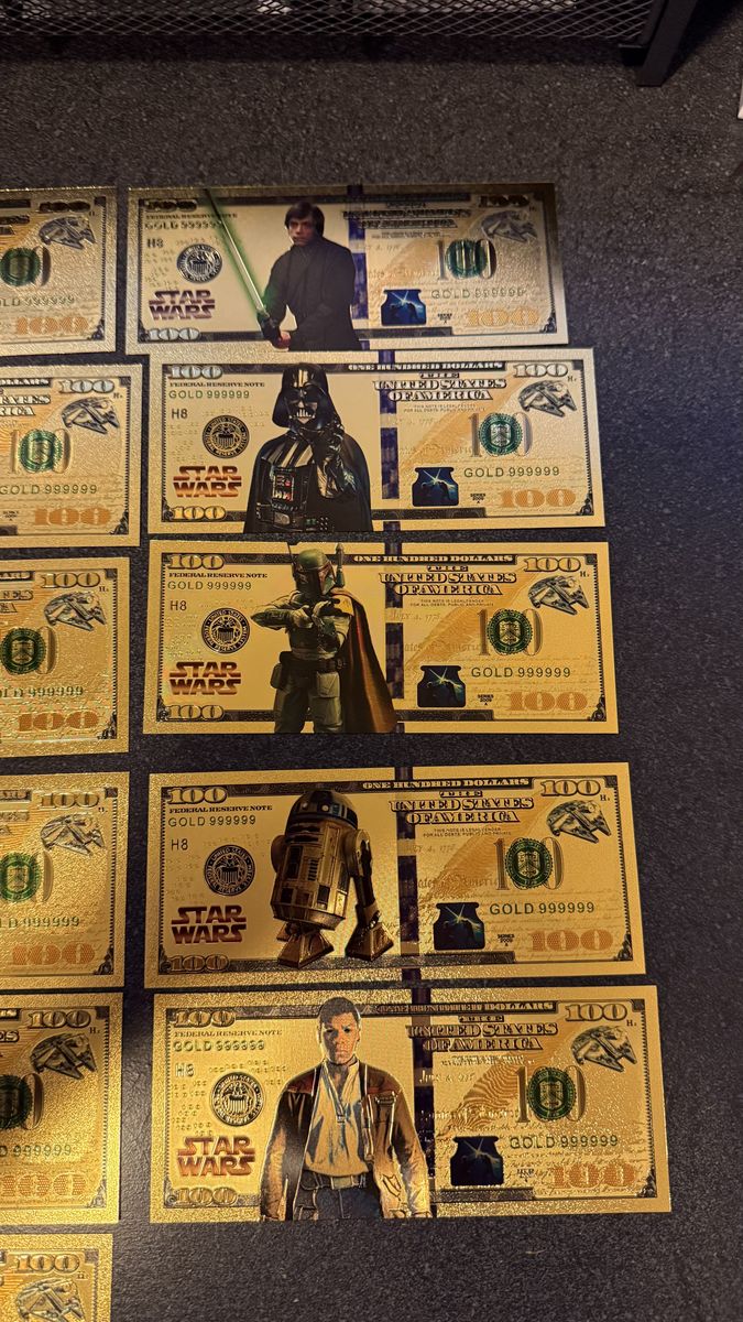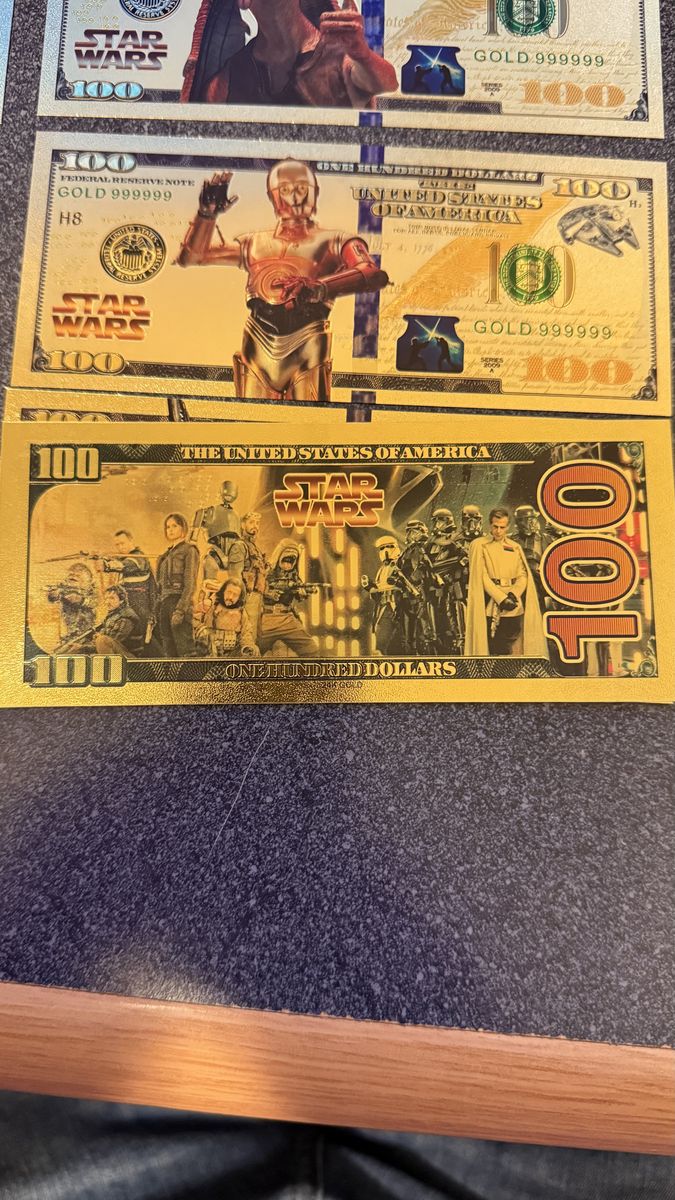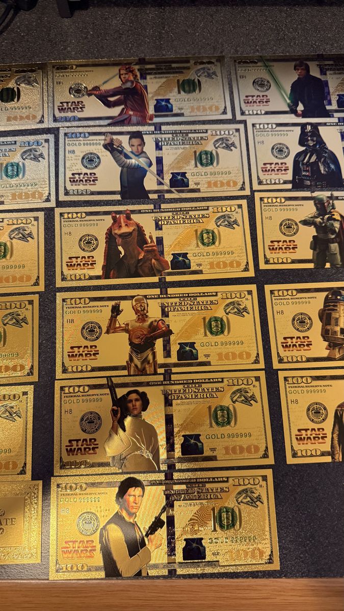 VenmoBrand new shiny collectible Star Wars 24kt Gold set of $100 bills. This bills aren’t just a great addition to the collection but also have value being gold plated. All the main characters here. Please reach out on this great set. Willing to help meet up for delivery.