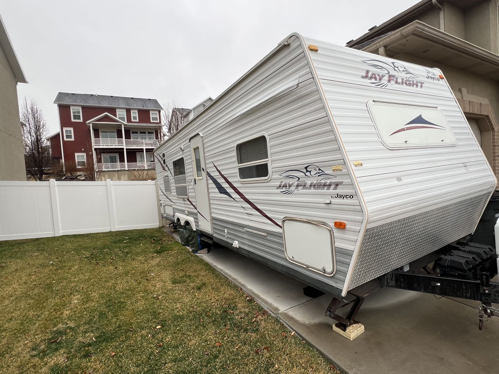 PayPalLength: 27 ft Sleeping Capacity: Up to 8 Layout: Front queen bed, rear bunk beds (single over double), convertible dinette, and jackknife sofa Bathroom: Full bathroom with tub/shower Kitchen: 3‑burner stove, oven, microwave, double sink, and plenty of storage A/C & Heat: Both in great working condition No awning Construction: Jayco’s quality build with strong cabinetry and solid structure