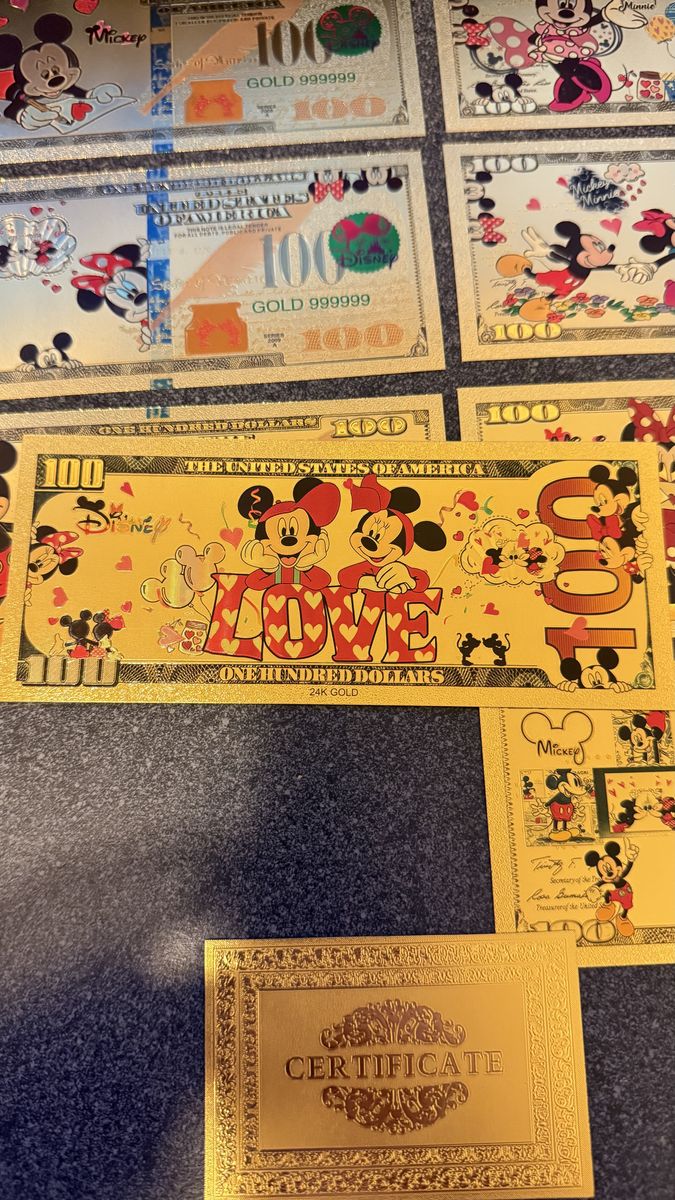 VenmoDiamonds and Gold say love and nothing better looking than these shiny $100 Bills. Set of 8 bills with varying scenes of Mickey & Minnie. These are a must have in any Mickey & Minnie Collection. Willing to help with delivery.