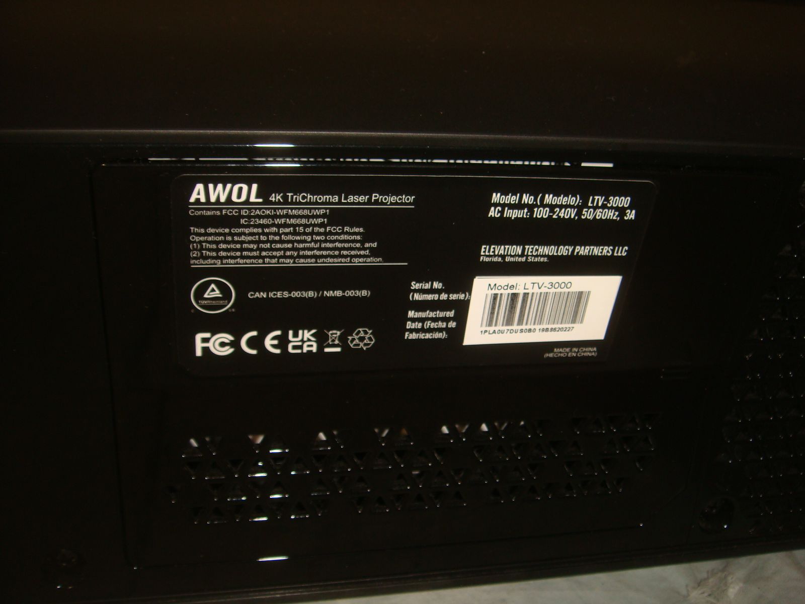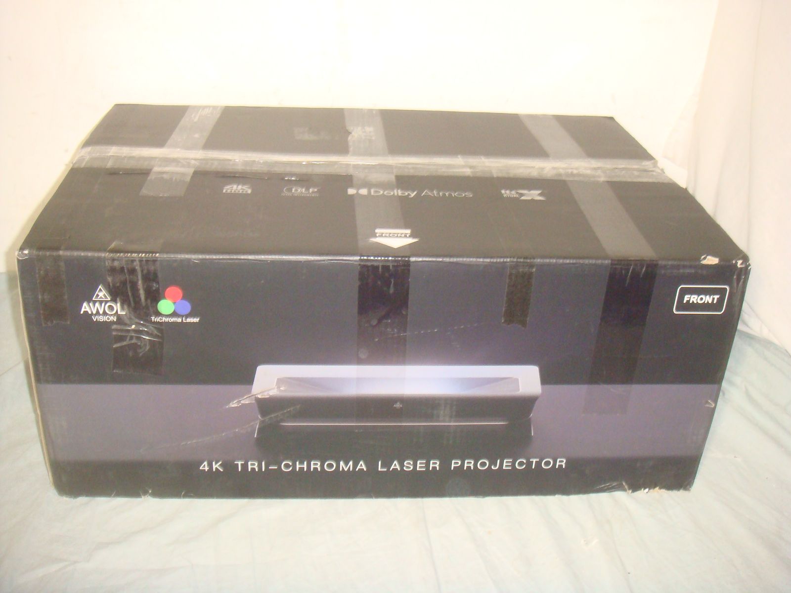 AWOL VISION LTV-3000 PRO 4K ULTRA SHORT THROW TRI-CHROMA TRIPLE LAZER PROJECTOR. This is a lightly used projector that has some minor surface marks/signs of use, but that's in overall excellent condition! It works perfectly and displays a bright beautiful picture from super close! It comes with everything shown. This is your chance to save big-time so don't miss out!!