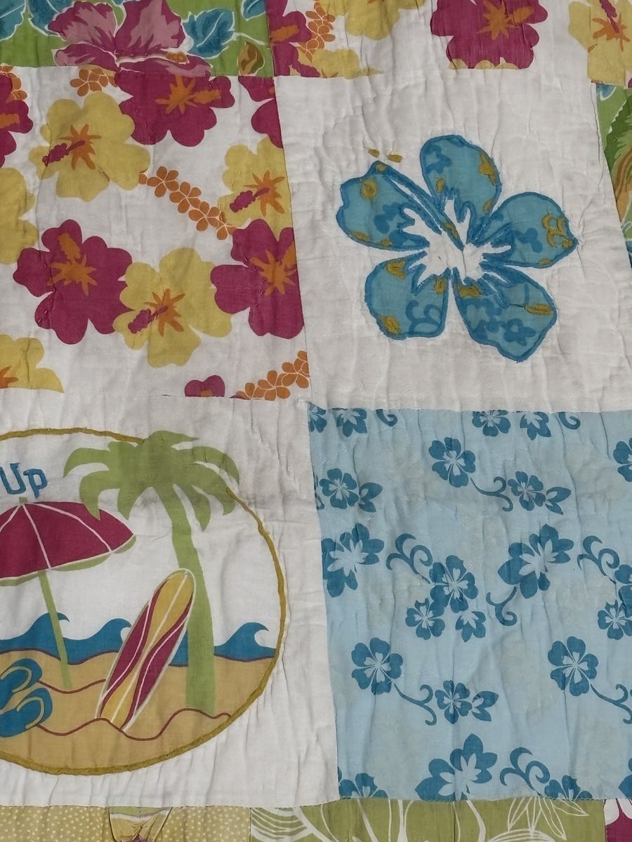 The reversible Spring quilt is a vibrant patchwork design made of various square fabric blocks arranged in a grid. It features a colorful floral theme with: Patchwork layout: A mix of green, yellow, red, blue, and white squares with different floral patterns. Accent: Pink flip-flops, (one flip-flop is broken) and three squares have circular beach-themed prints (umbrella, palm tree, and “Beach Life” text). Border: A teal inner border surrounds the patchwork, framed by a magenta outer border. Large Throw Dimensions: 72” x 84” No advance payment Payment and pick up are at the same time.