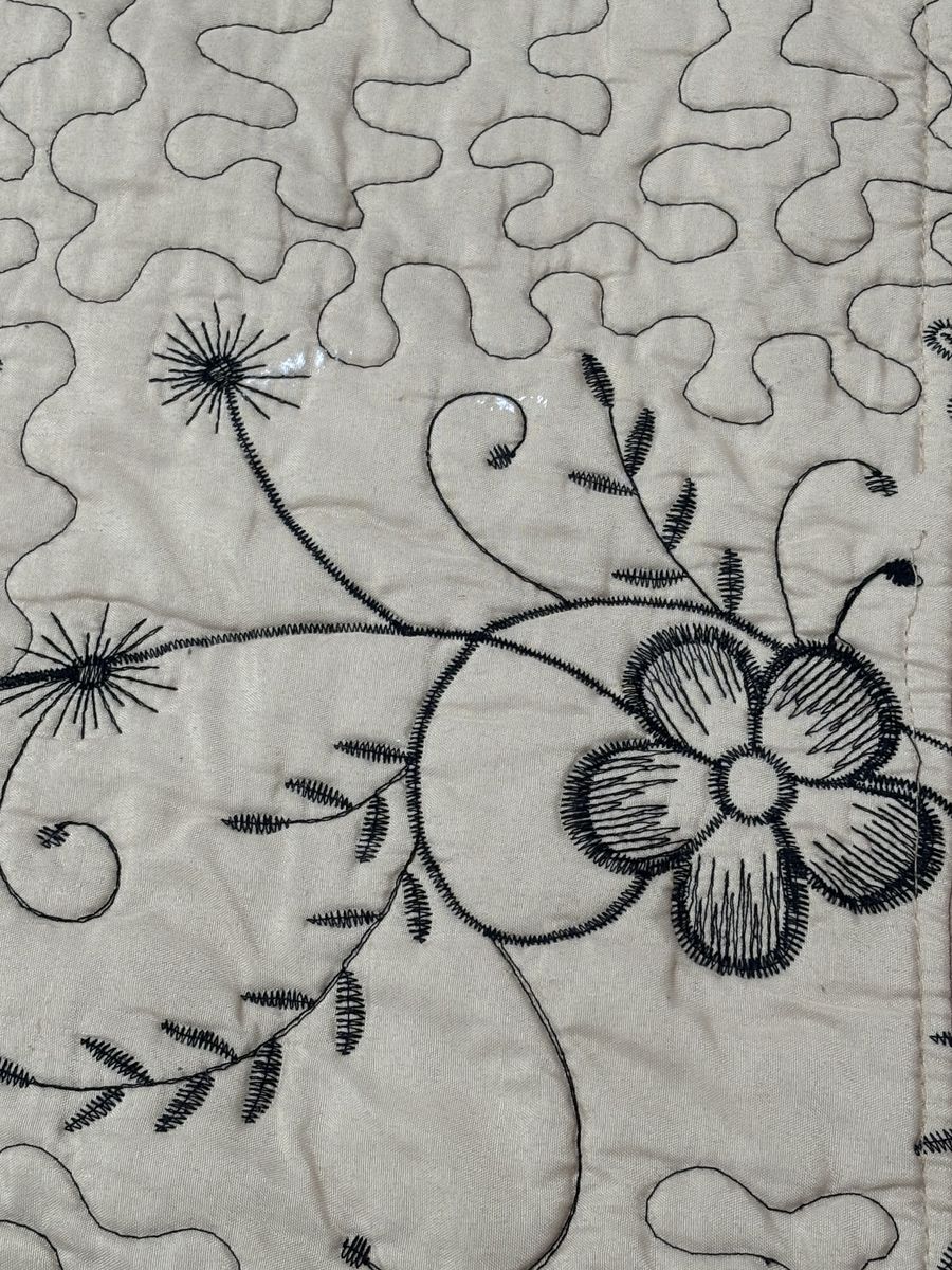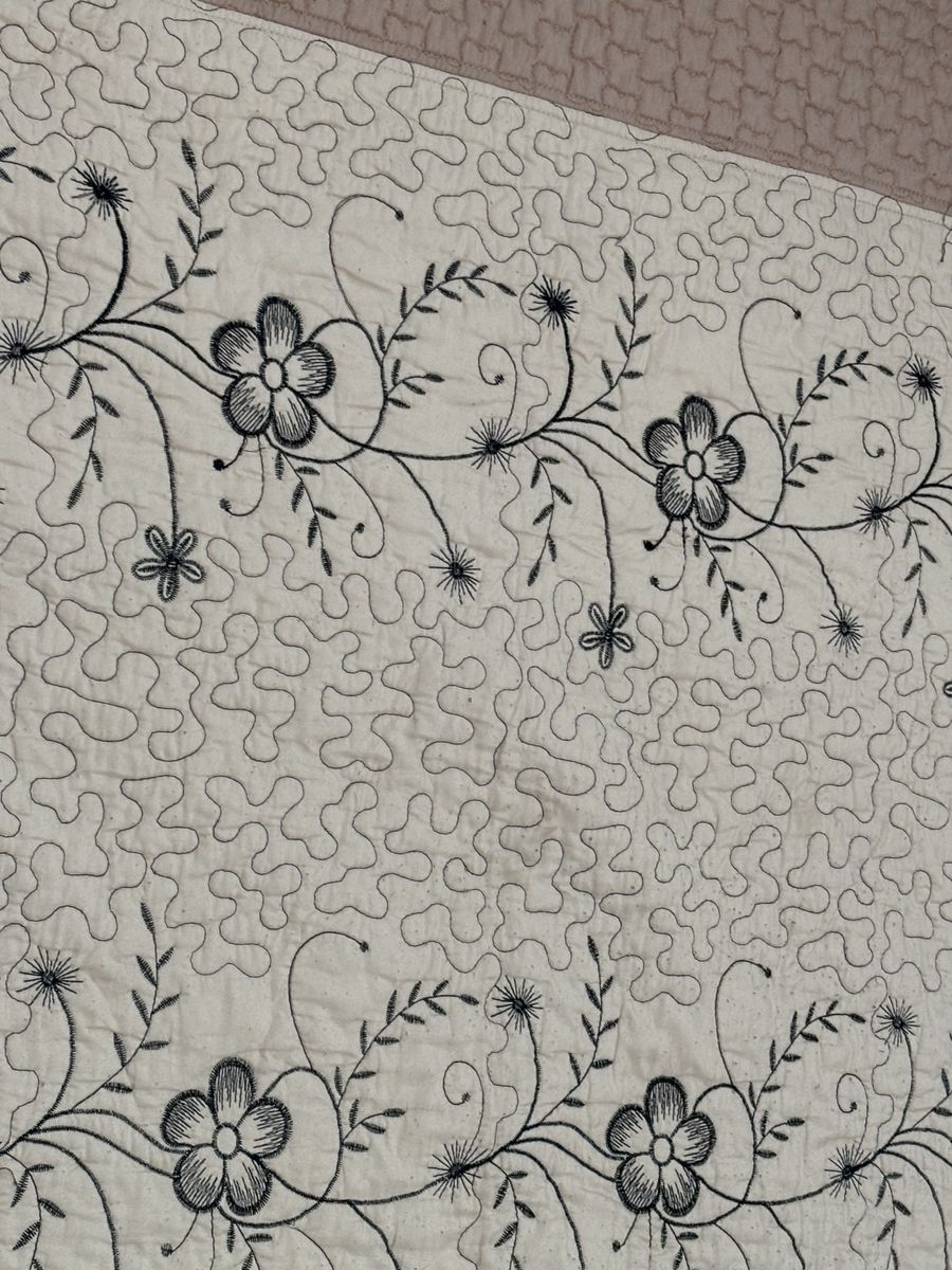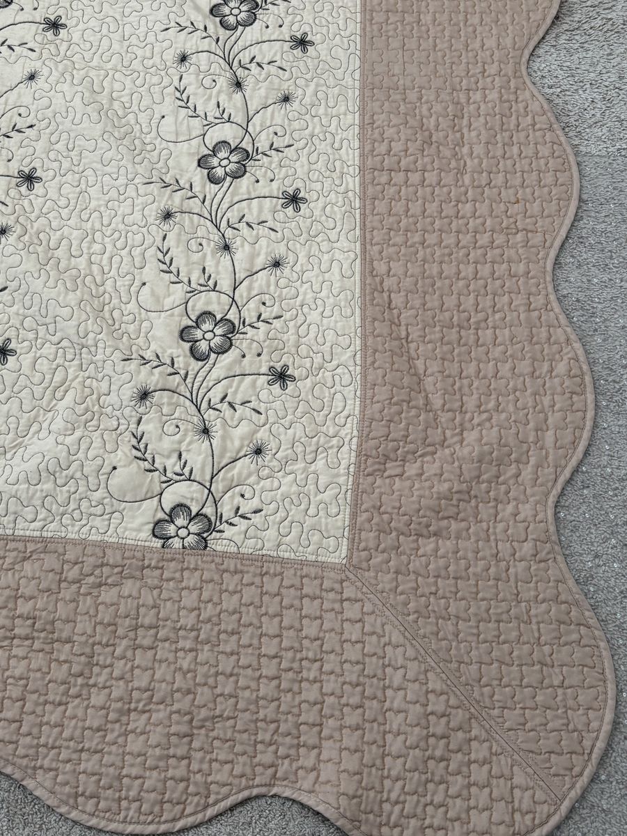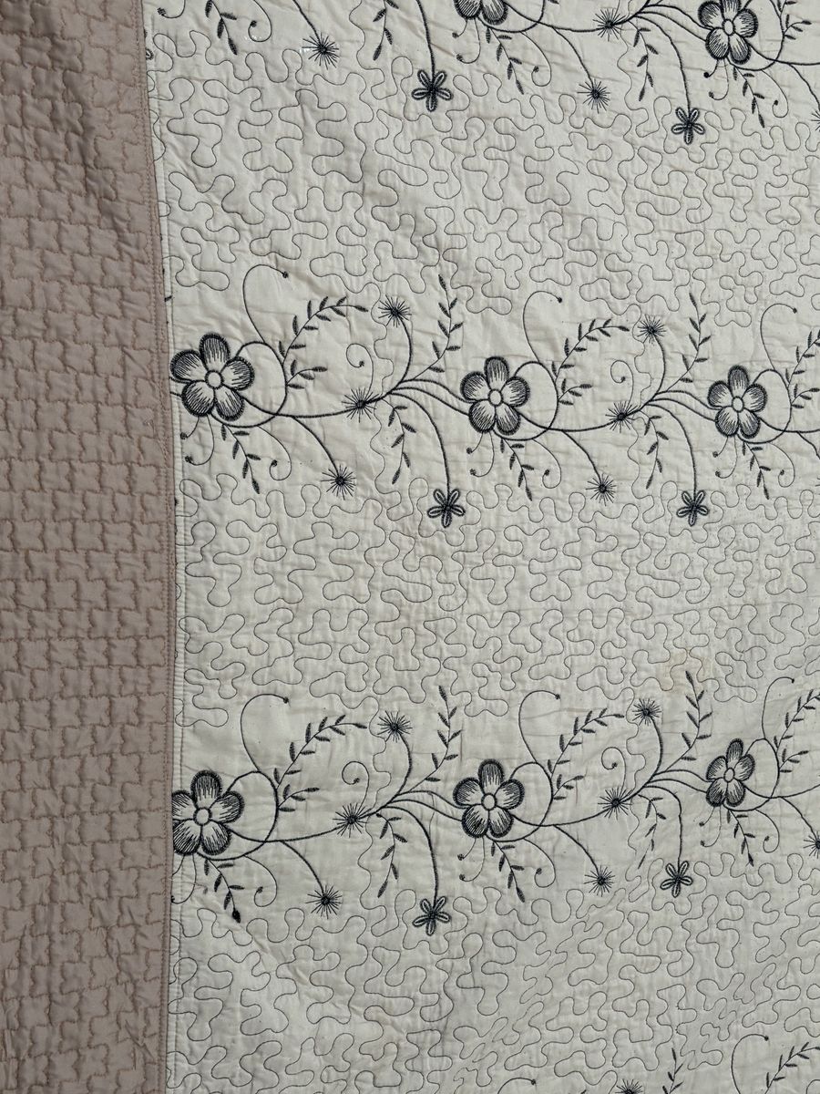 Elegant vintage quilt set, cream floral‑embroidered center, pink scalloped border, matching pillow sham, cozy, decorative, antique‑style home accent. Vintage‑style quilt set with a cream center panel embroidered with elegant black floral vines and subtle gray detailing, bordered by a soft dusty‑pink scalloped quilted backing. Includes a matching pillow sham with the same floral design and pink edge. The set offers a cozy, decorative touch for rustic or antique‑loving home décor, perfect for bedding or display. NOT reversible. The inside has a stain. Size:Queen No advance payment Payment and pick up are at the same time